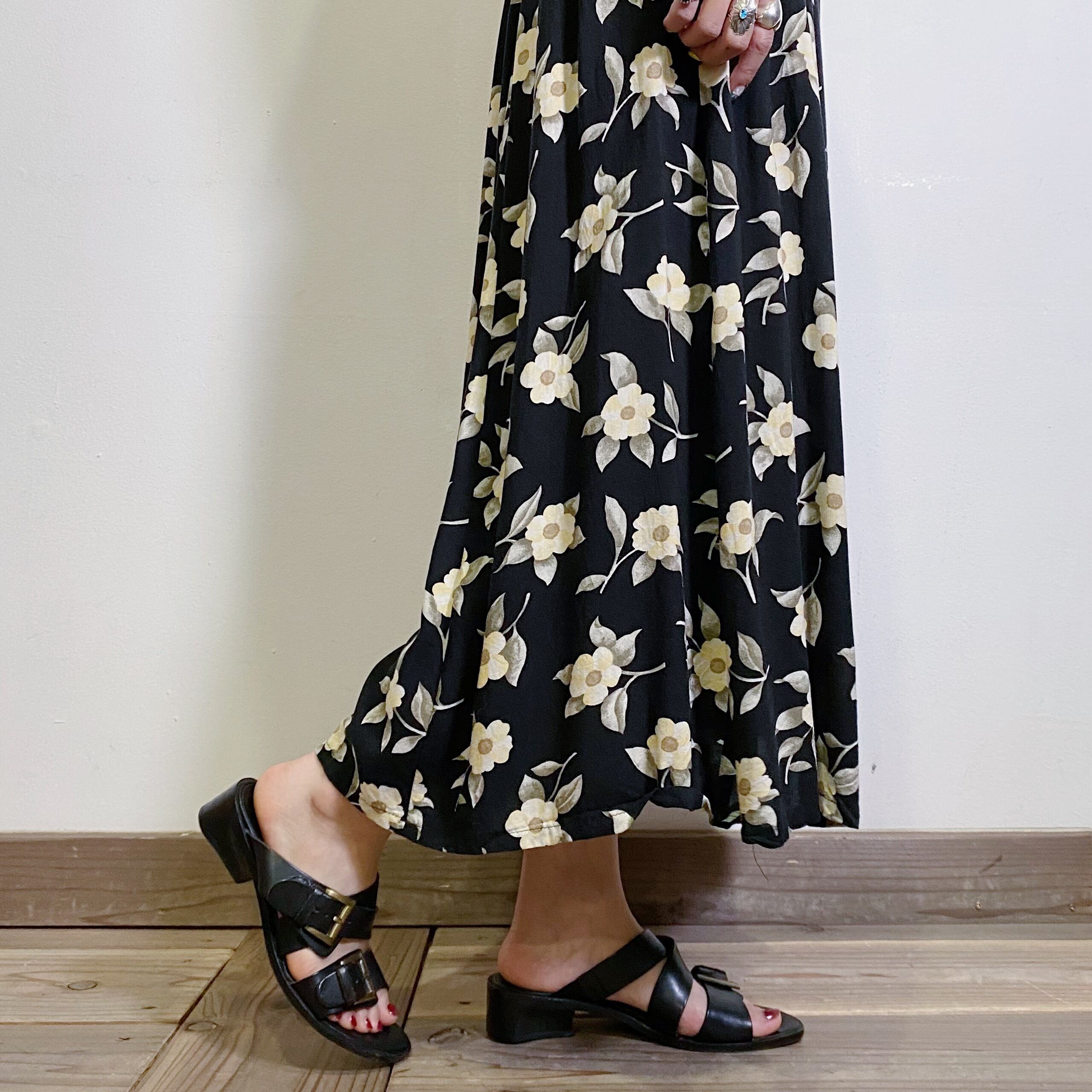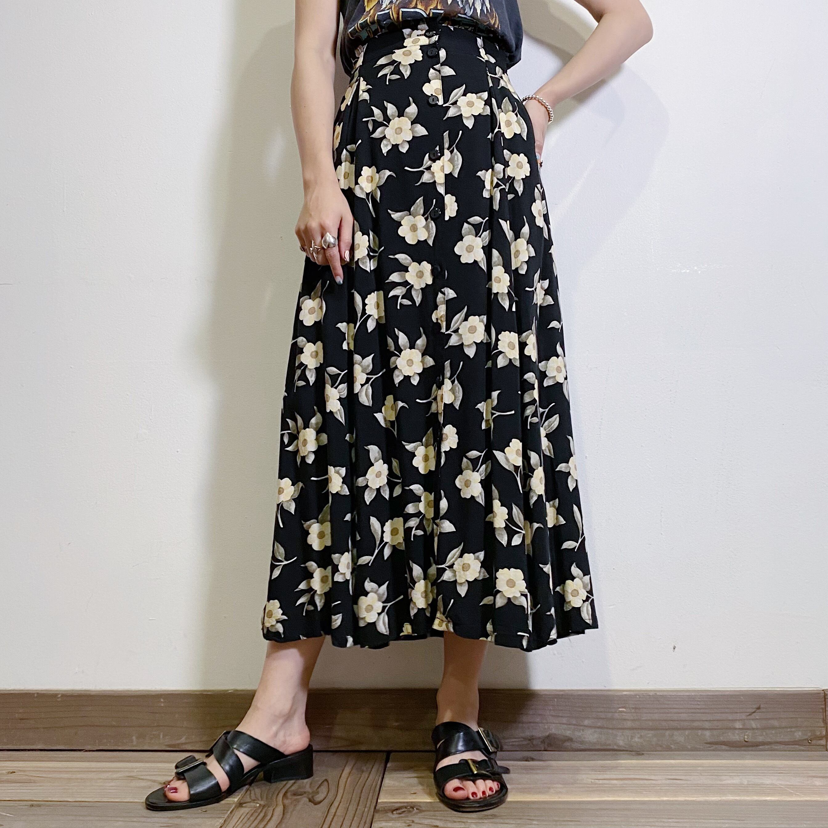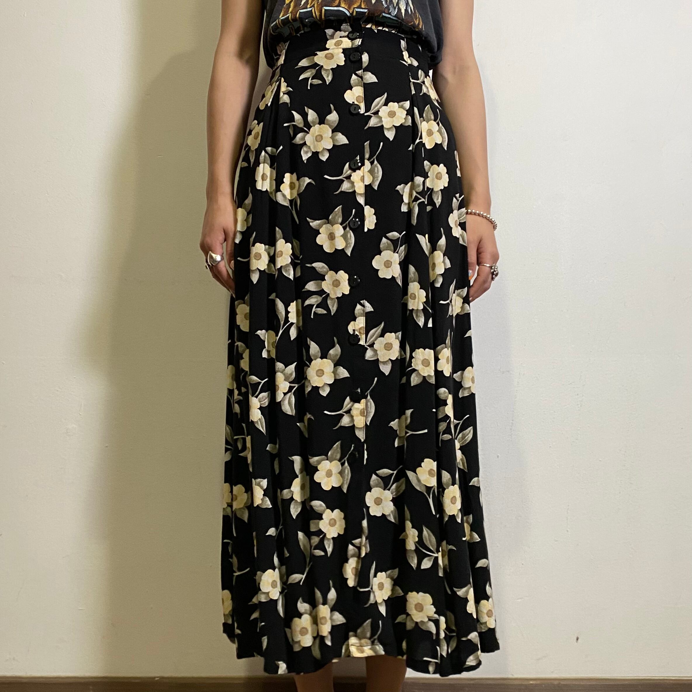 黒地にベージュの花柄が可愛い、レーヨン素材のロングスカートです。