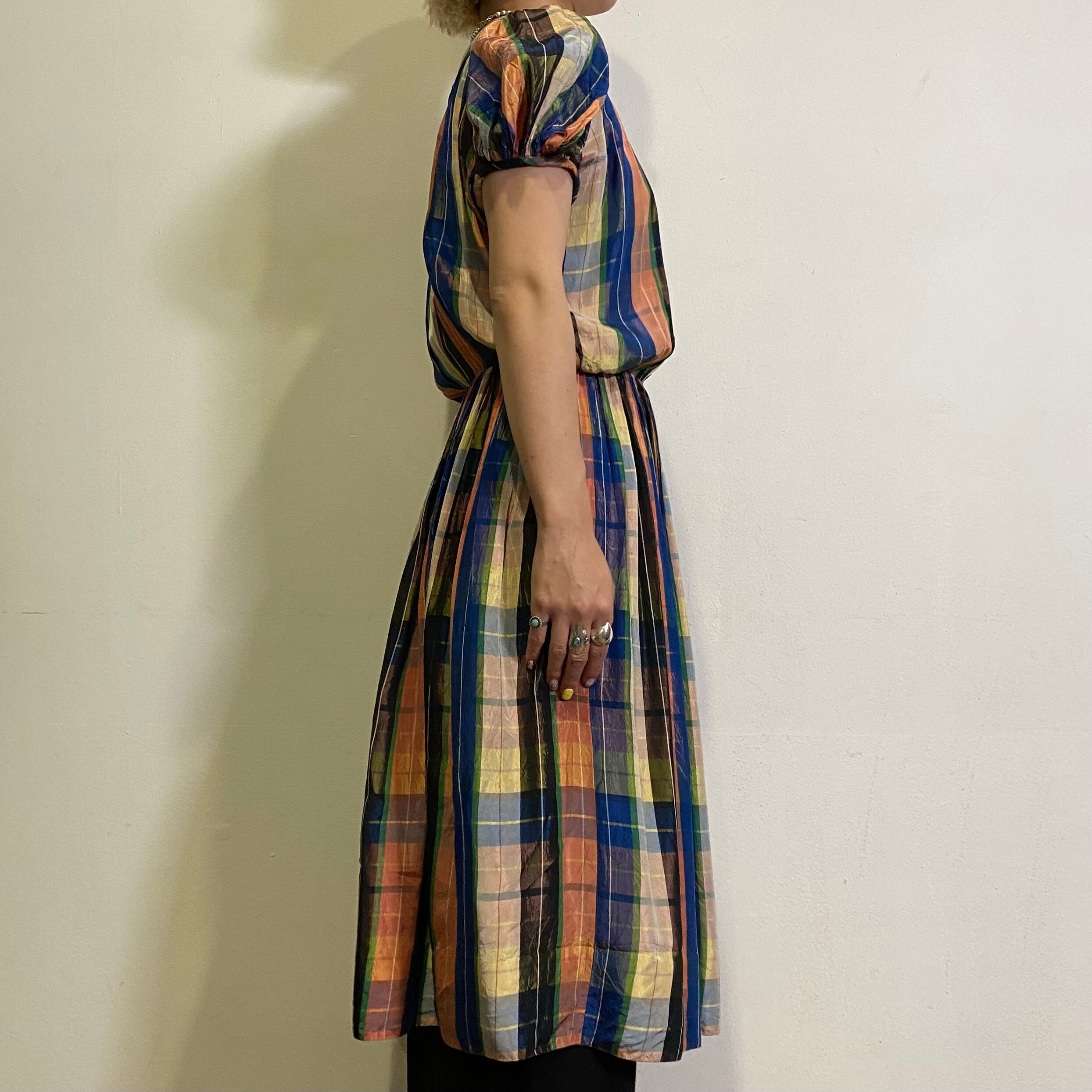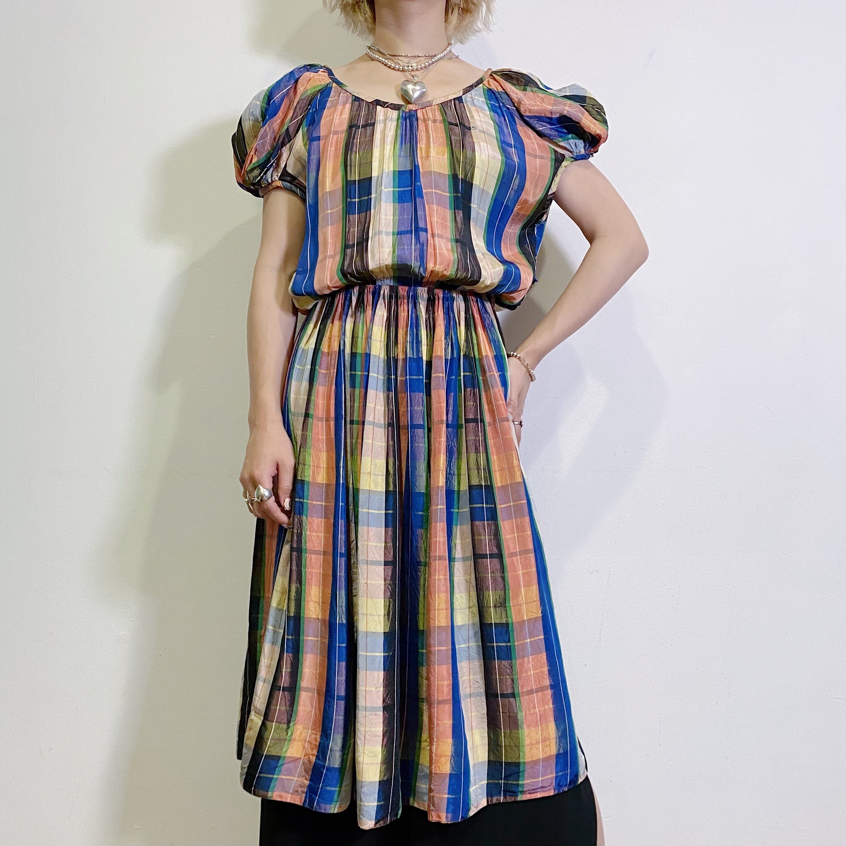 ピーチカラーやブルーの色合いのチェック柄が可愛い、50年代のワンピースです。