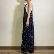ネイビーベースに黄色や青の小花柄が可愛い、レーヨン素材のジャンパーワンピースです。