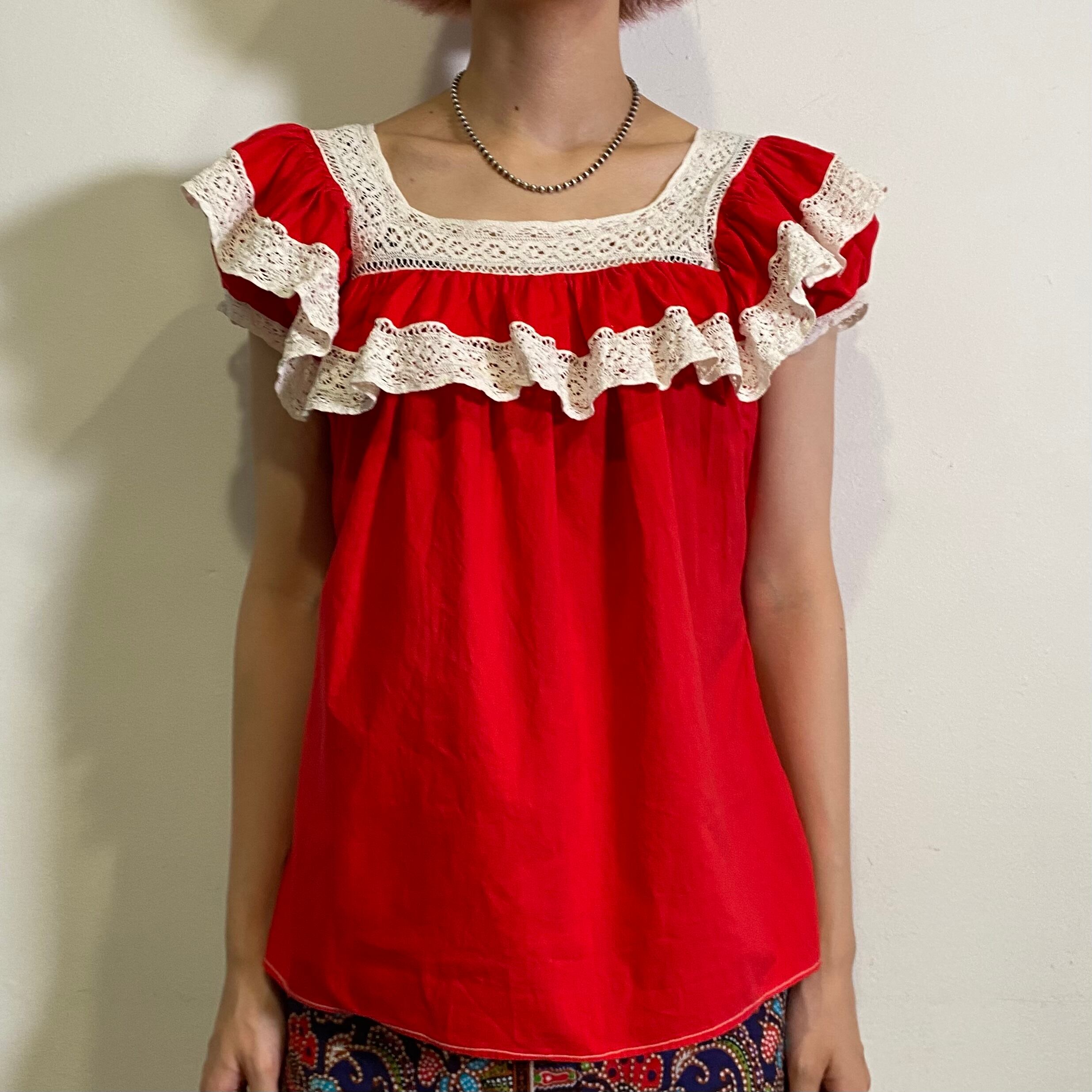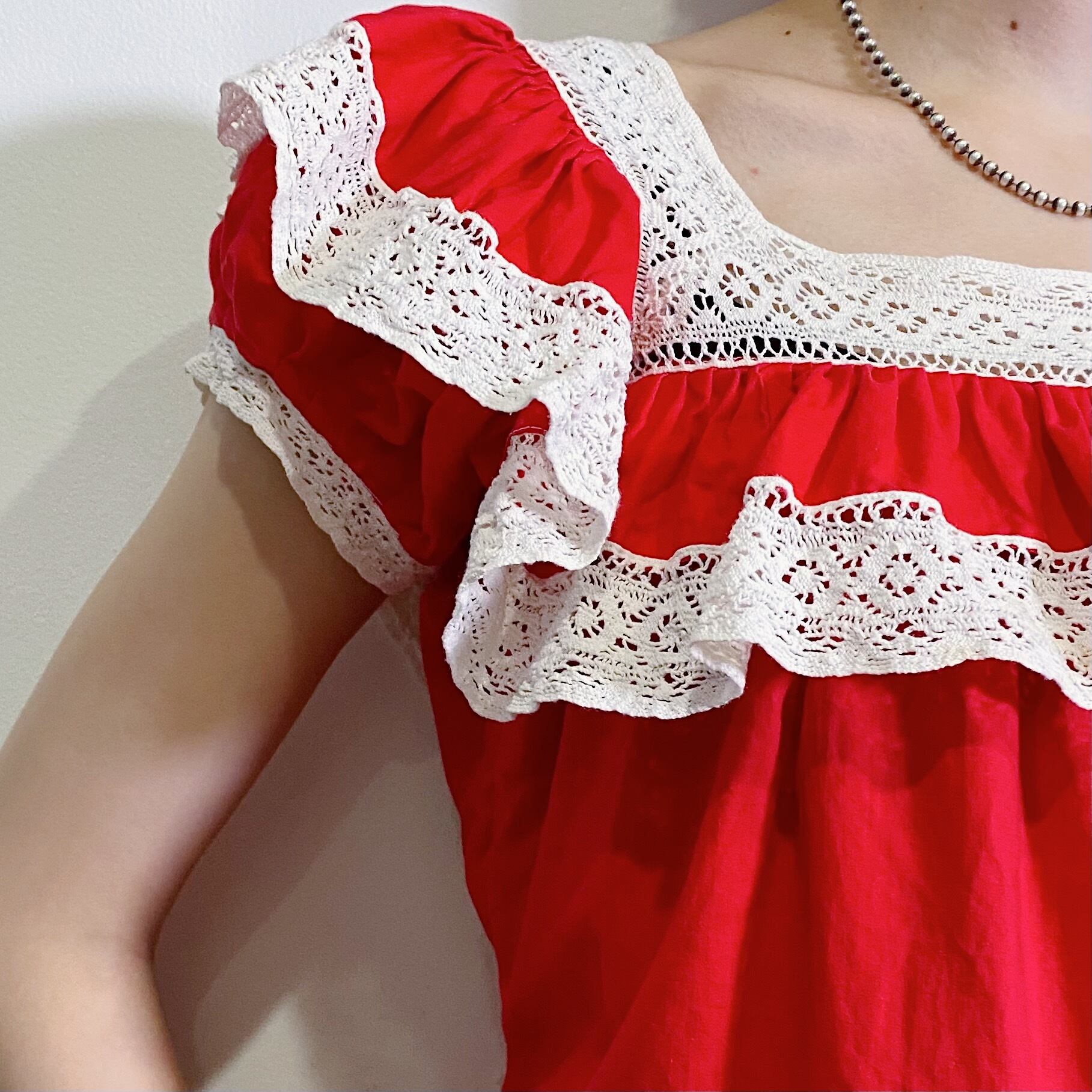 ぱっきりレッドに白いレースが可愛い、70年代ころのメキシコチュニックです。