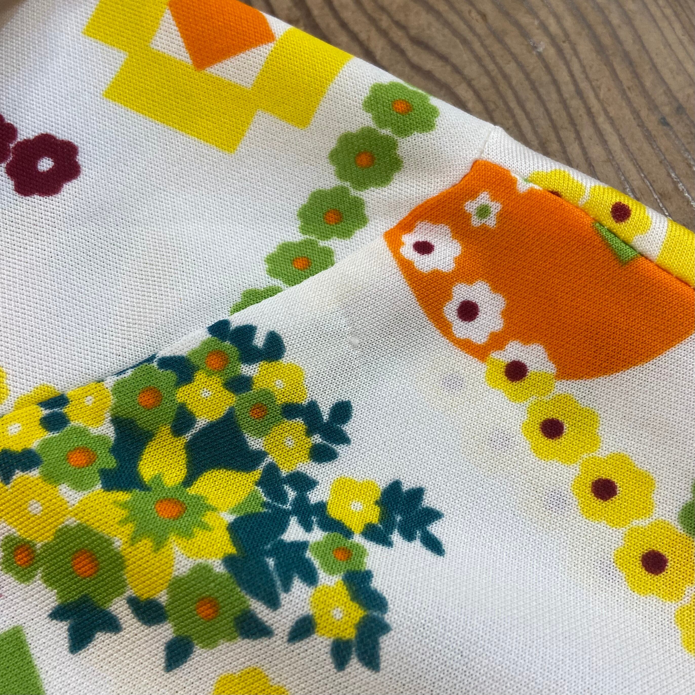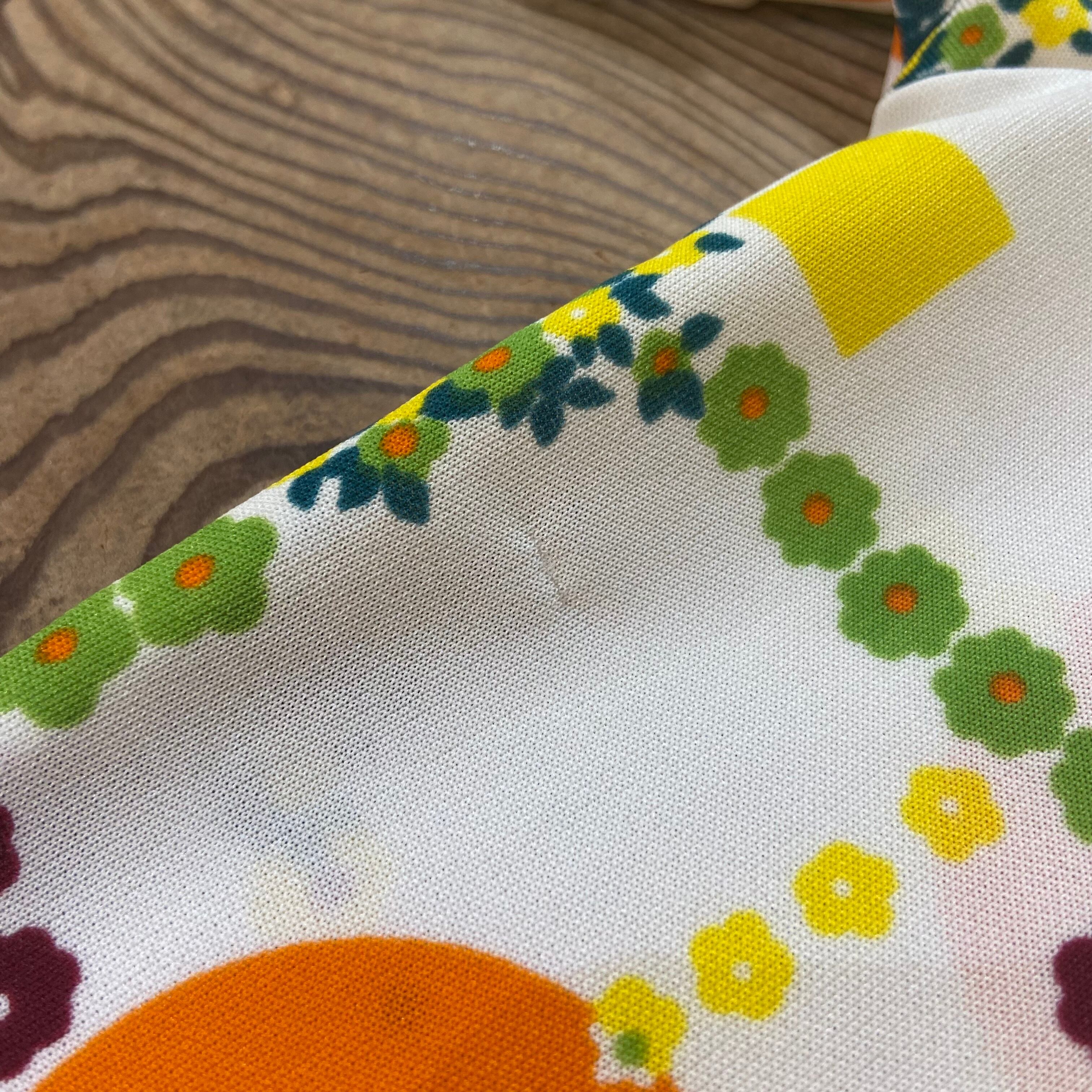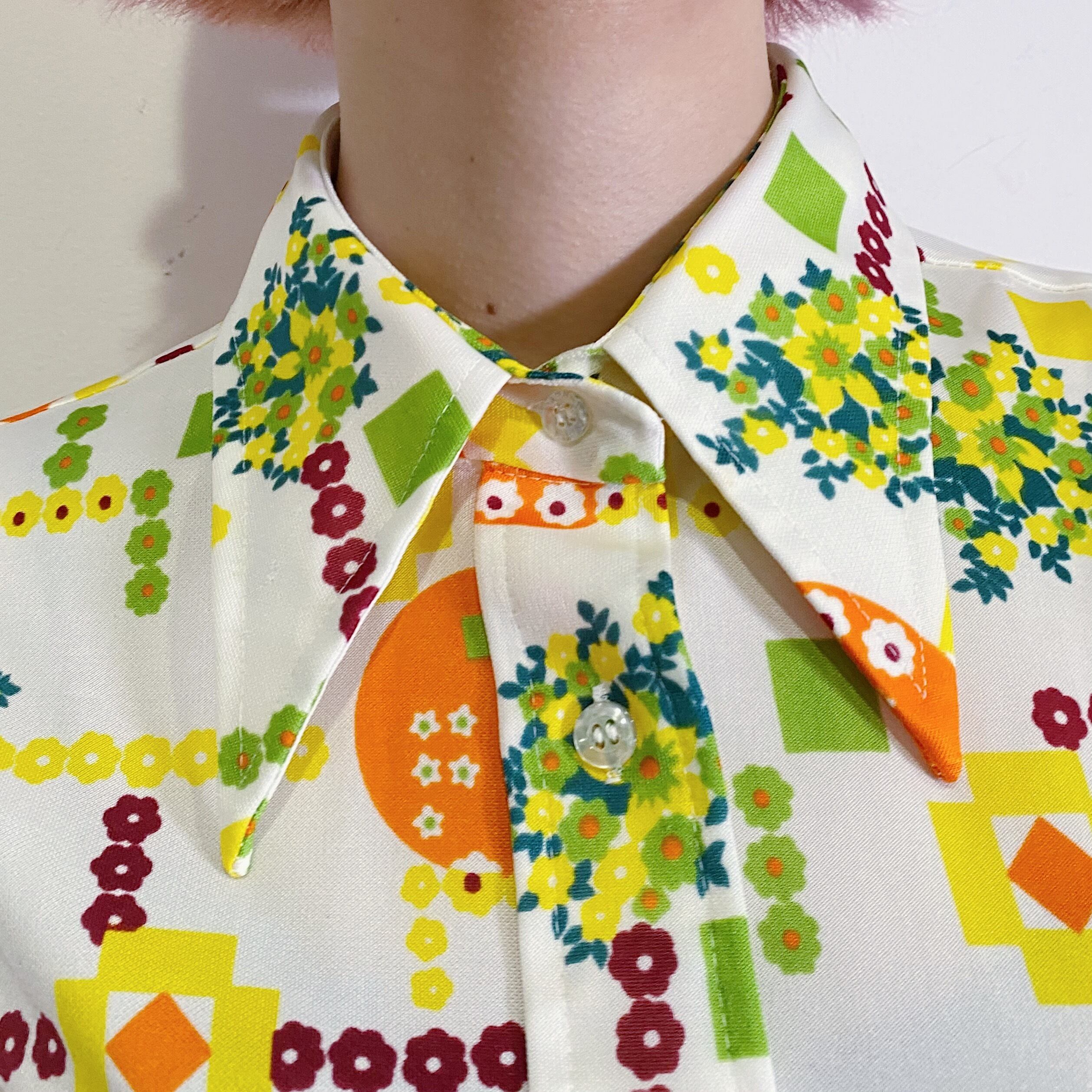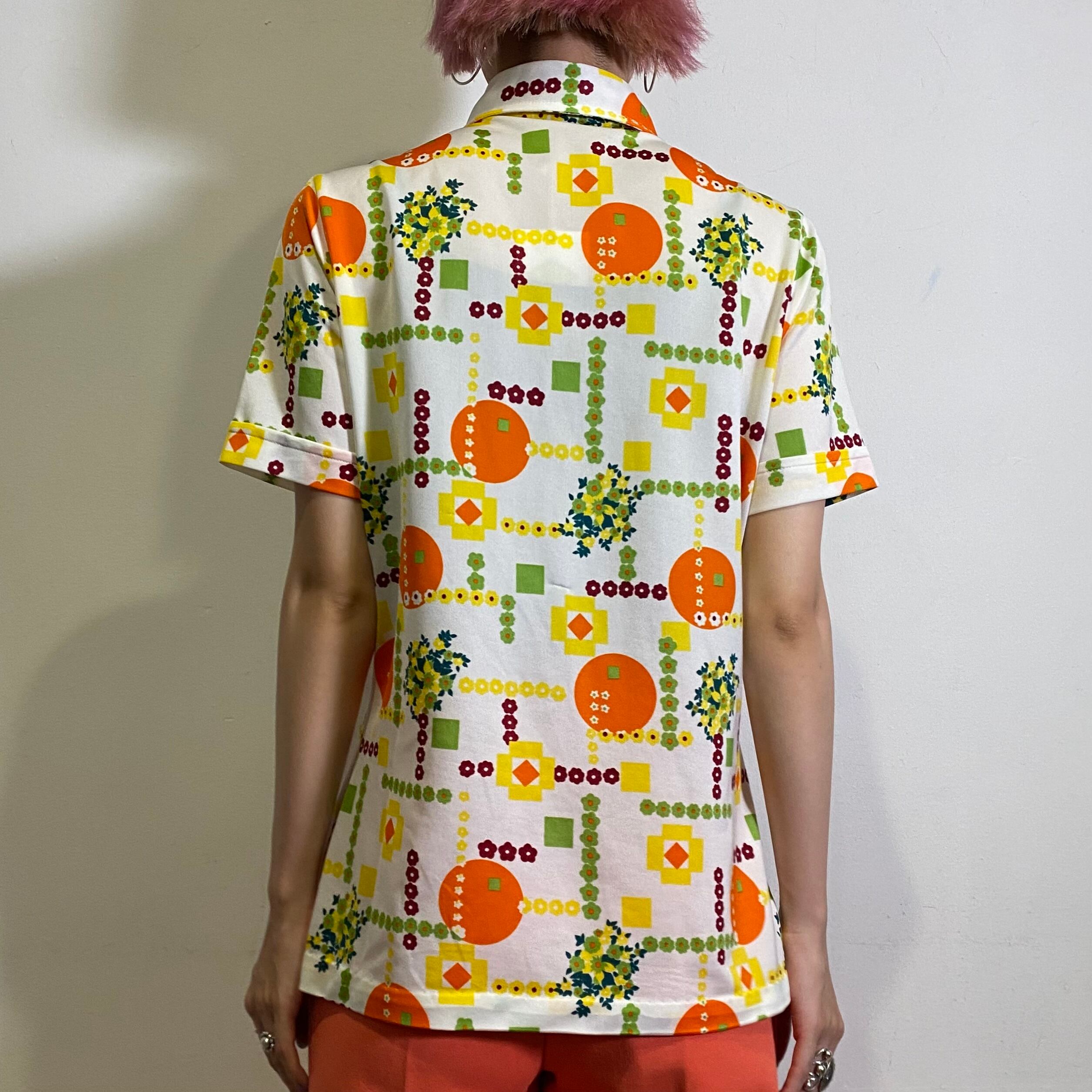 70年代らしさがたっぷりつまった、白地にオレンジや黄色の模様が可愛い半袖シャツです。