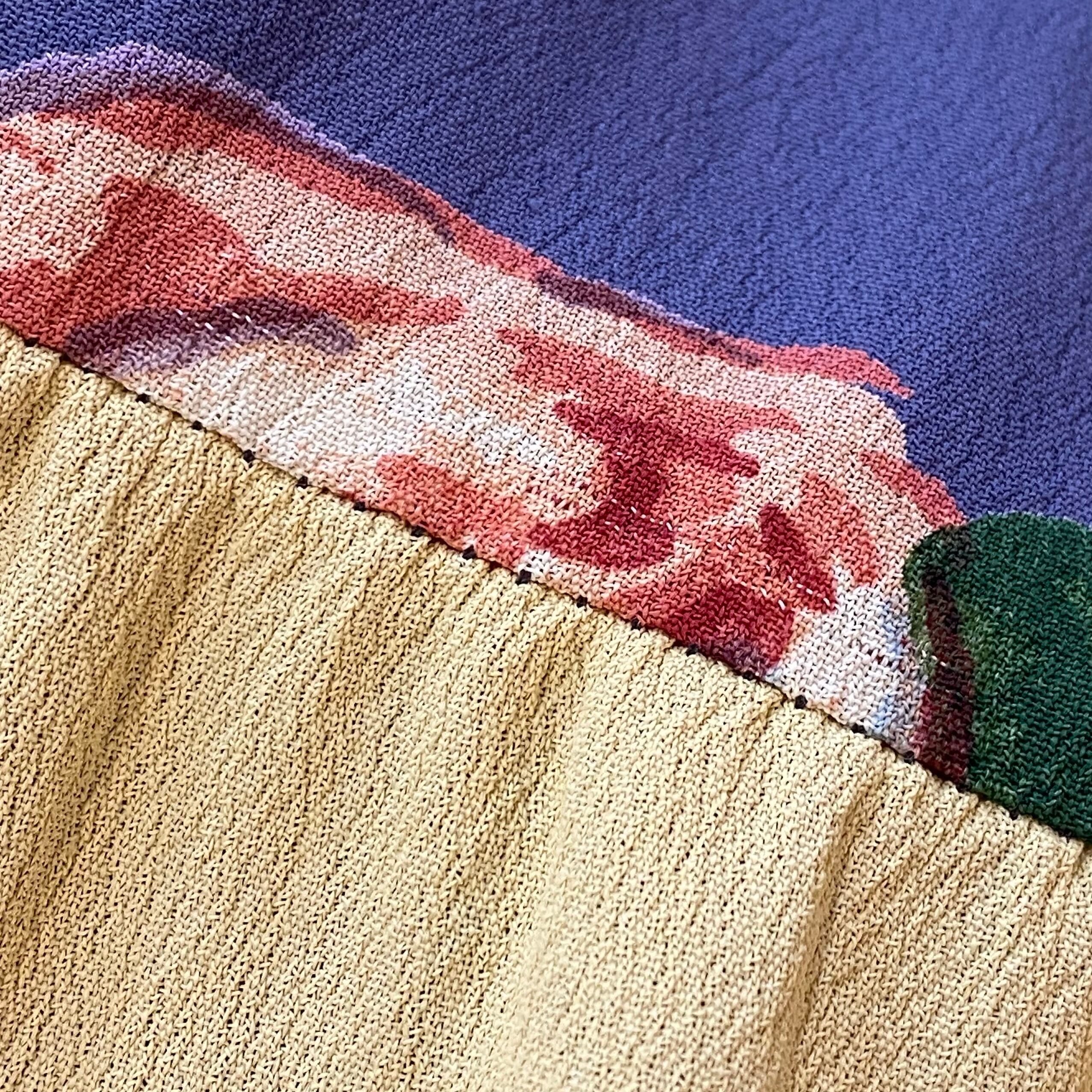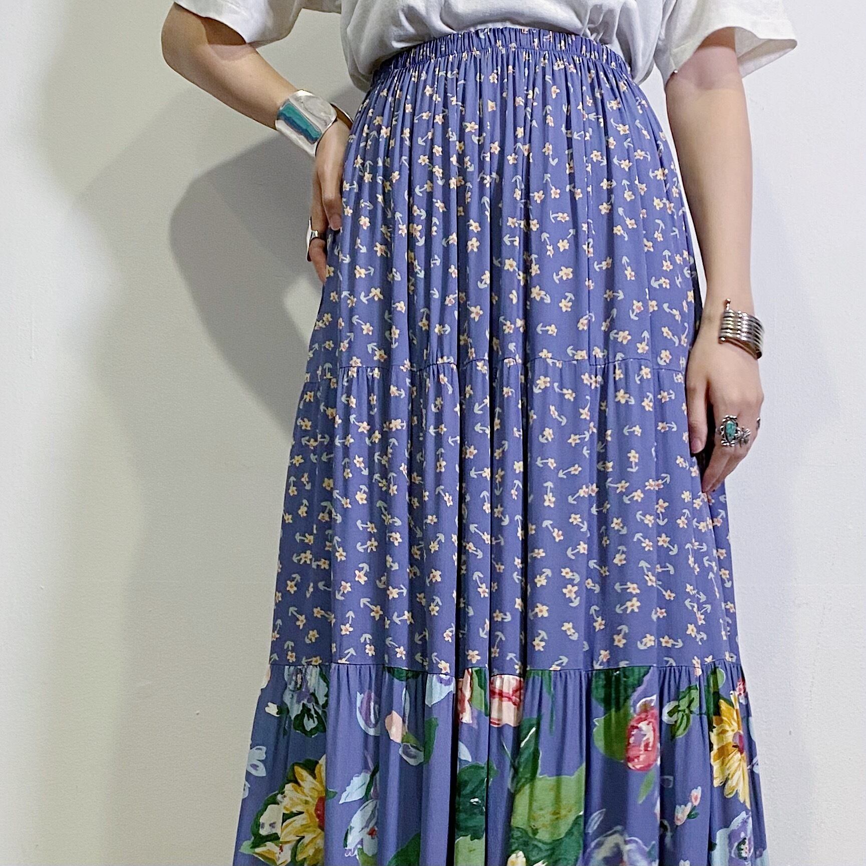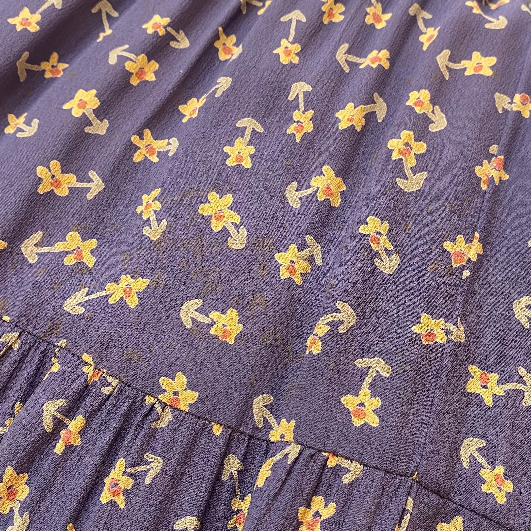 裾の方がティアードで別の生地の切り替えになっており、小花柄の雰囲気も大きな花柄の雰囲気も楽しめて素敵。