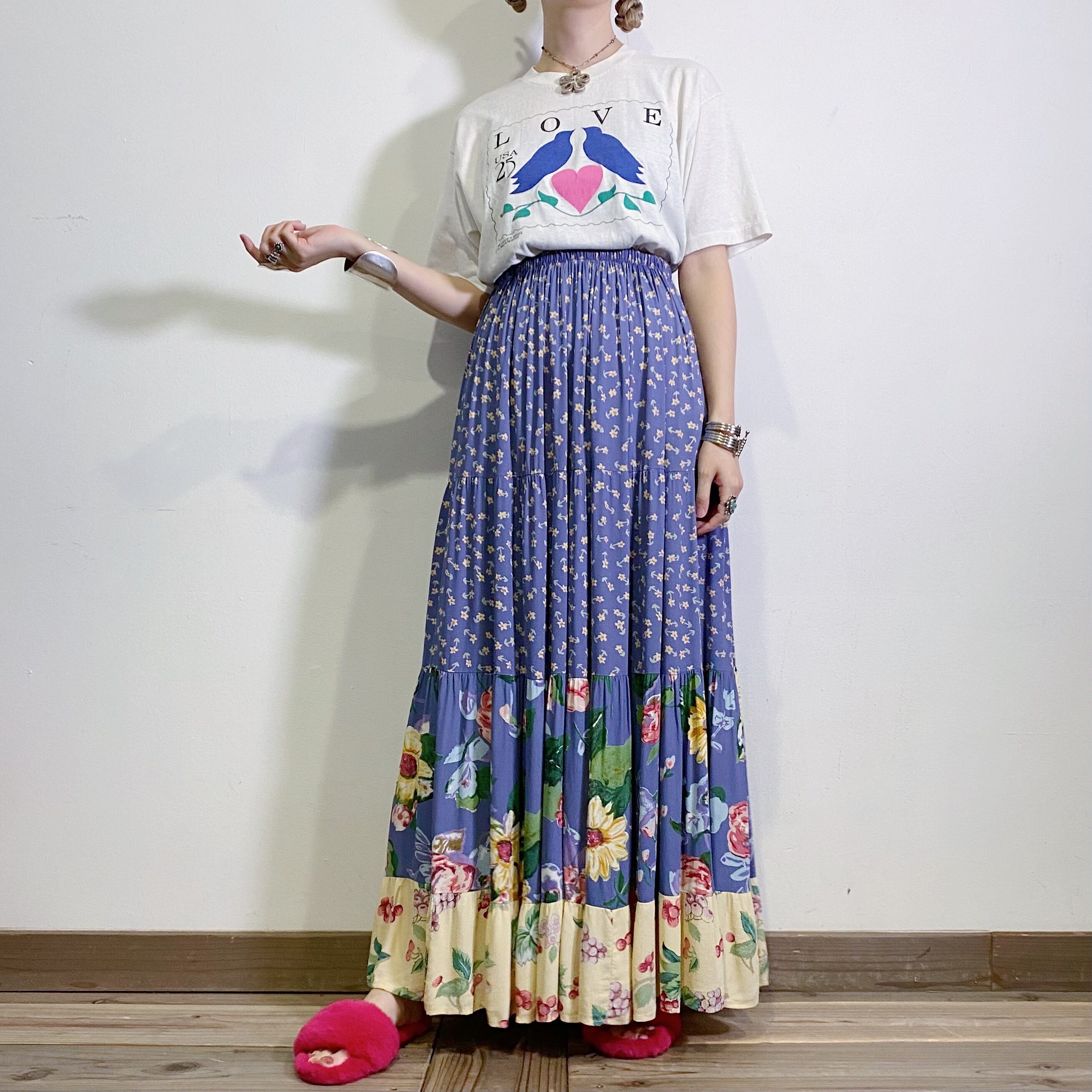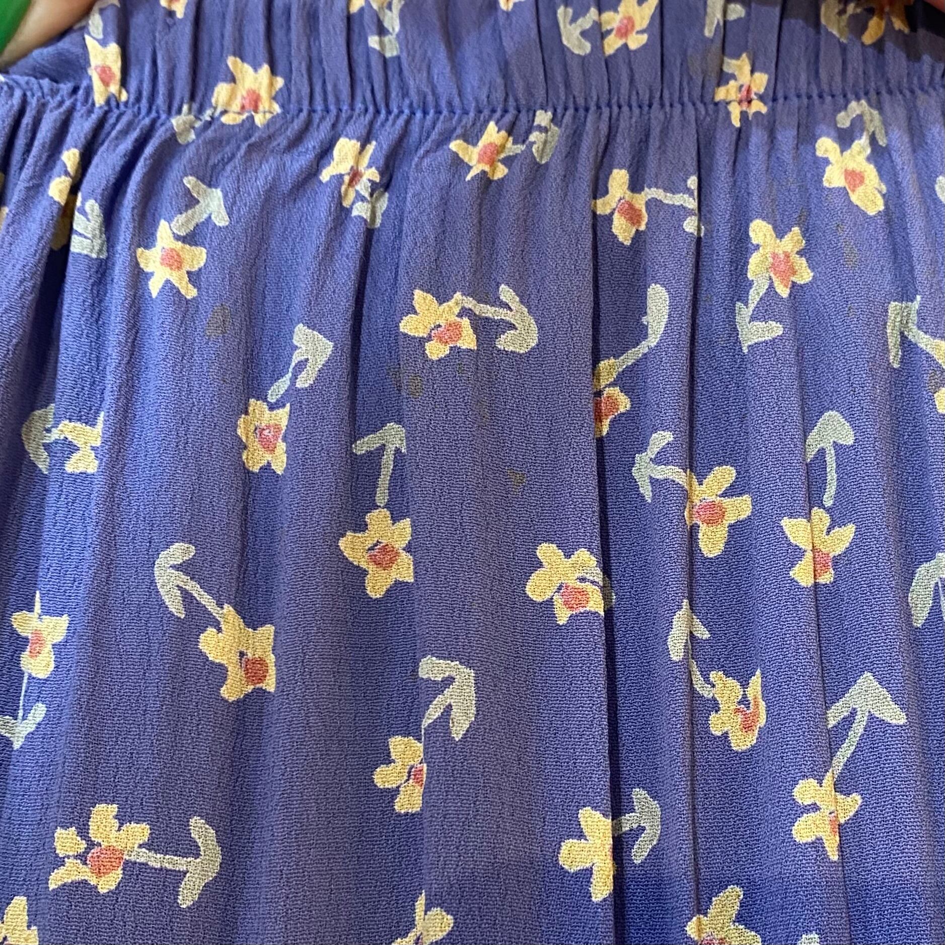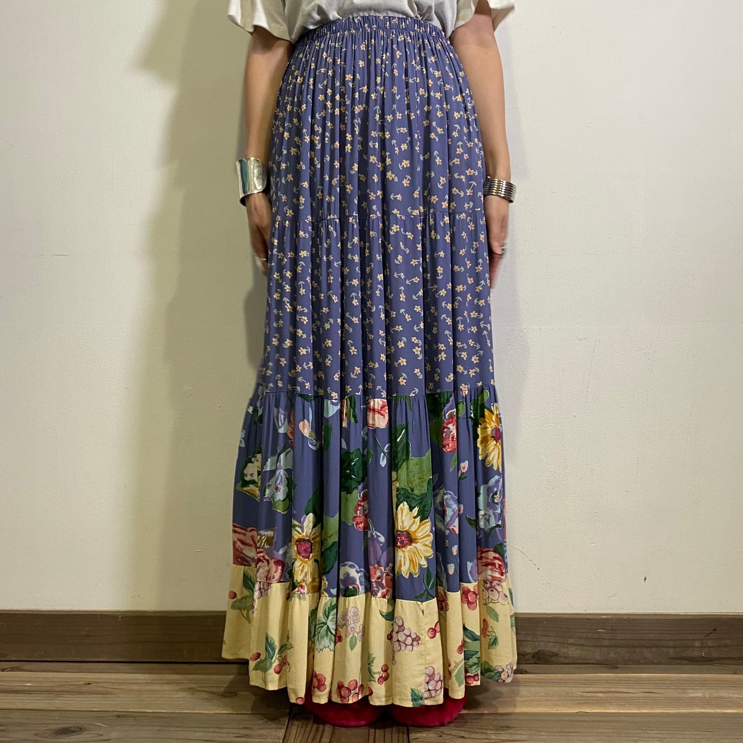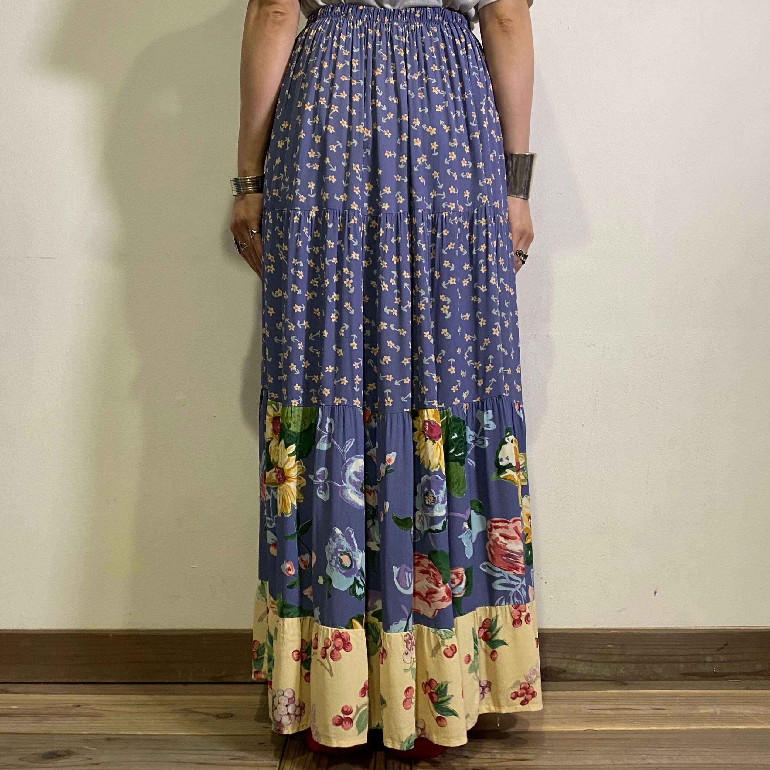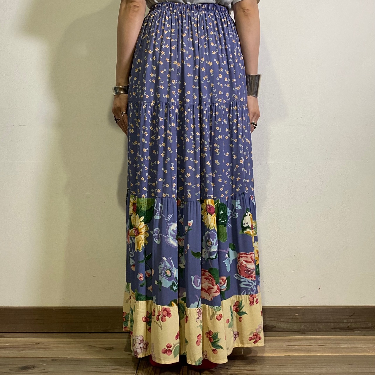 紫色と淡い黄色の色合いがまず目を引く、可愛い花柄ロングスカートです。