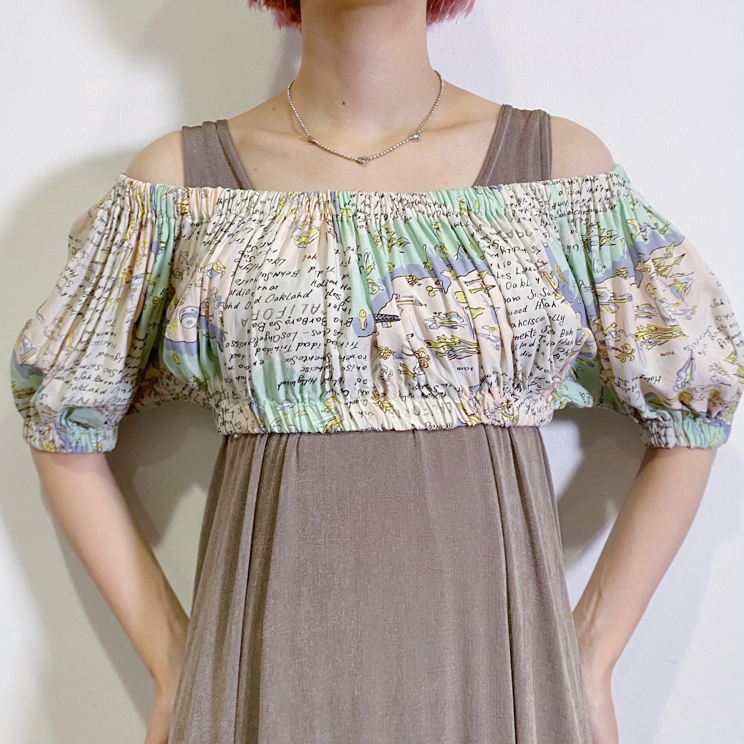 淡いピンクやグリーンの色合いが可愛い、80年代のショート丈のトップスです。
