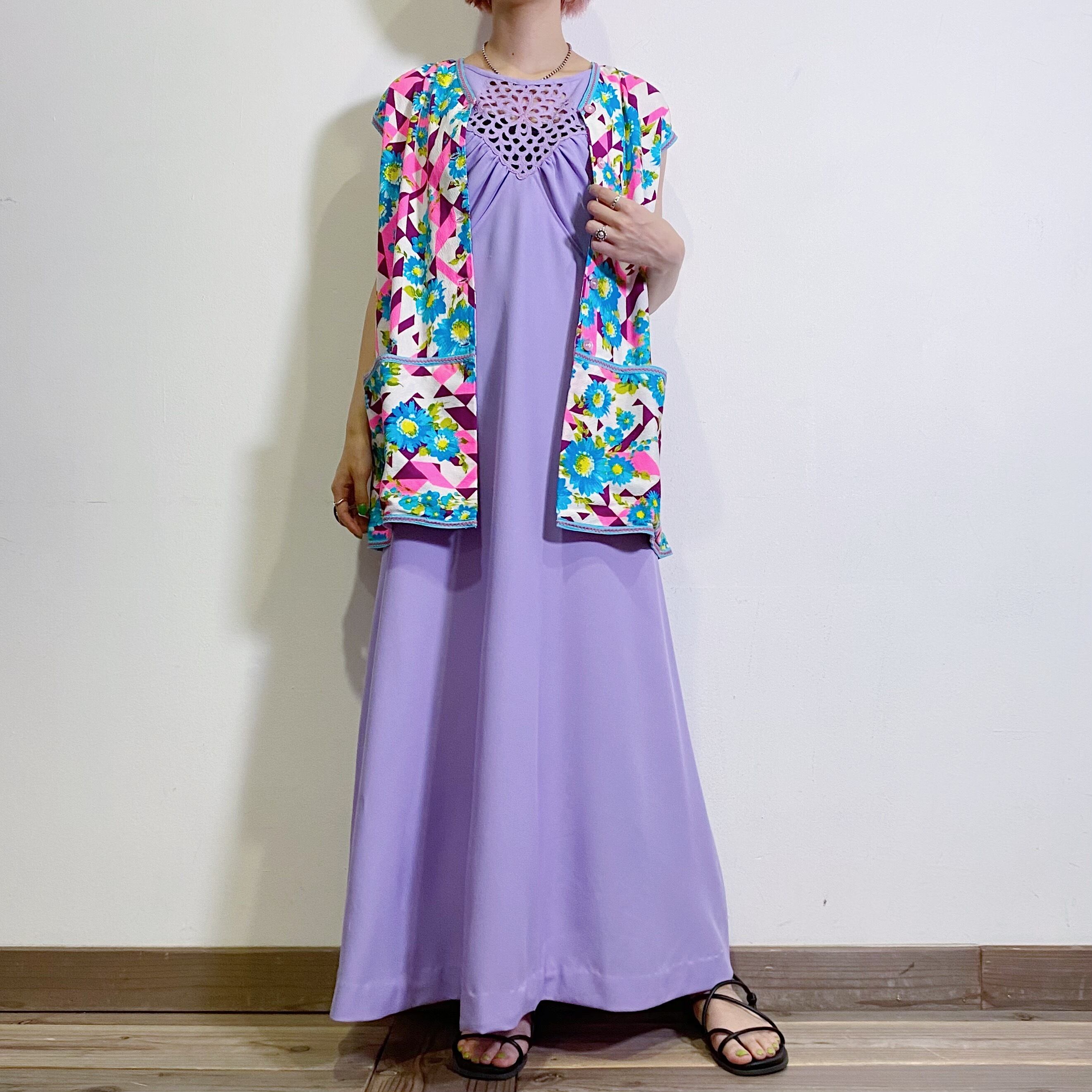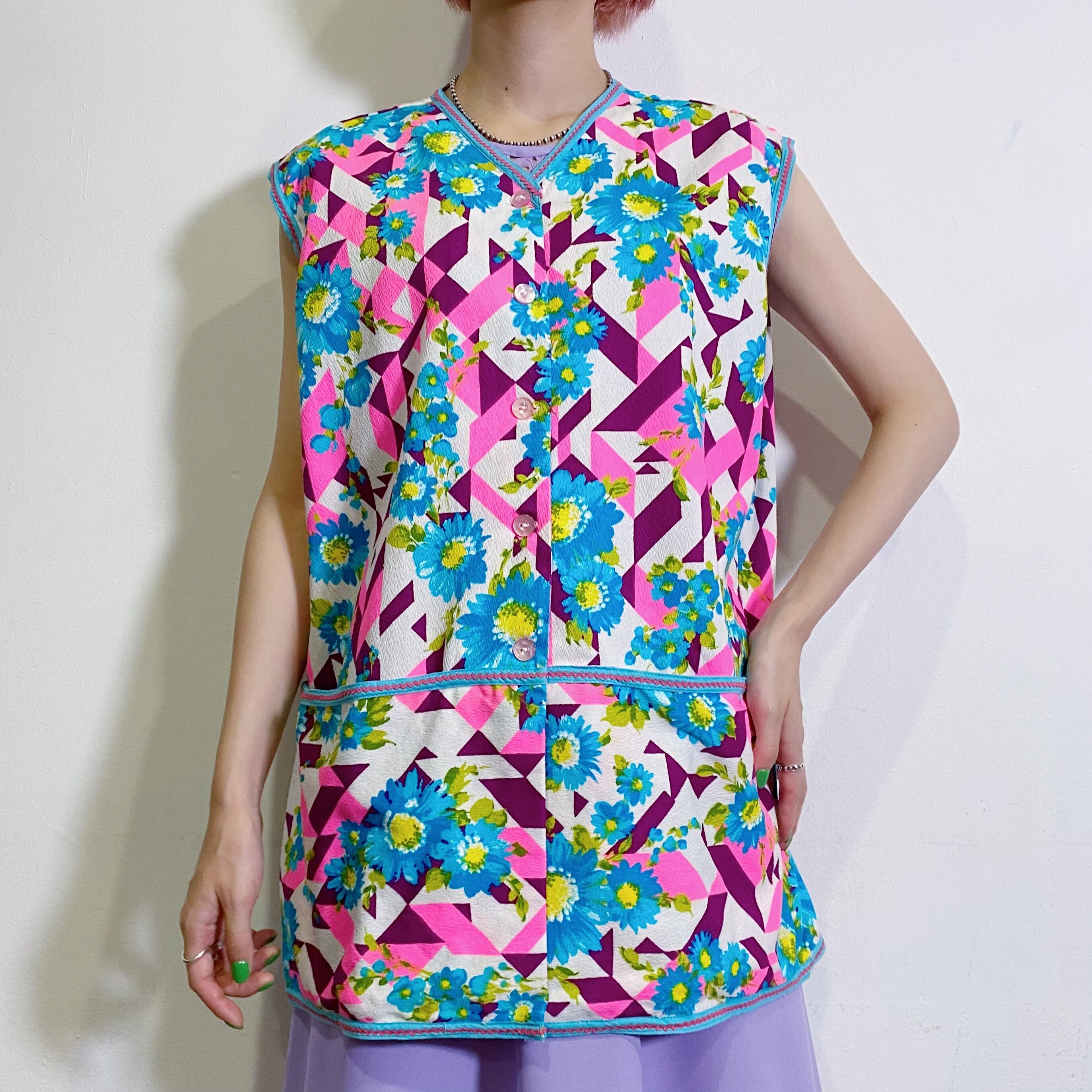 幾何学模様と花柄がミックスされたプリントで雰囲気のある、70年代トップスです。