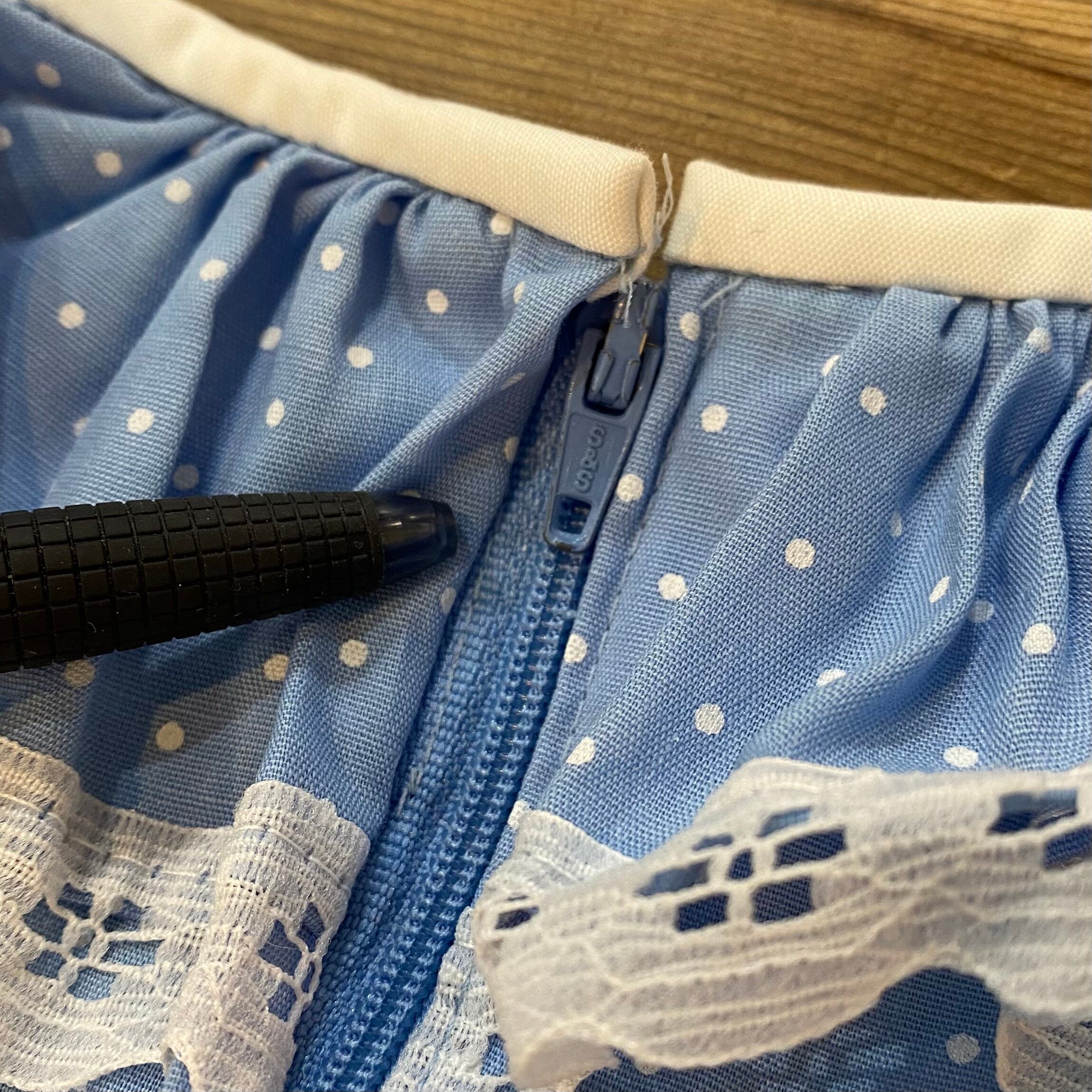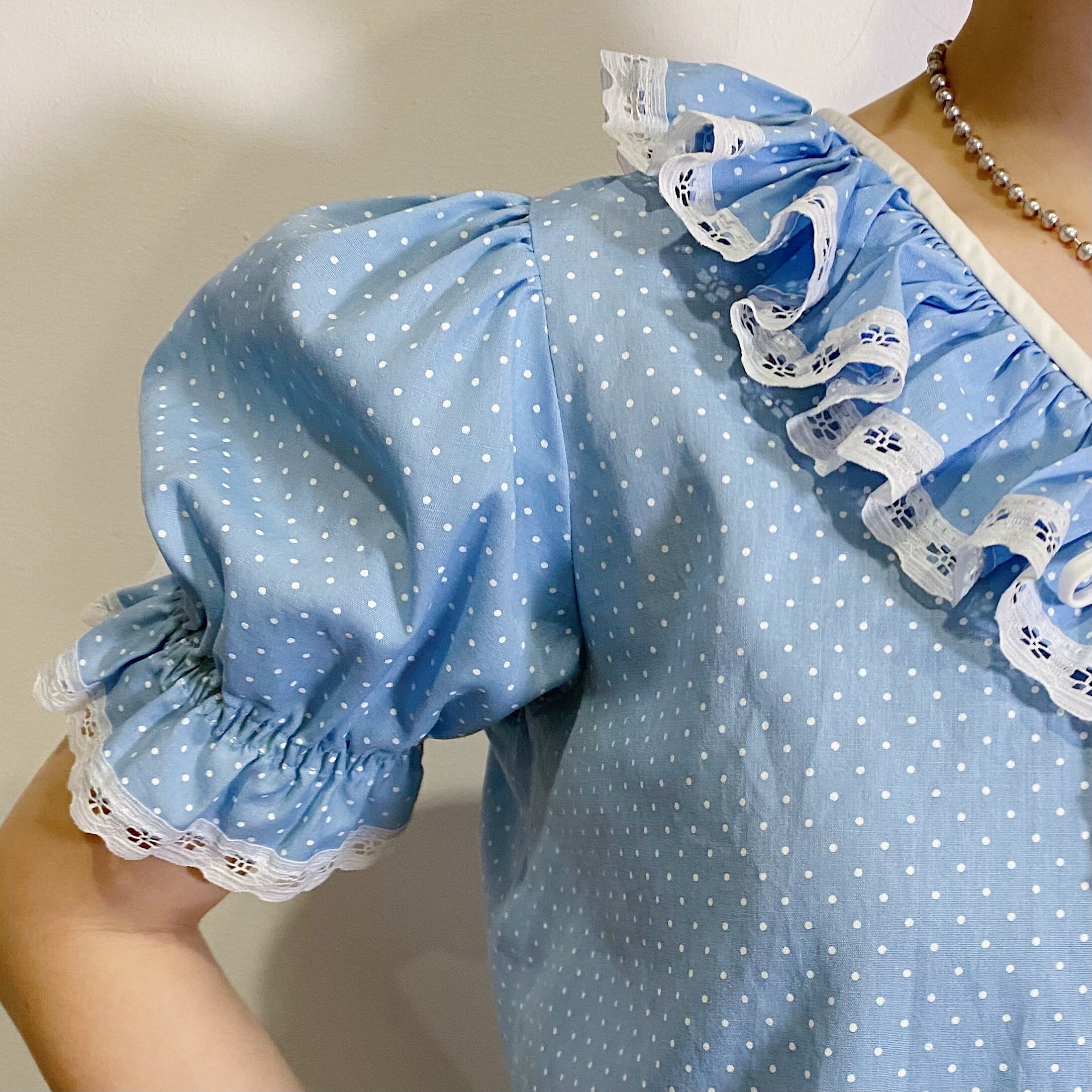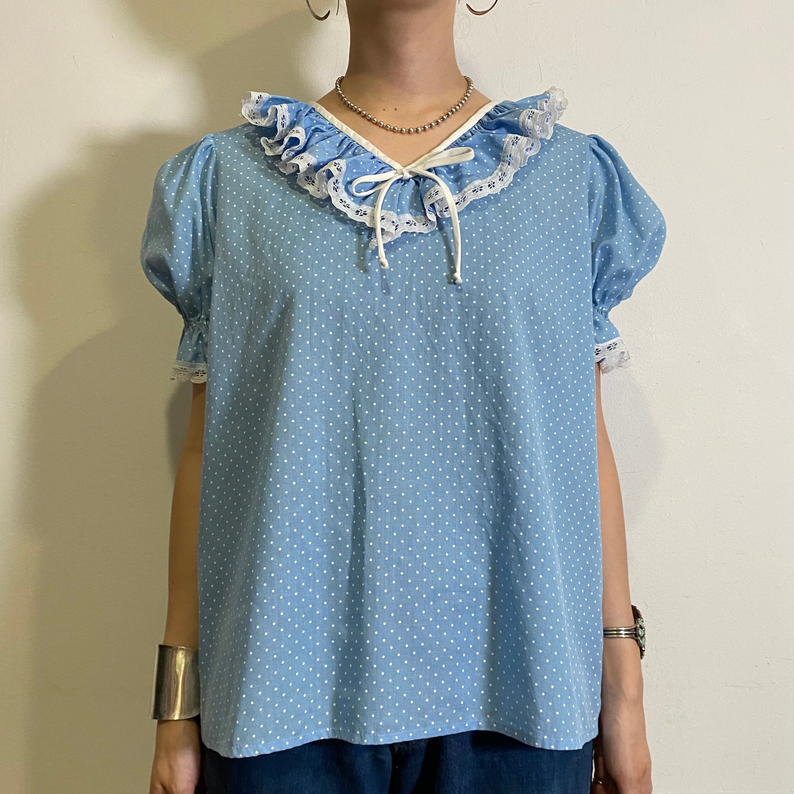 水色に白のレースやパイピング、首回りのフリルが可愛い80年代のプルオーバーブラウスです。