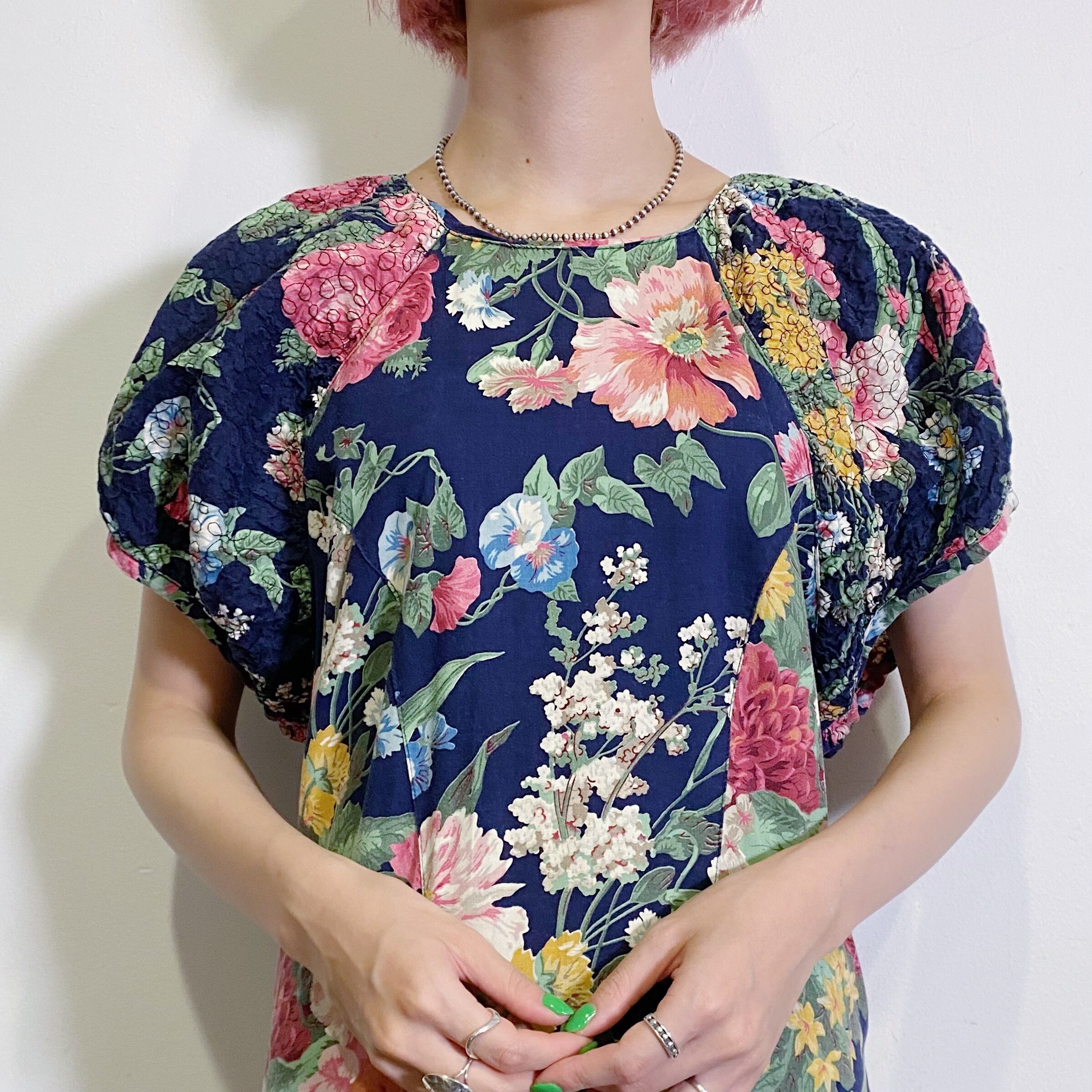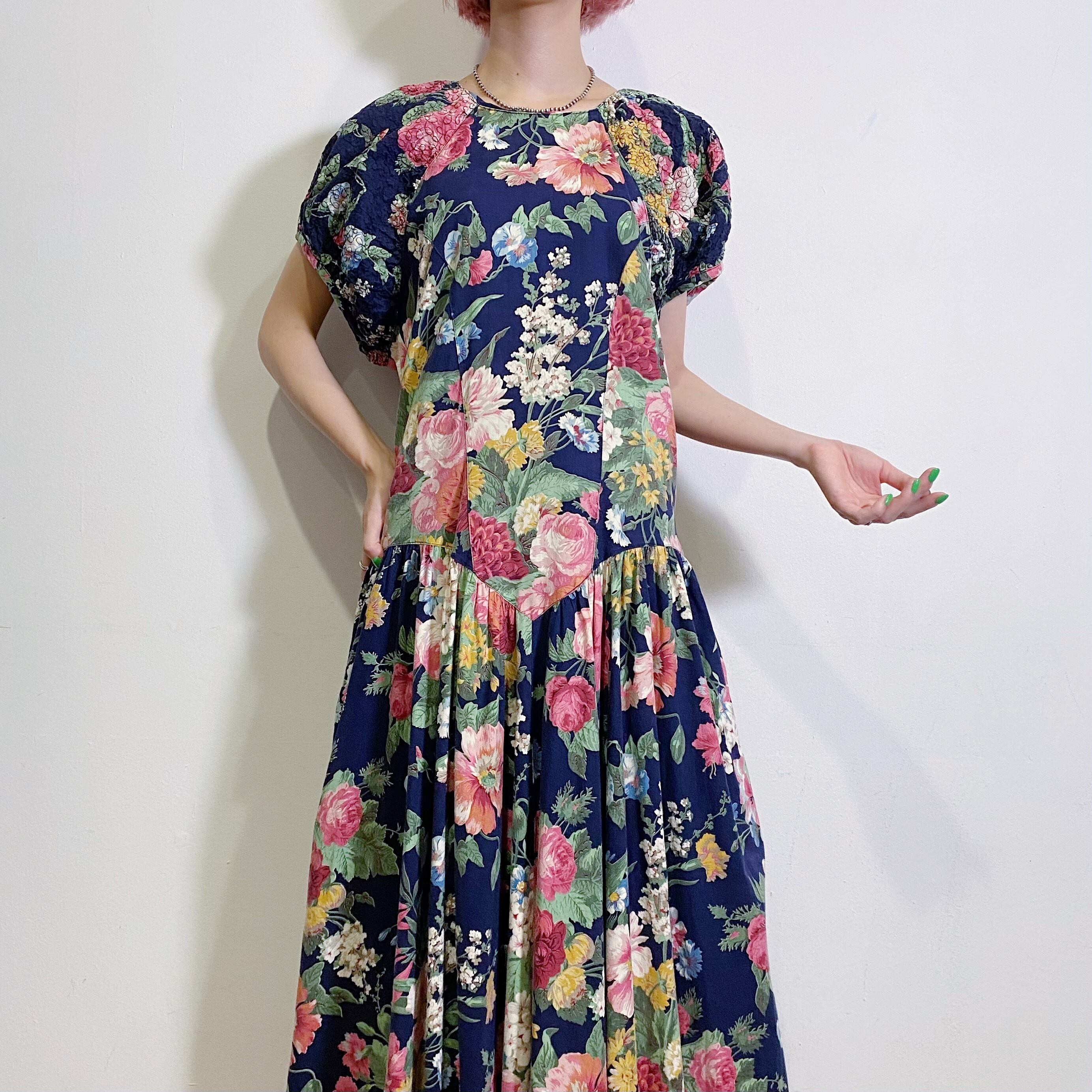 ネイビー地に大きなピンクの花柄が可愛い、80年代ワンピースです。
