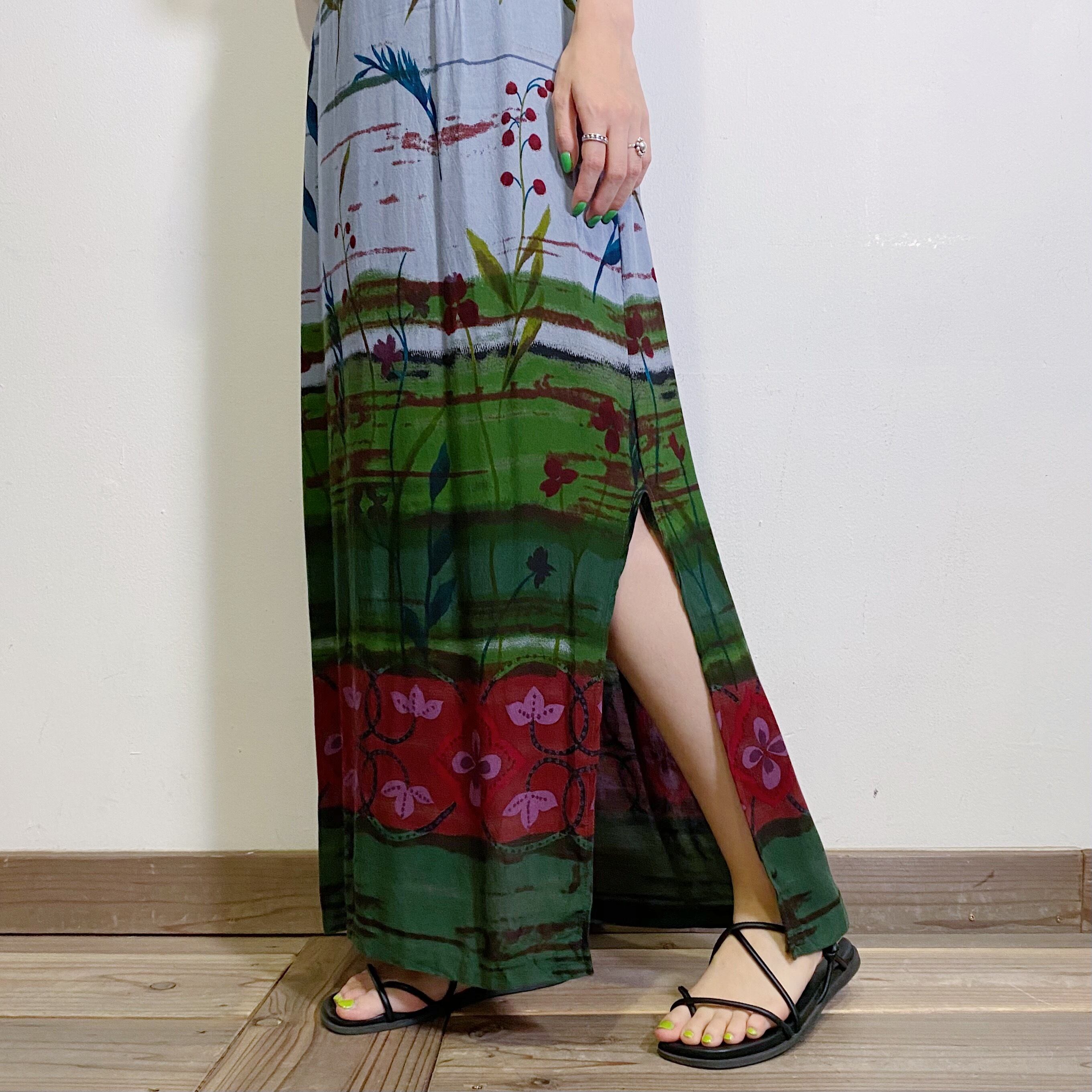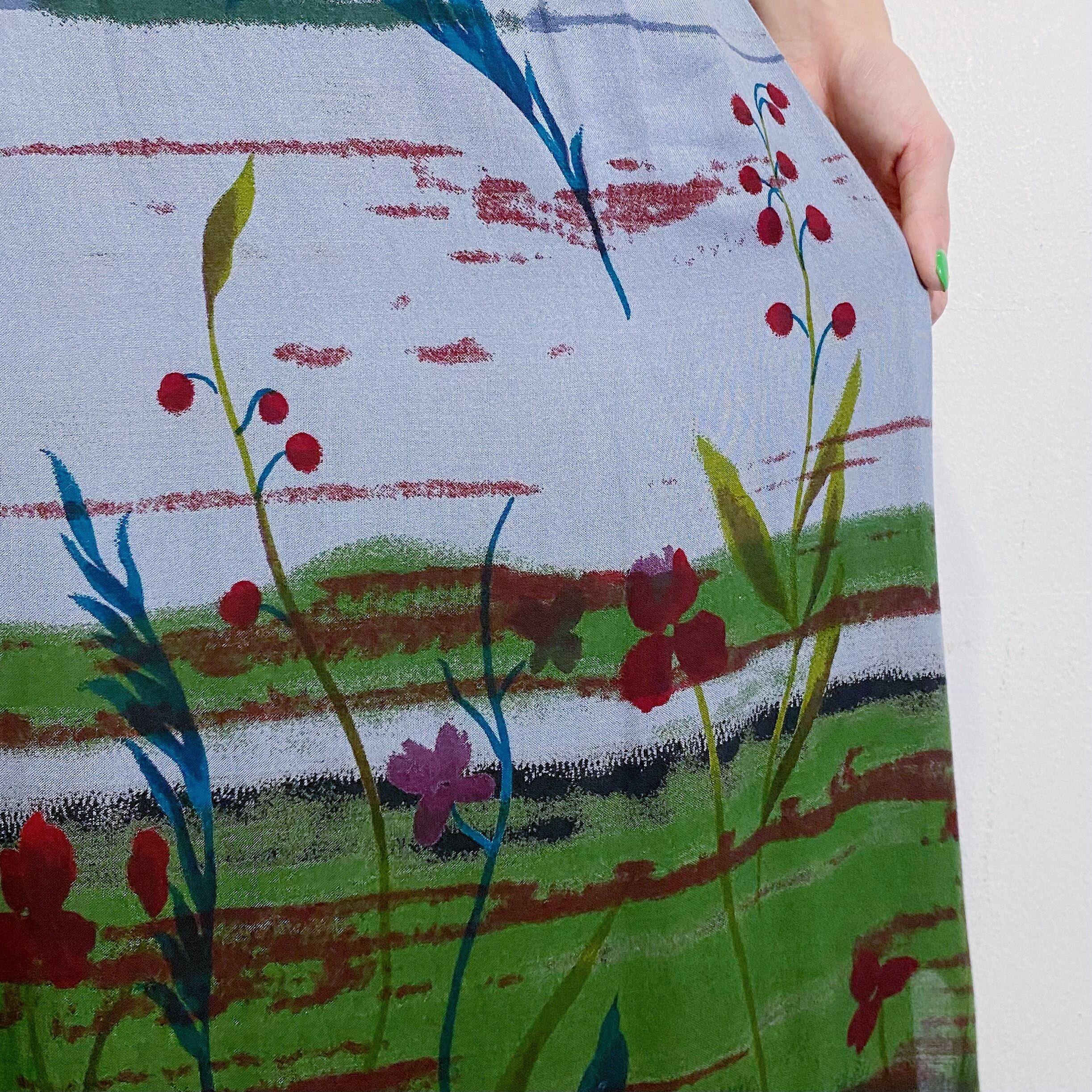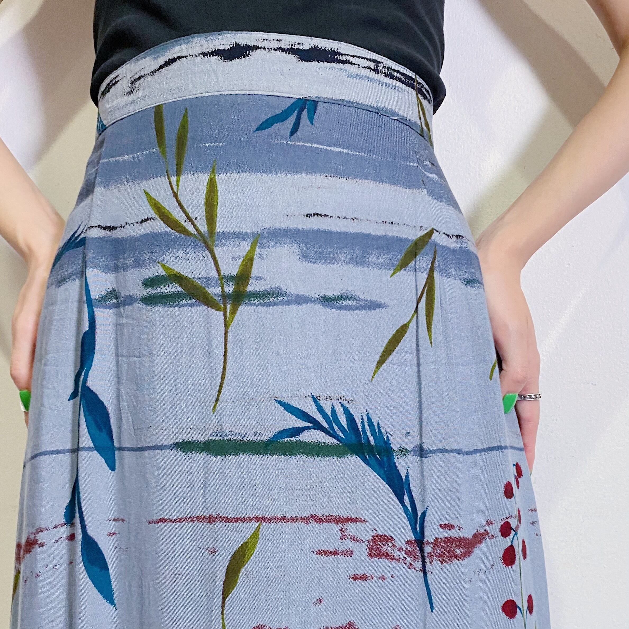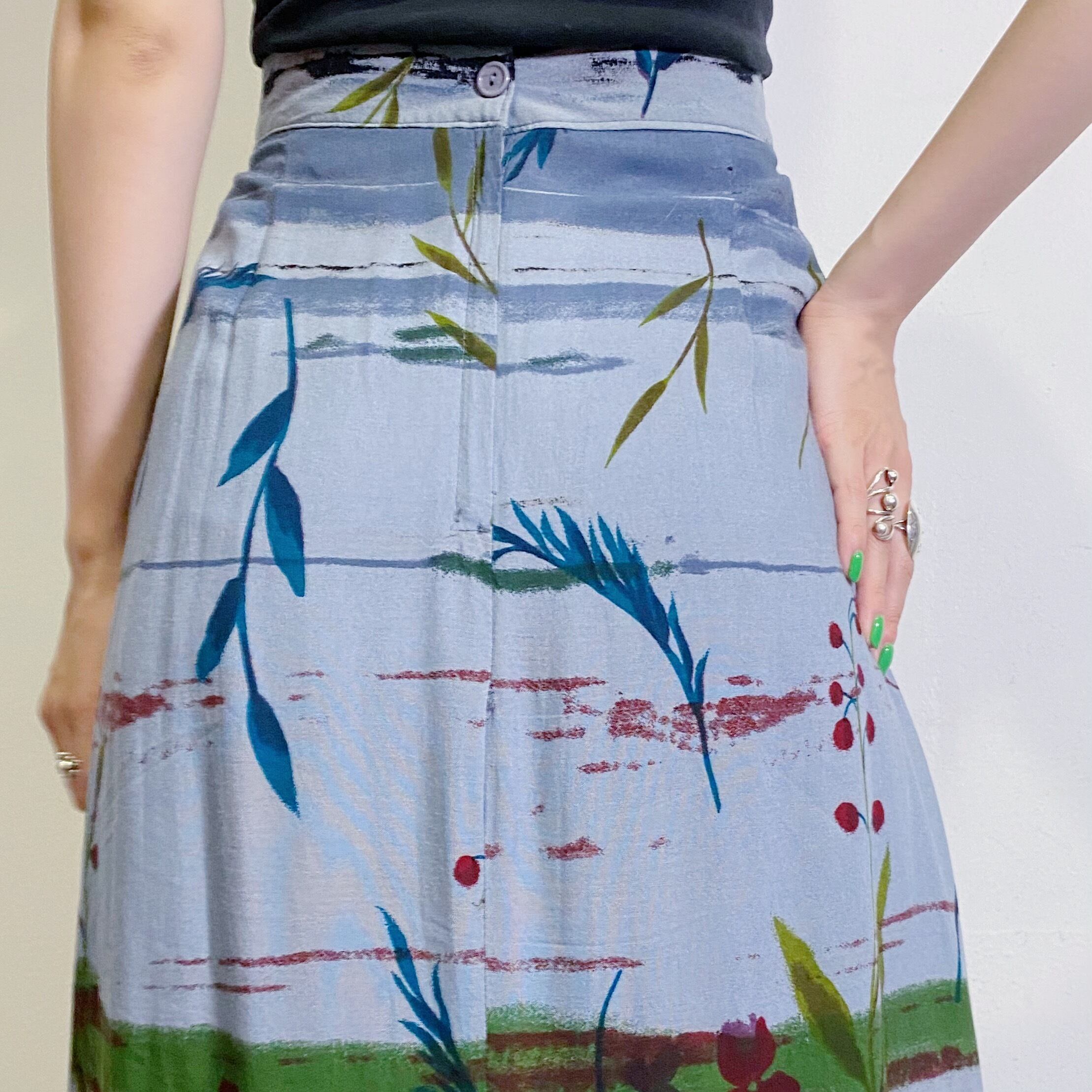 水彩画で描かれたよう、湖と陸のようなテキスタイルが可愛い、レーヨン素材のロングスカートです。