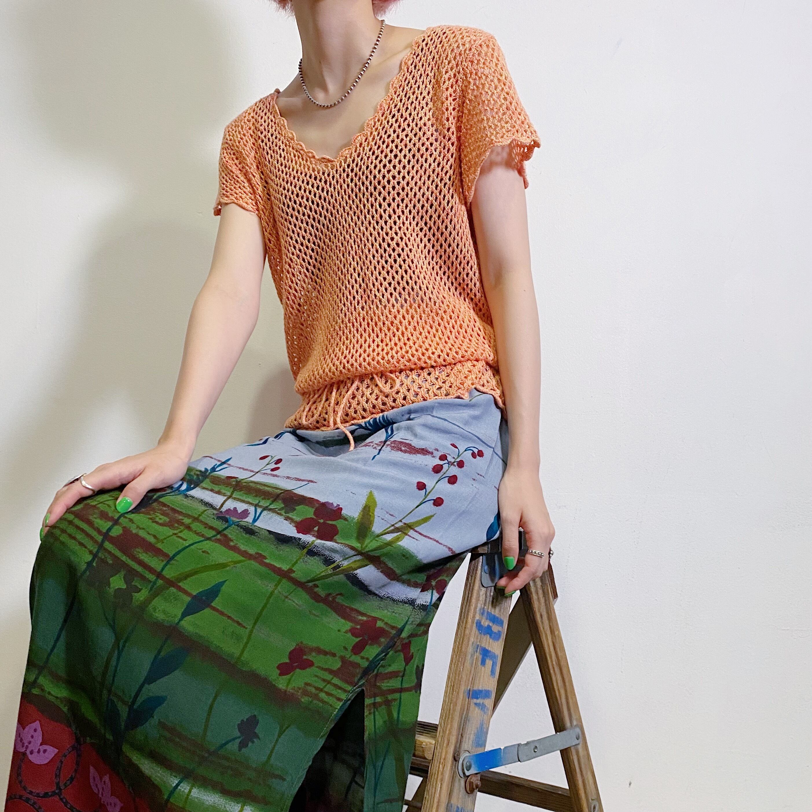 オレンジのようなサーモンピンクのような色合いが可愛い、クロシェニットトップスです。