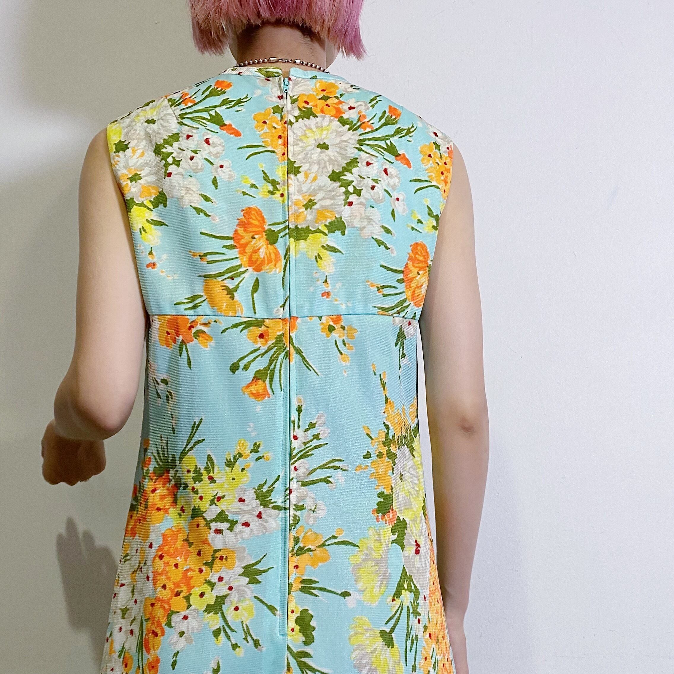 爽やかなサックスブルーベースに黄色やオレンジの花柄が可愛い、70年代のワンピースです。