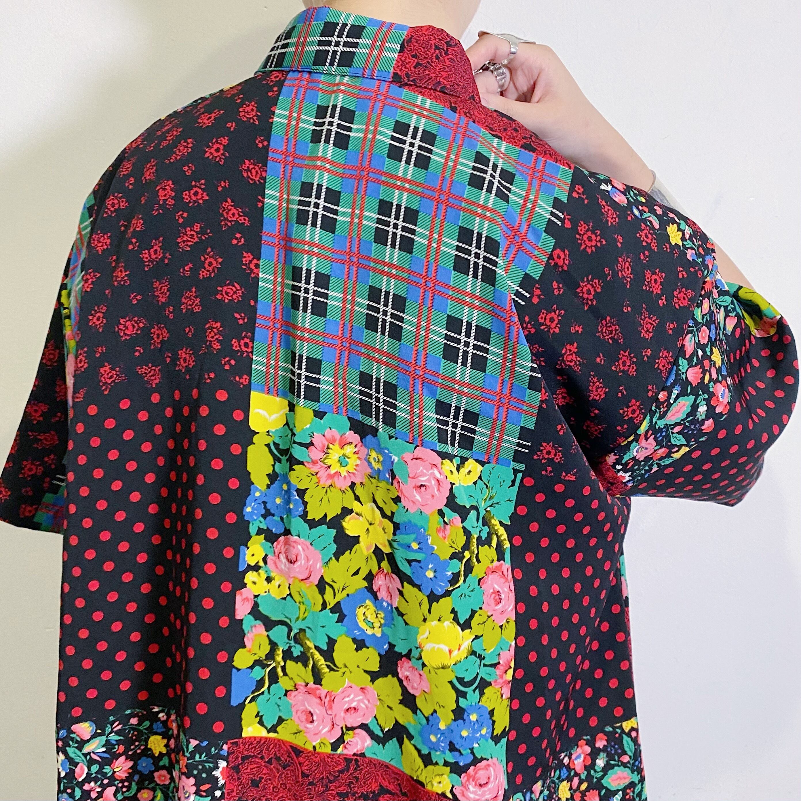 タータンチェックやドット、花柄などのパッチワークプリントが可愛い半袖シャツです。