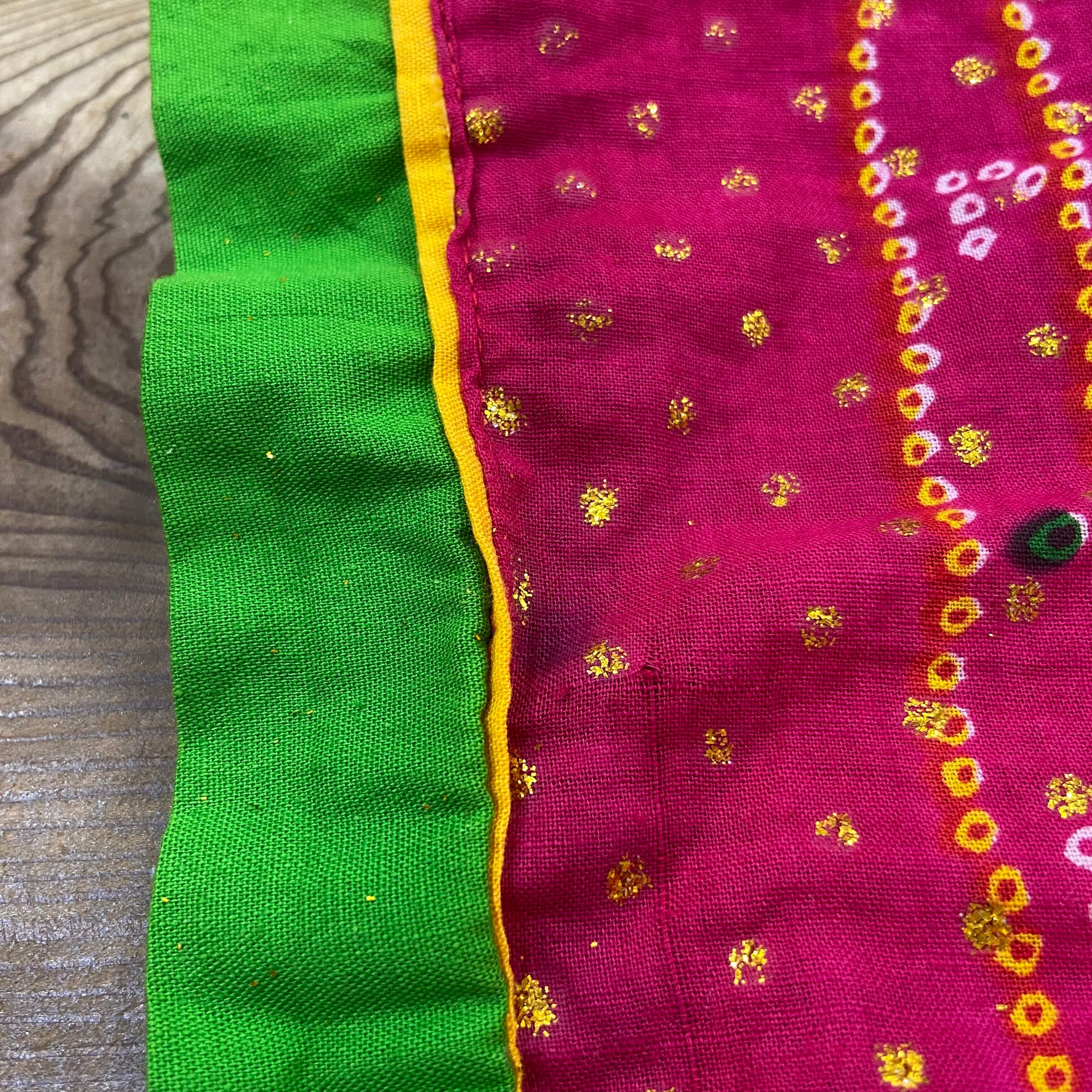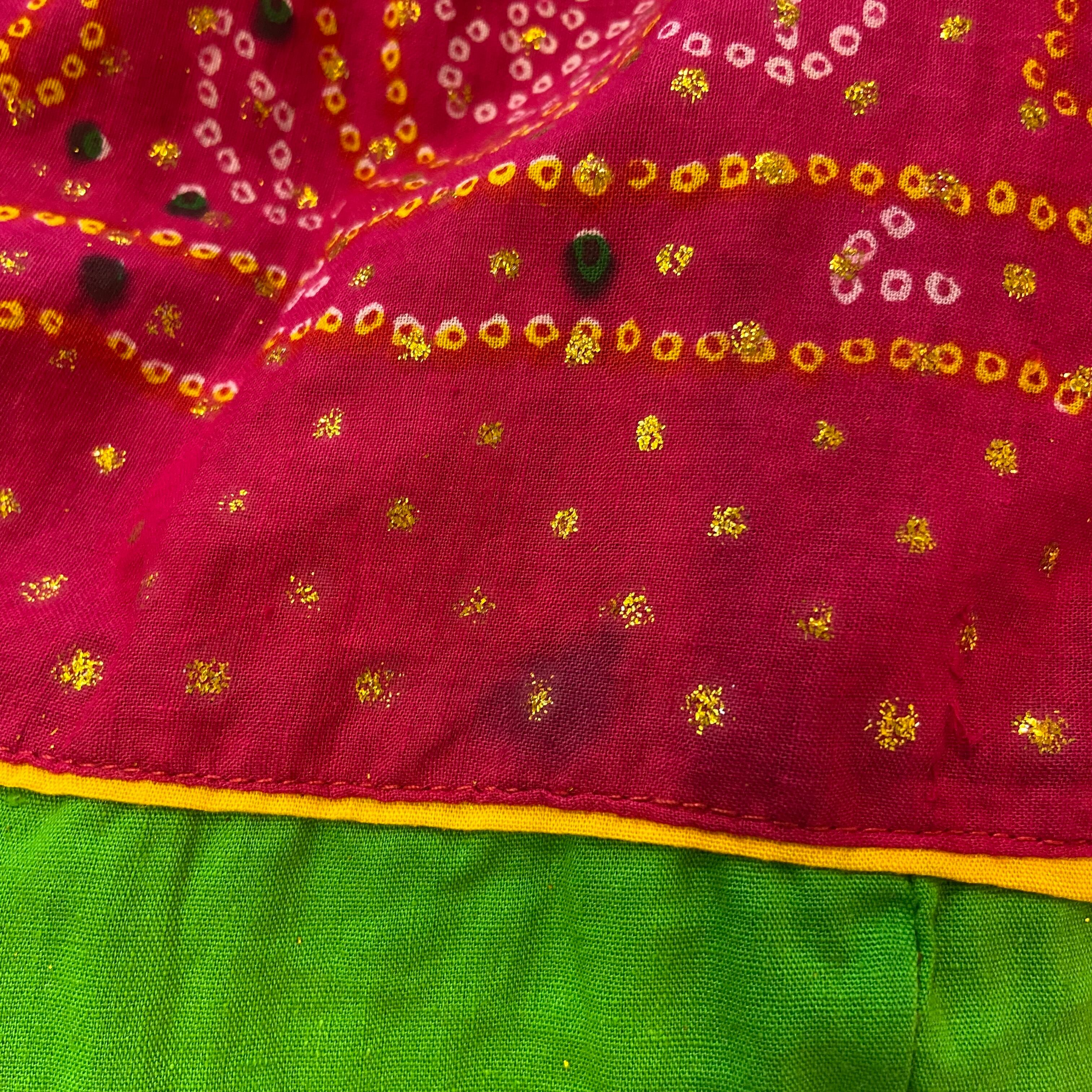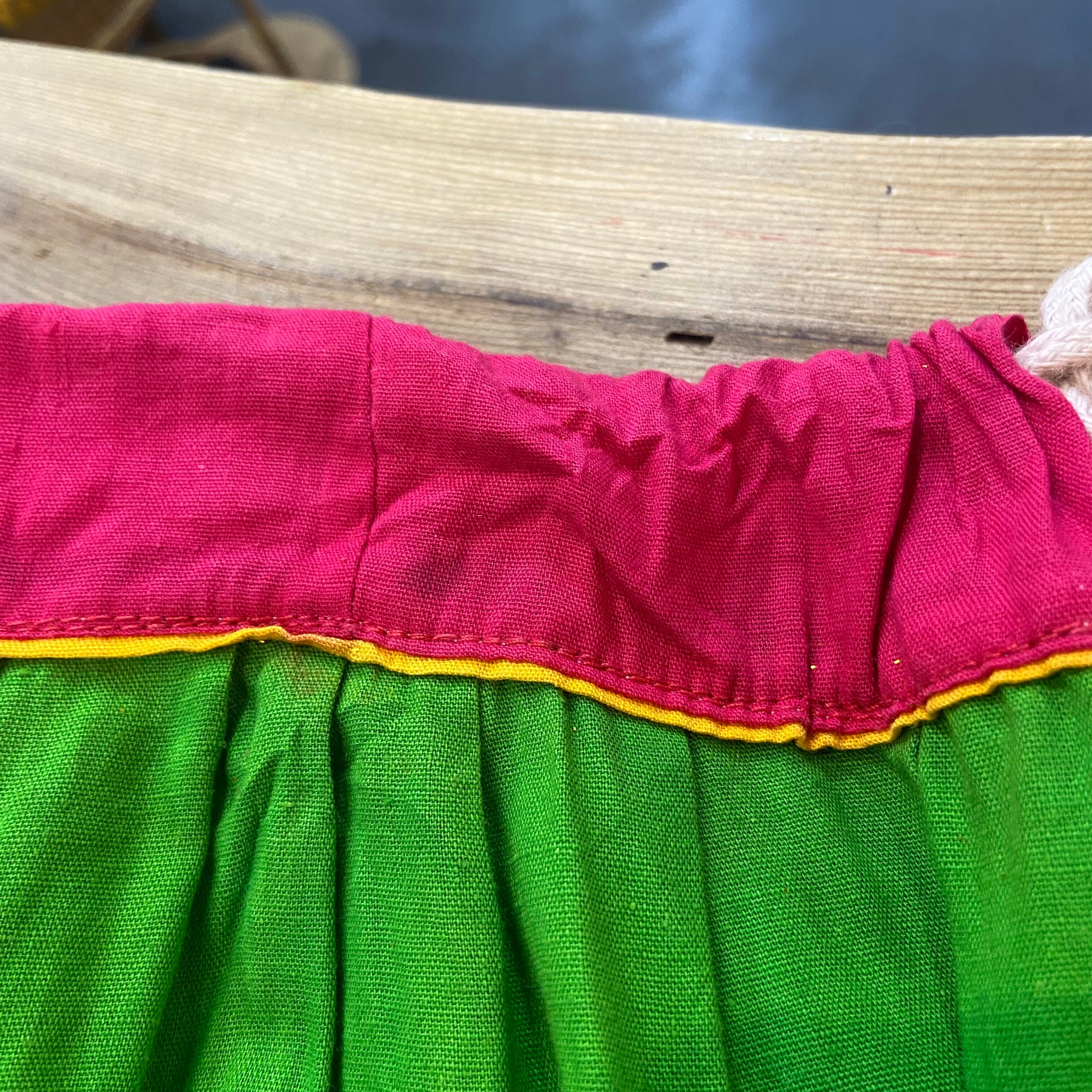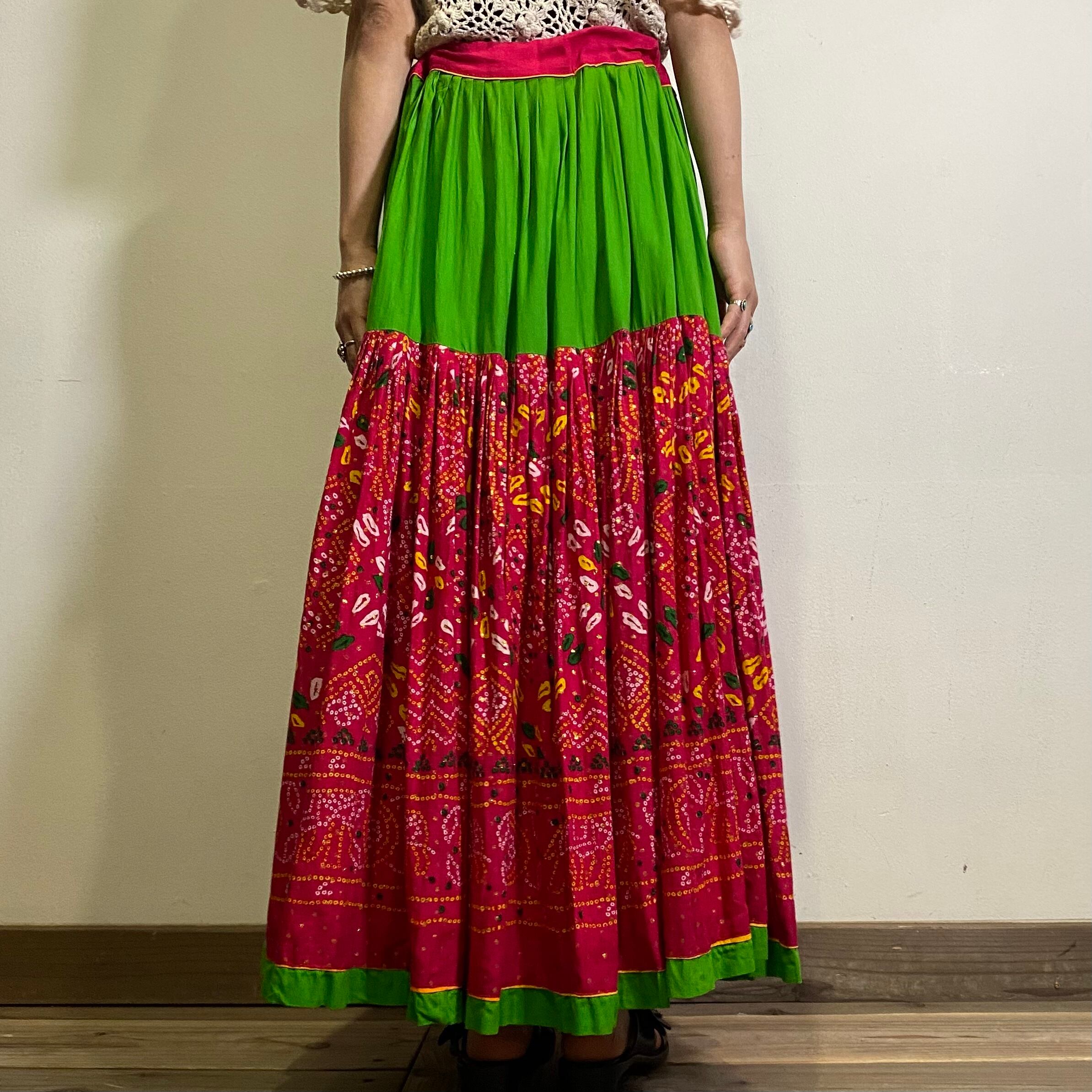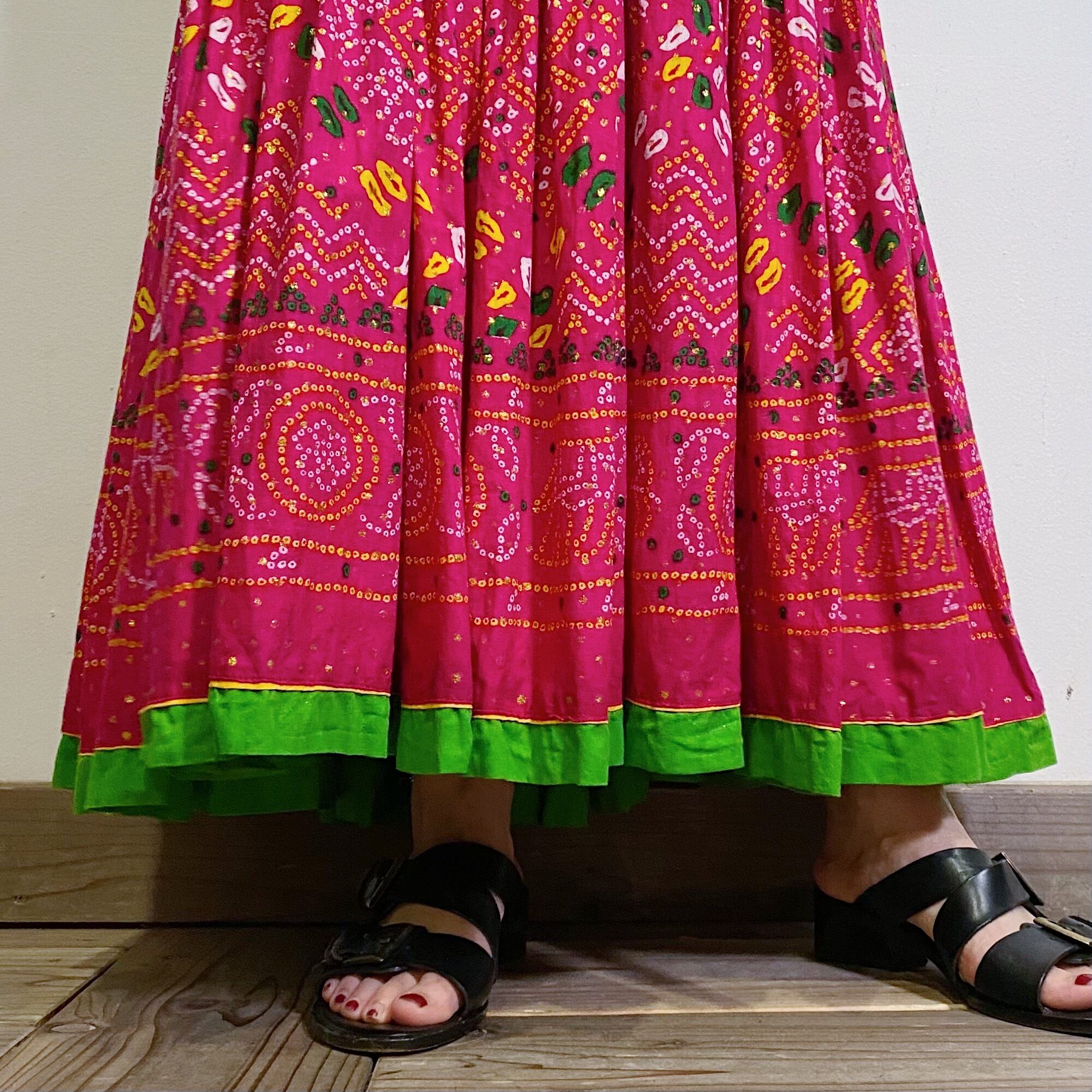 ピンクとグリーンの組み合わせが可愛い、エスニックムード漂うロングスカートです。