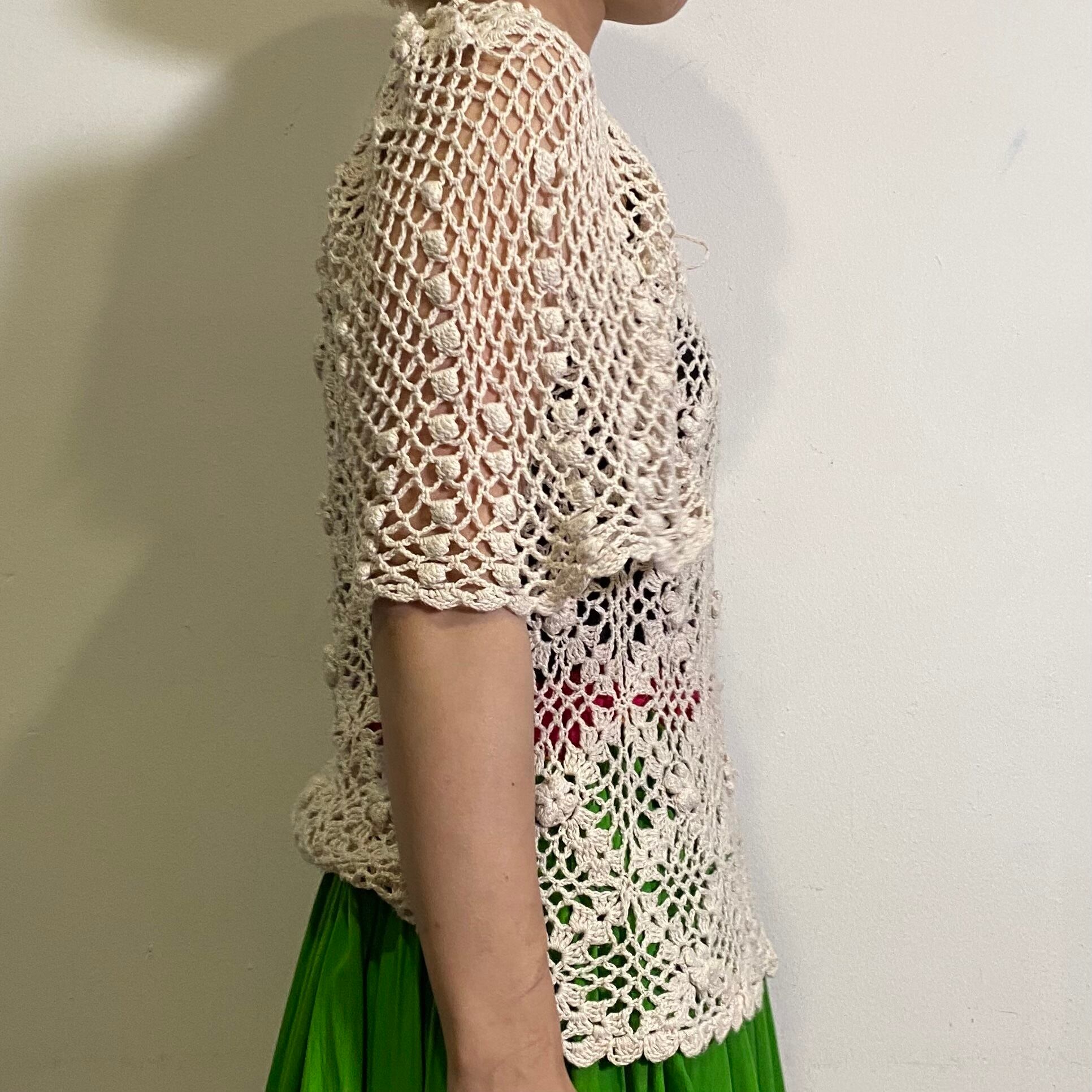 ホワイトベースで大変使い勝手の良さそうな、70年代の手編みのクロシェニットトップスです。