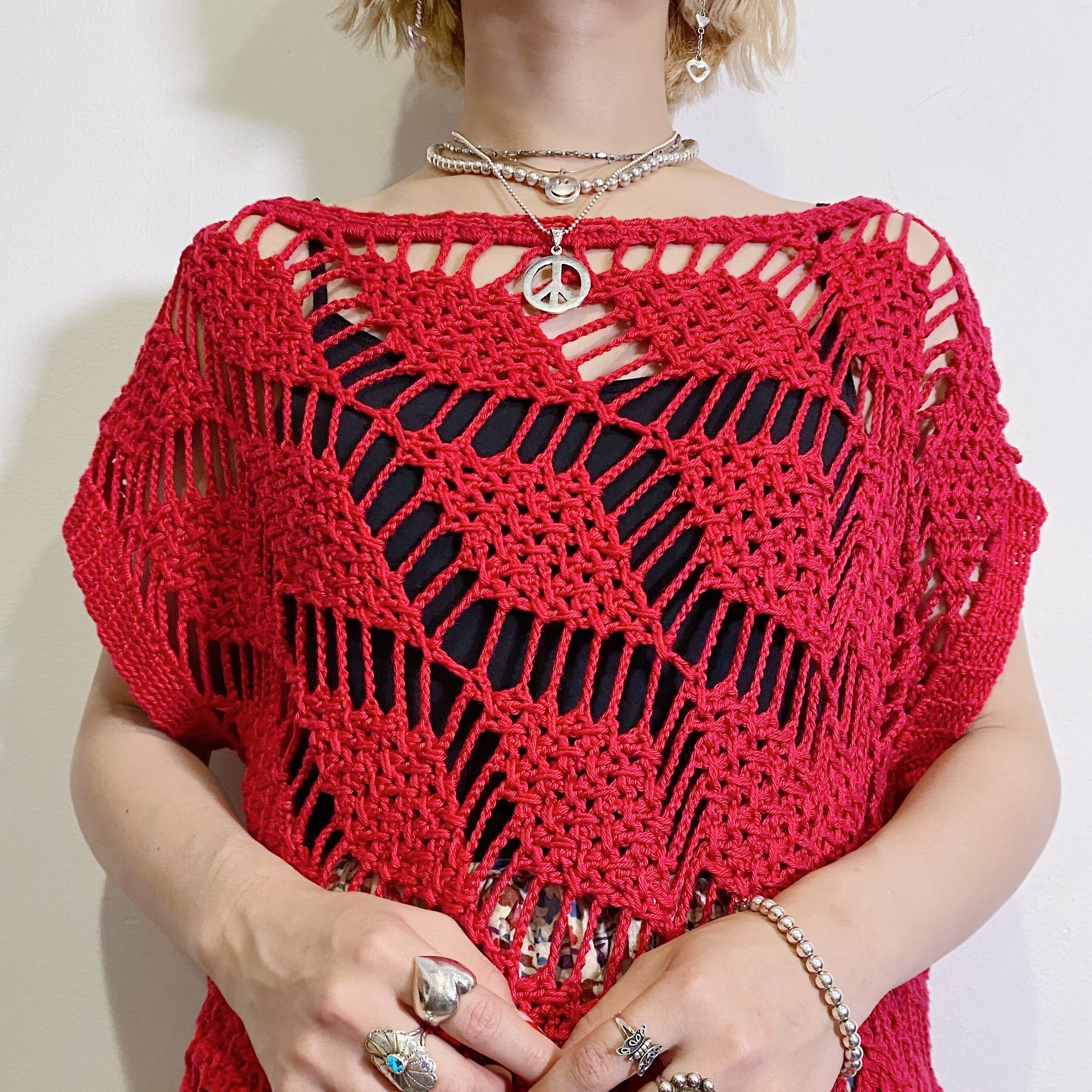 パッと目を惹くレッドカラーが可愛い、手編みのクロシェニットトップスです。