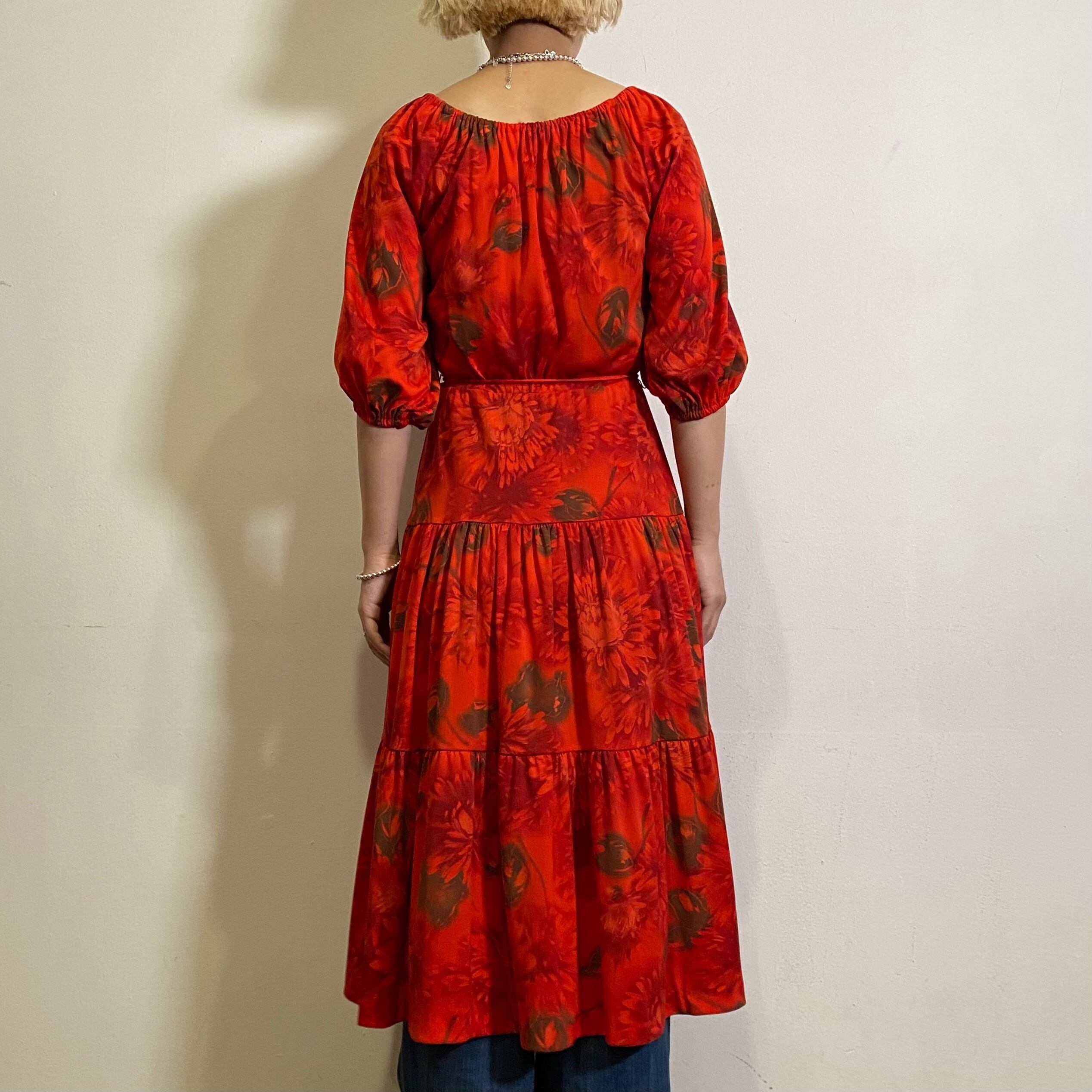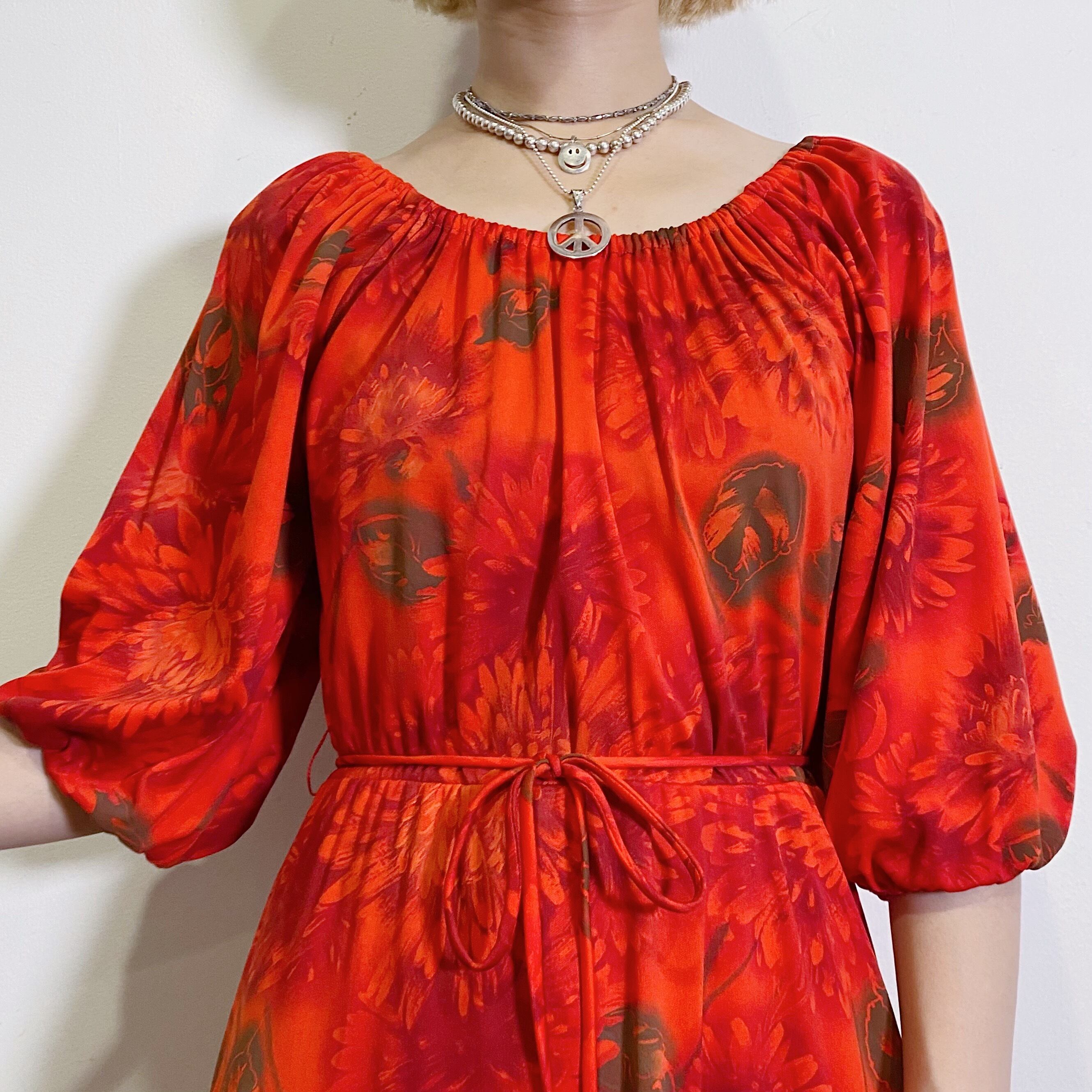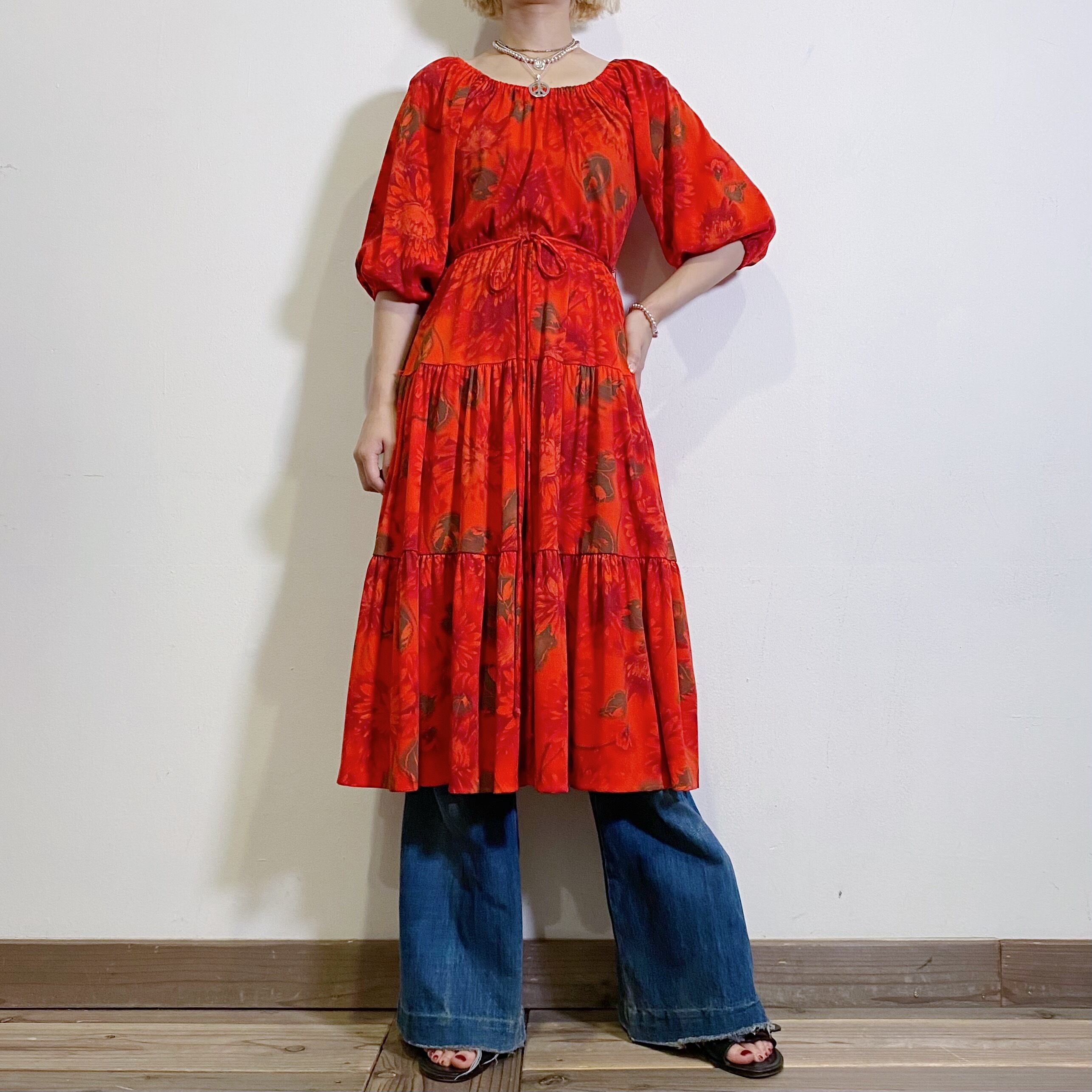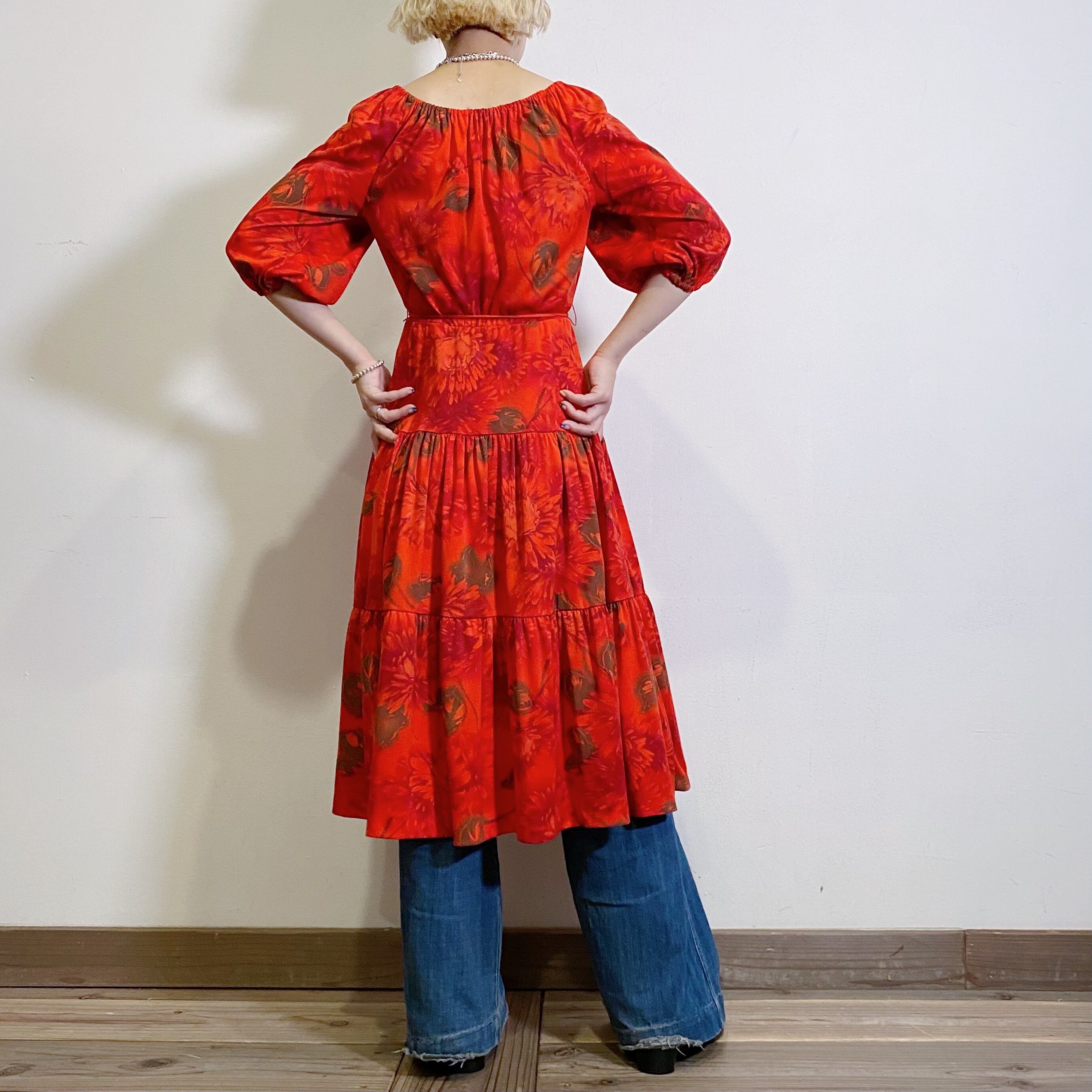 赤に茶色の花柄が可愛い、70年代の五分袖ワンピースです。