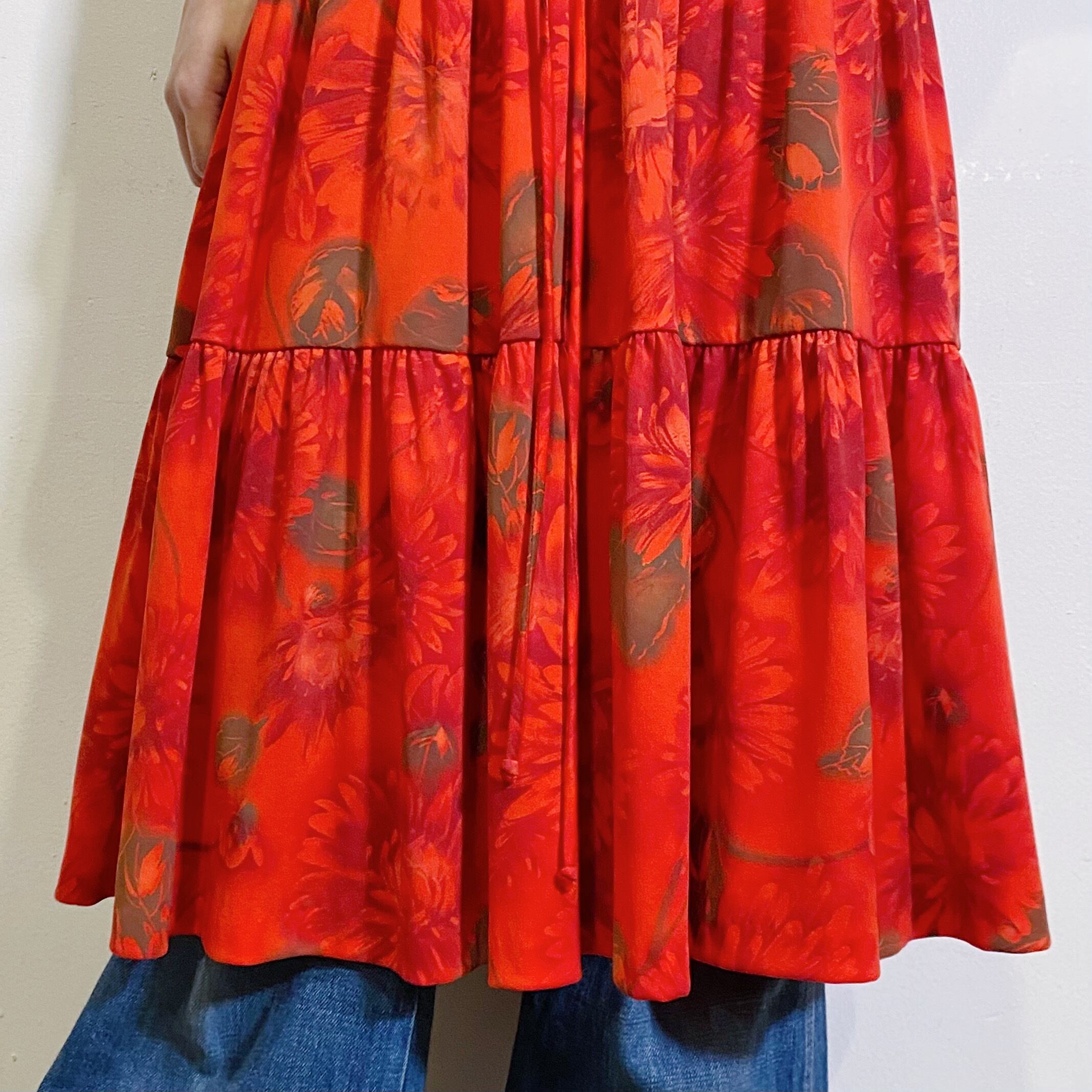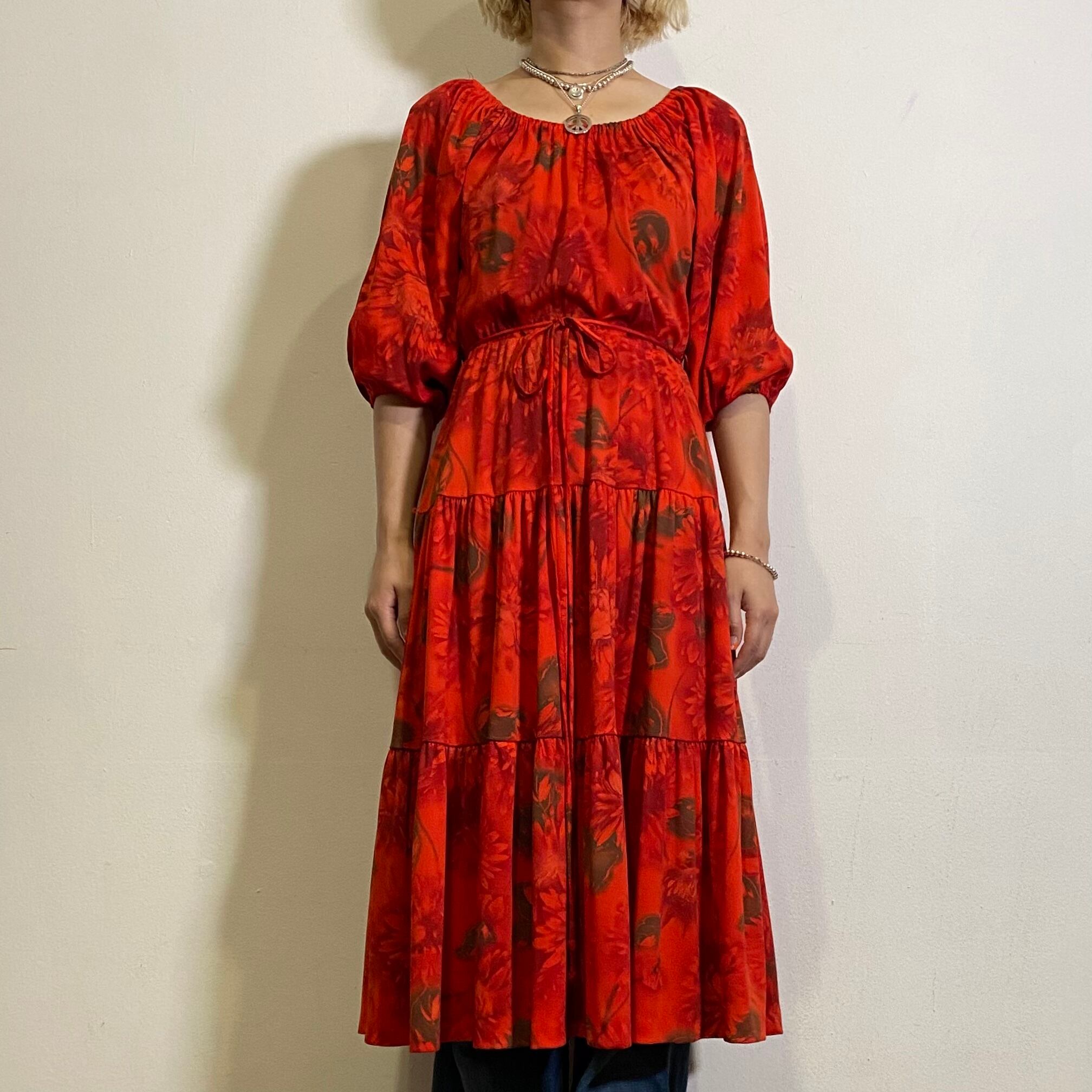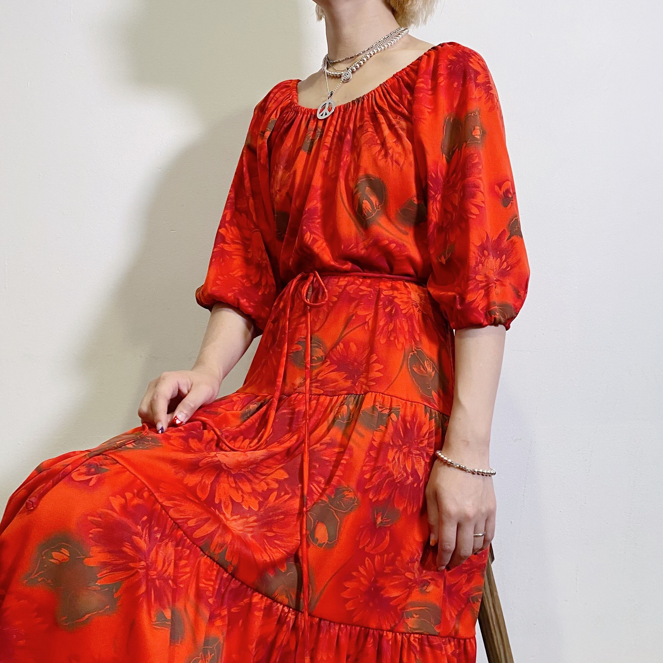 赤に茶色の花柄が可愛い、70年代の五分袖ワンピースです。