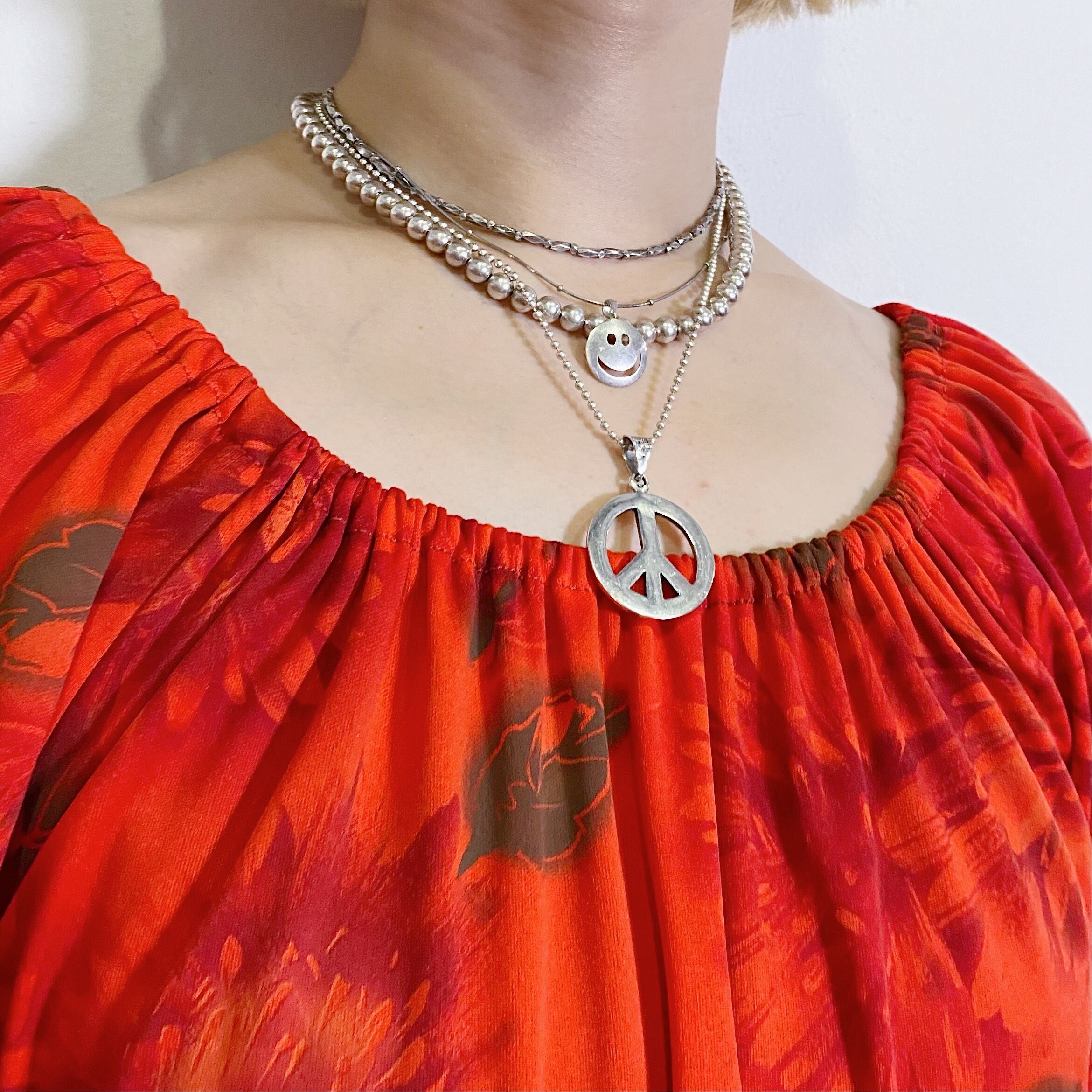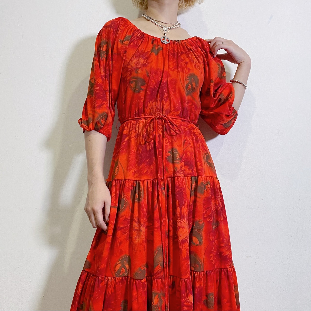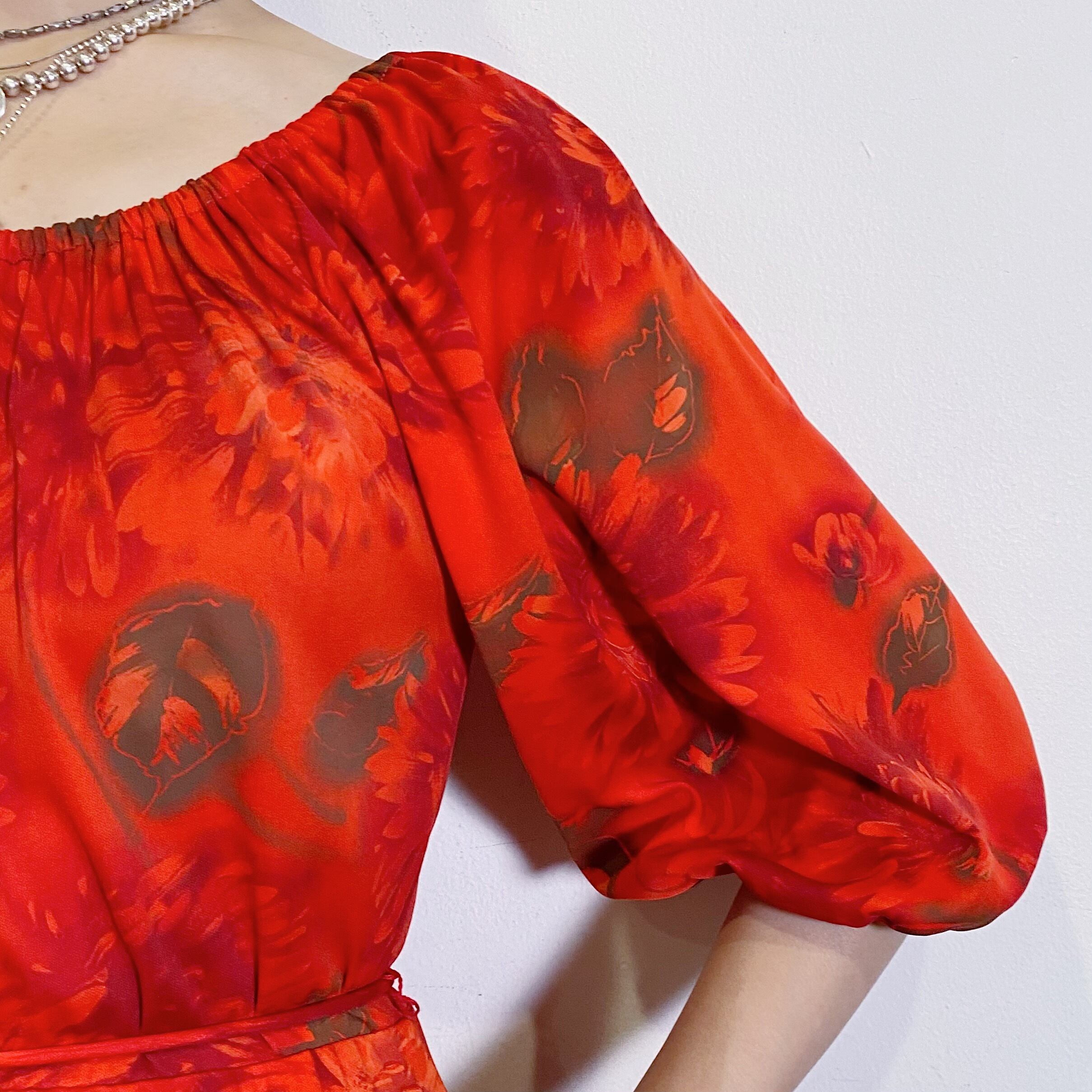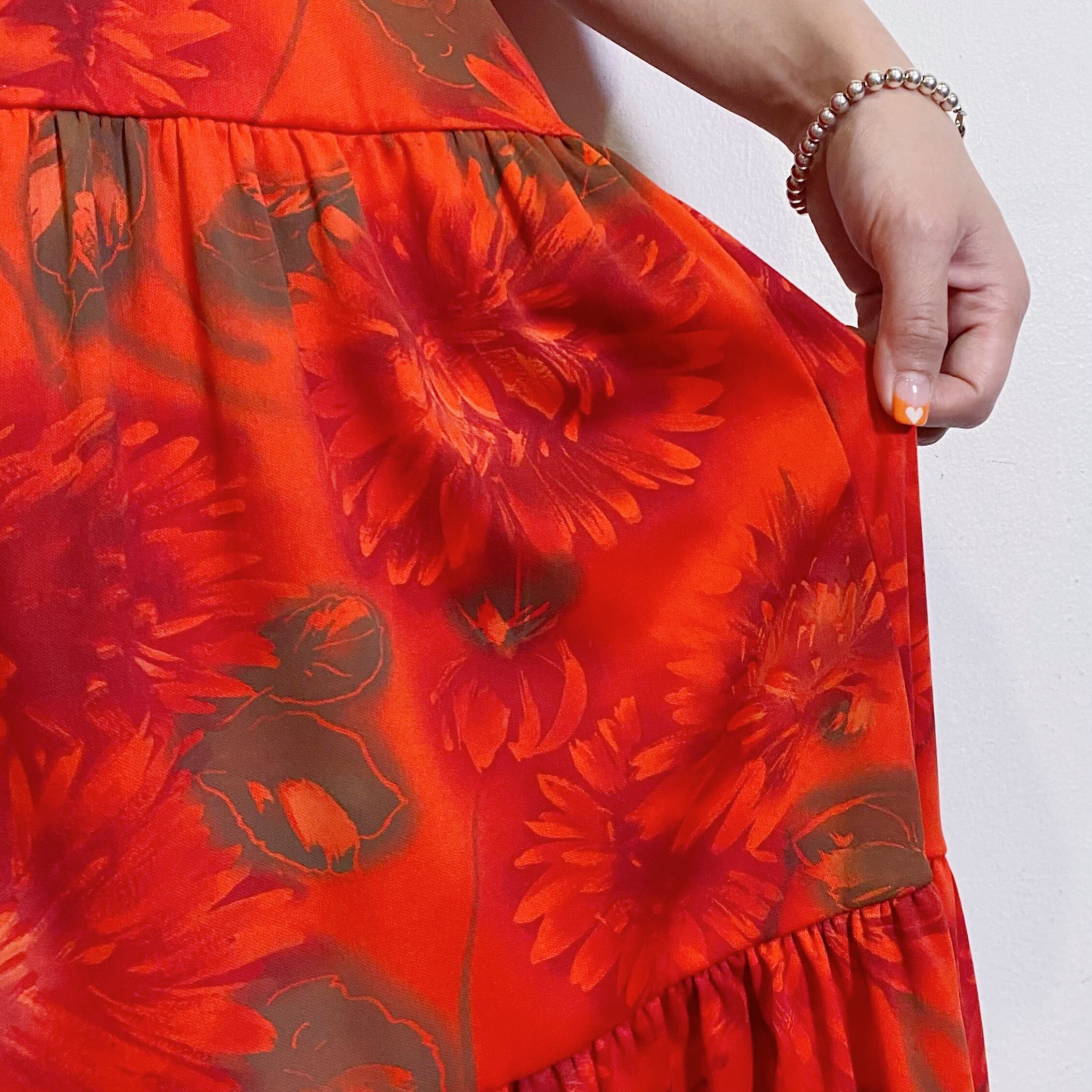 赤に茶色の花柄が可愛い、70年代の五分袖ワンピースです。