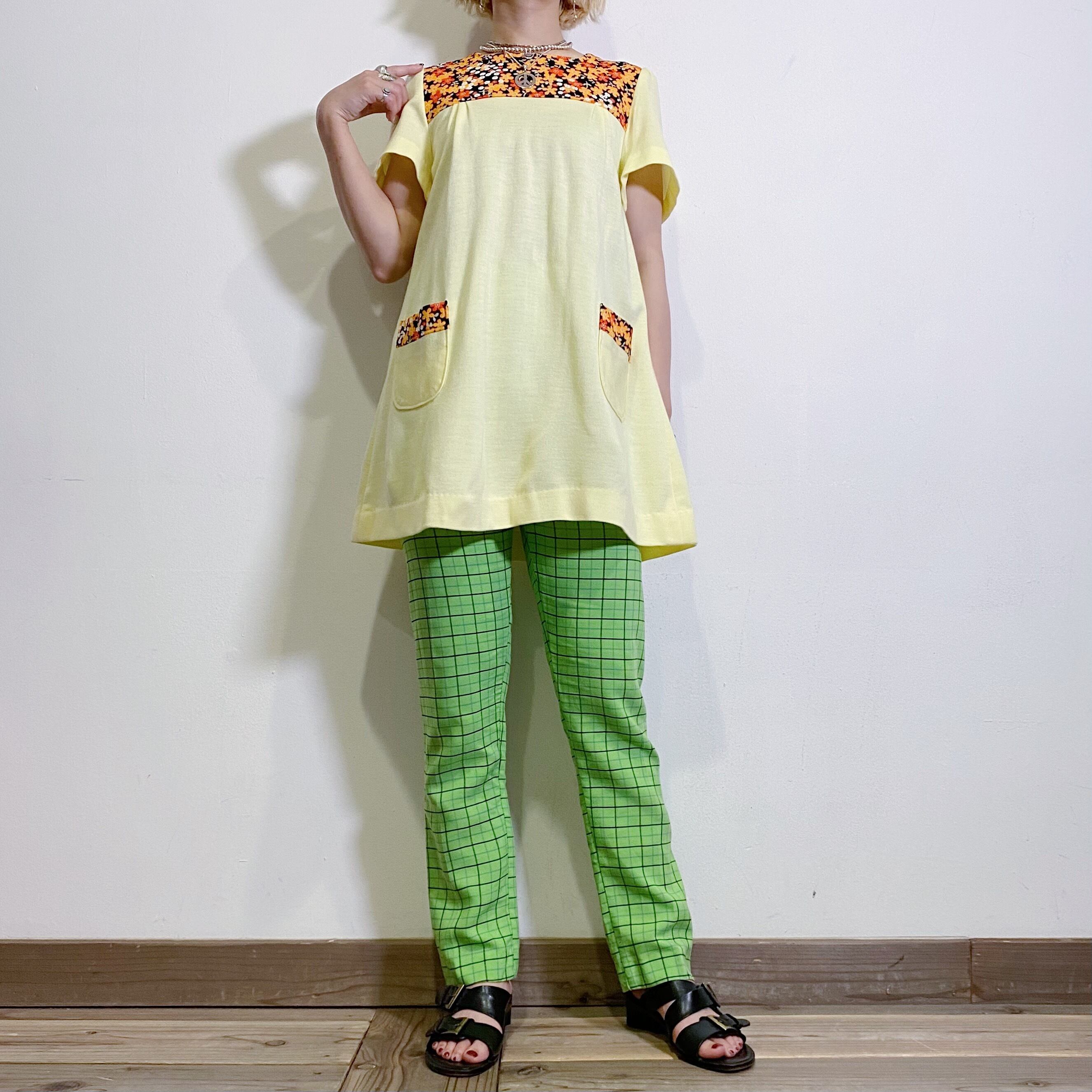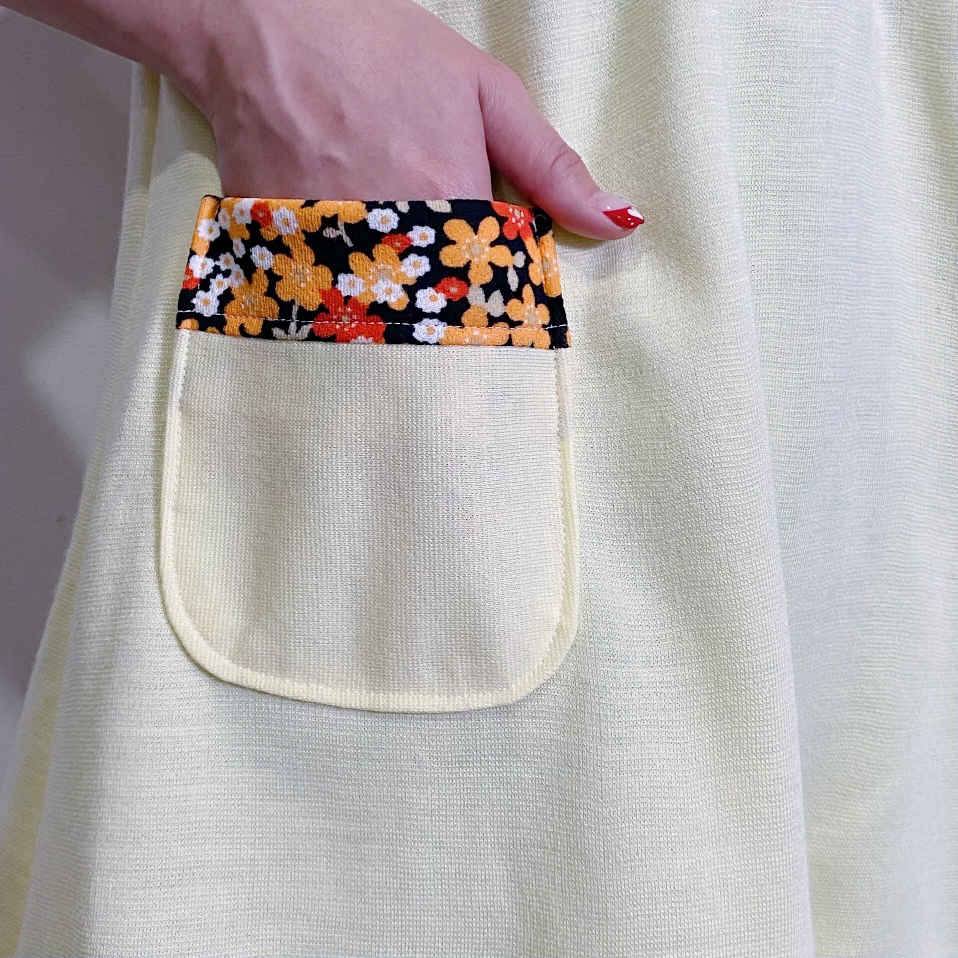 淡いイエローカラーに花柄の切り替えが可愛い、70年代の半袖トップスです。