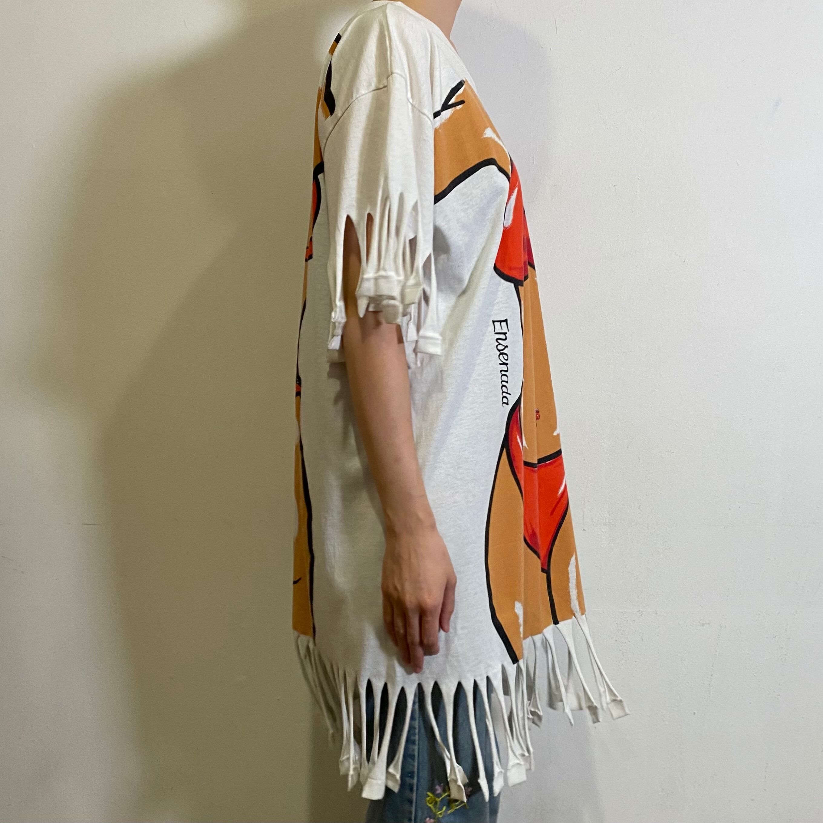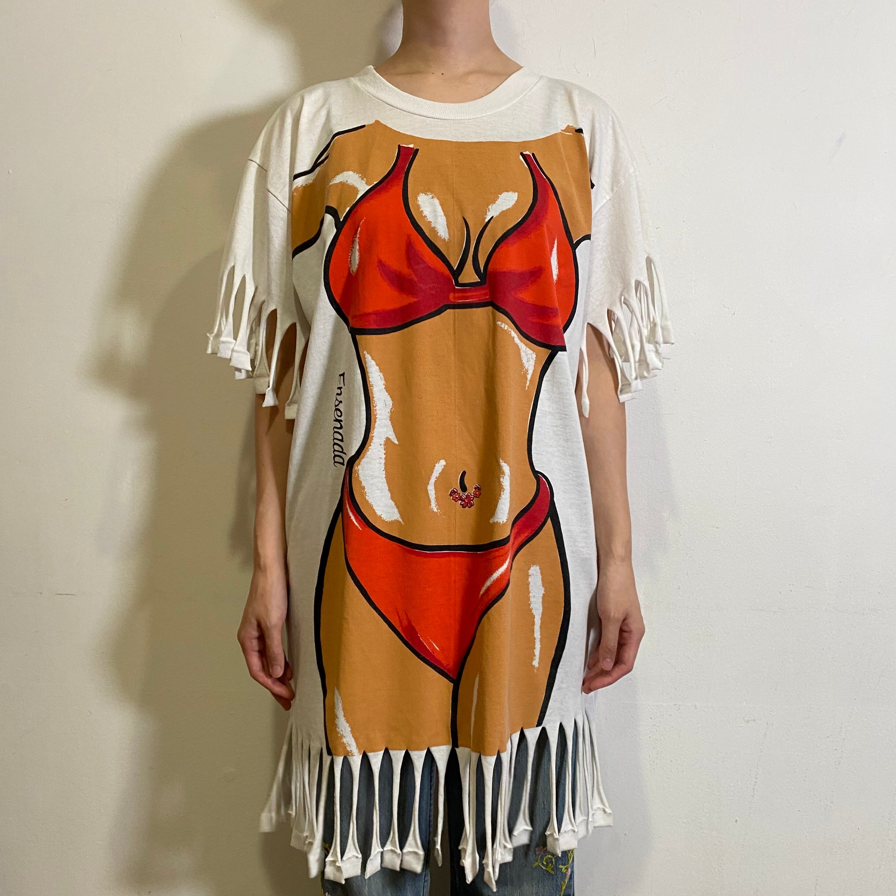 オレンジのビキニを着たナイスバディなだまし絵がなんともユニークな、アメリカヴィンテージらしいロングTシャツです。