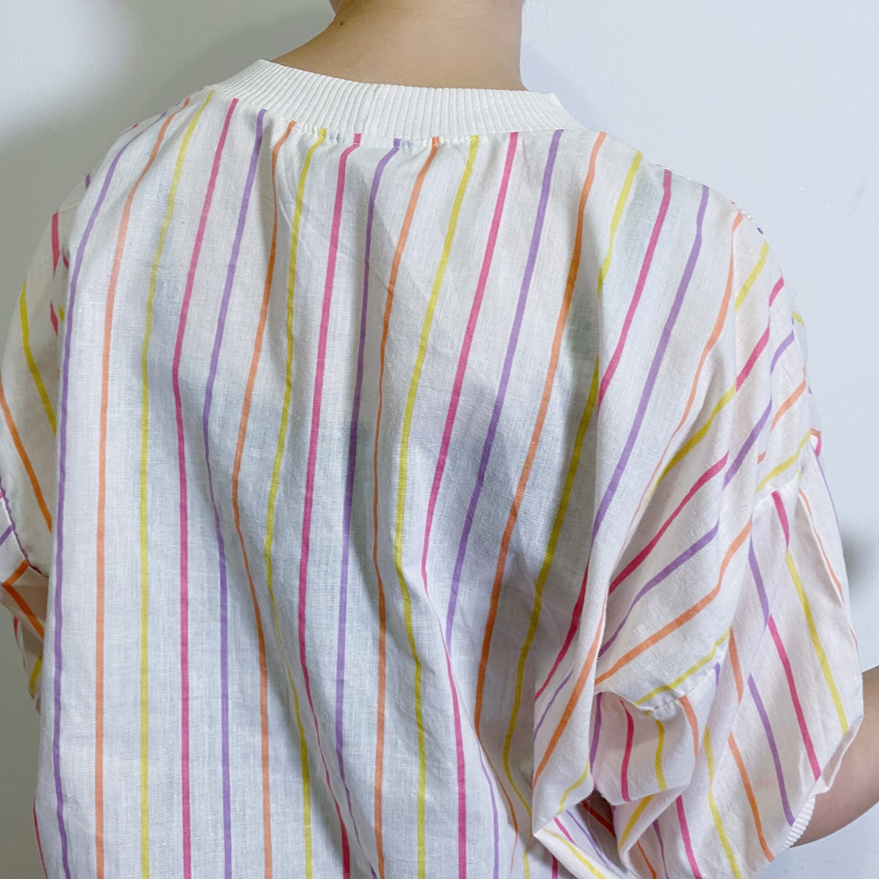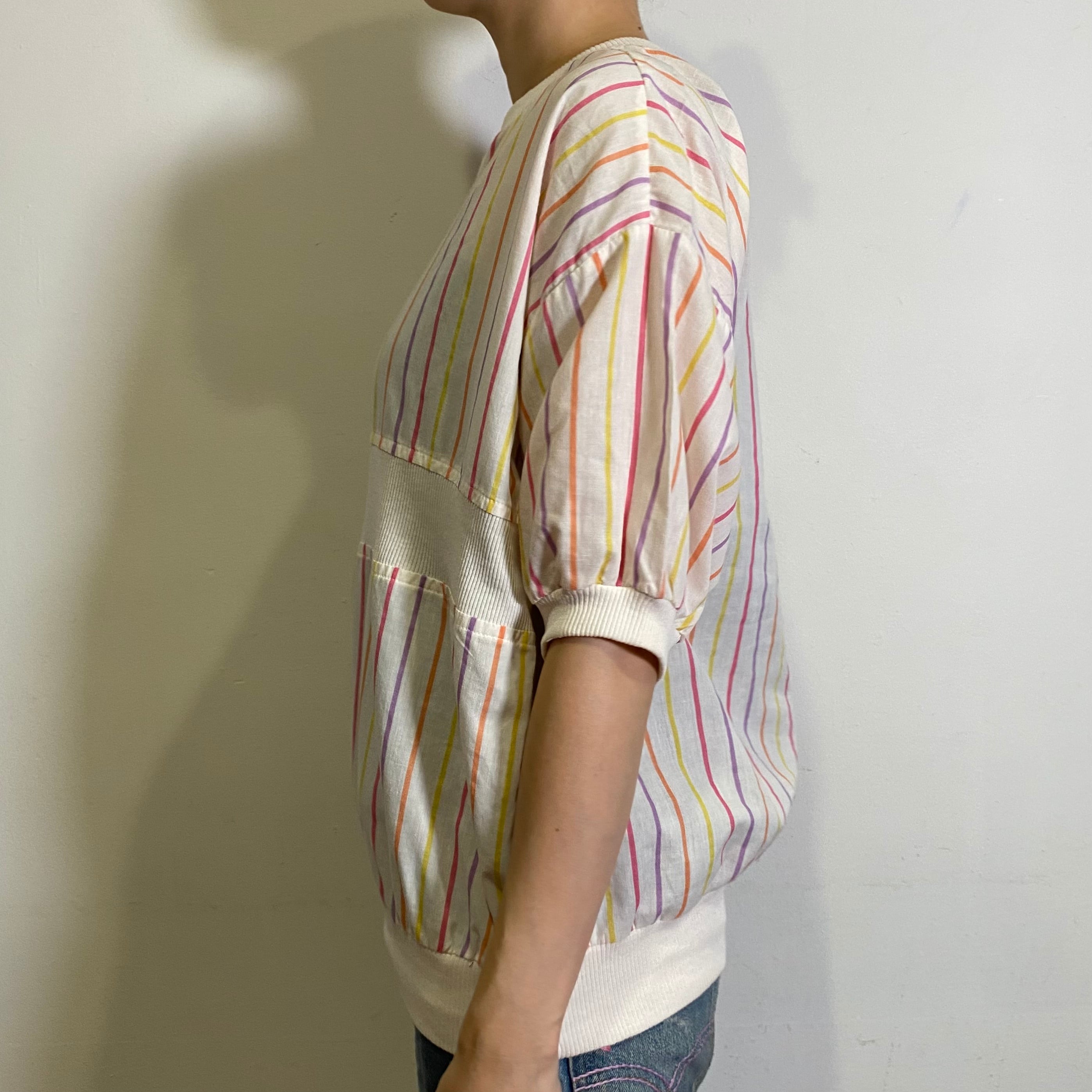 白地にカラフルなストライプが可愛い、80年代のプルオーバートップスです。