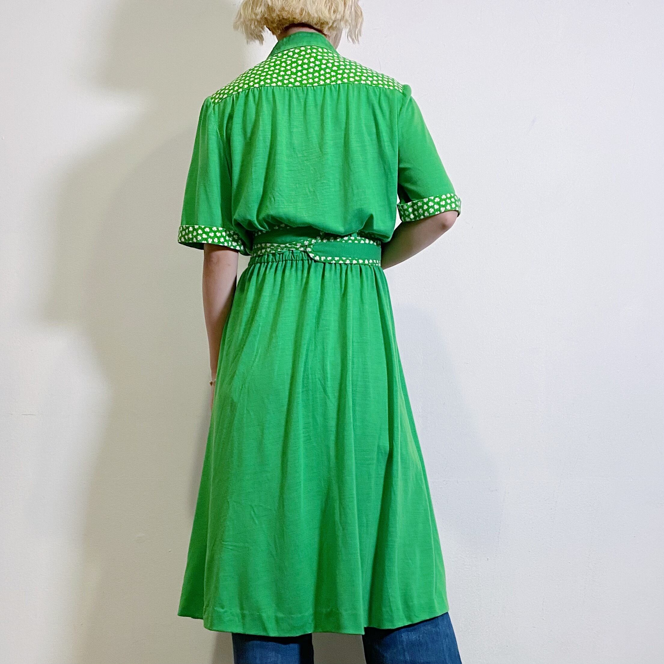 ぱっきりとした緑色にクローバーモチーフの切り替えが可愛い、70年代のワンピースです。