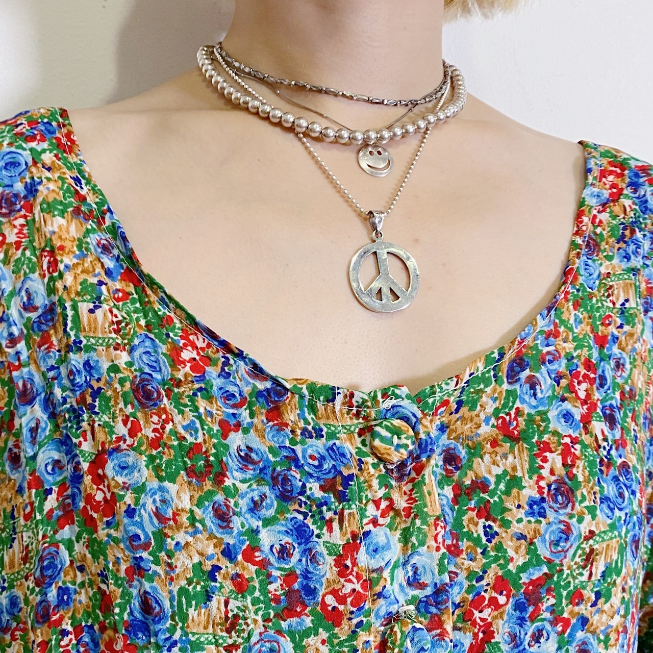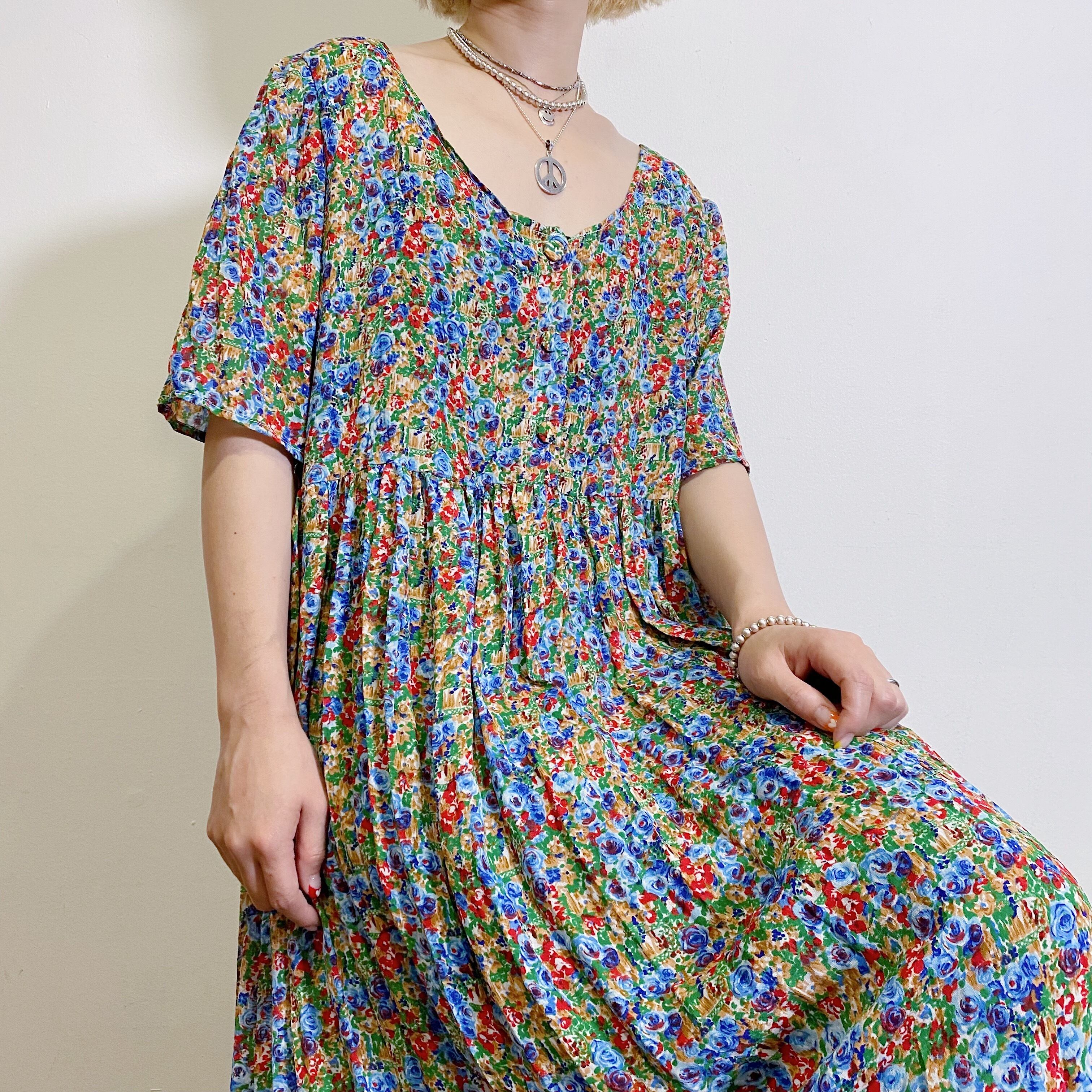 しゃわっとした素材にカラフルな花柄が可愛い、80~90年代のワンピースです。