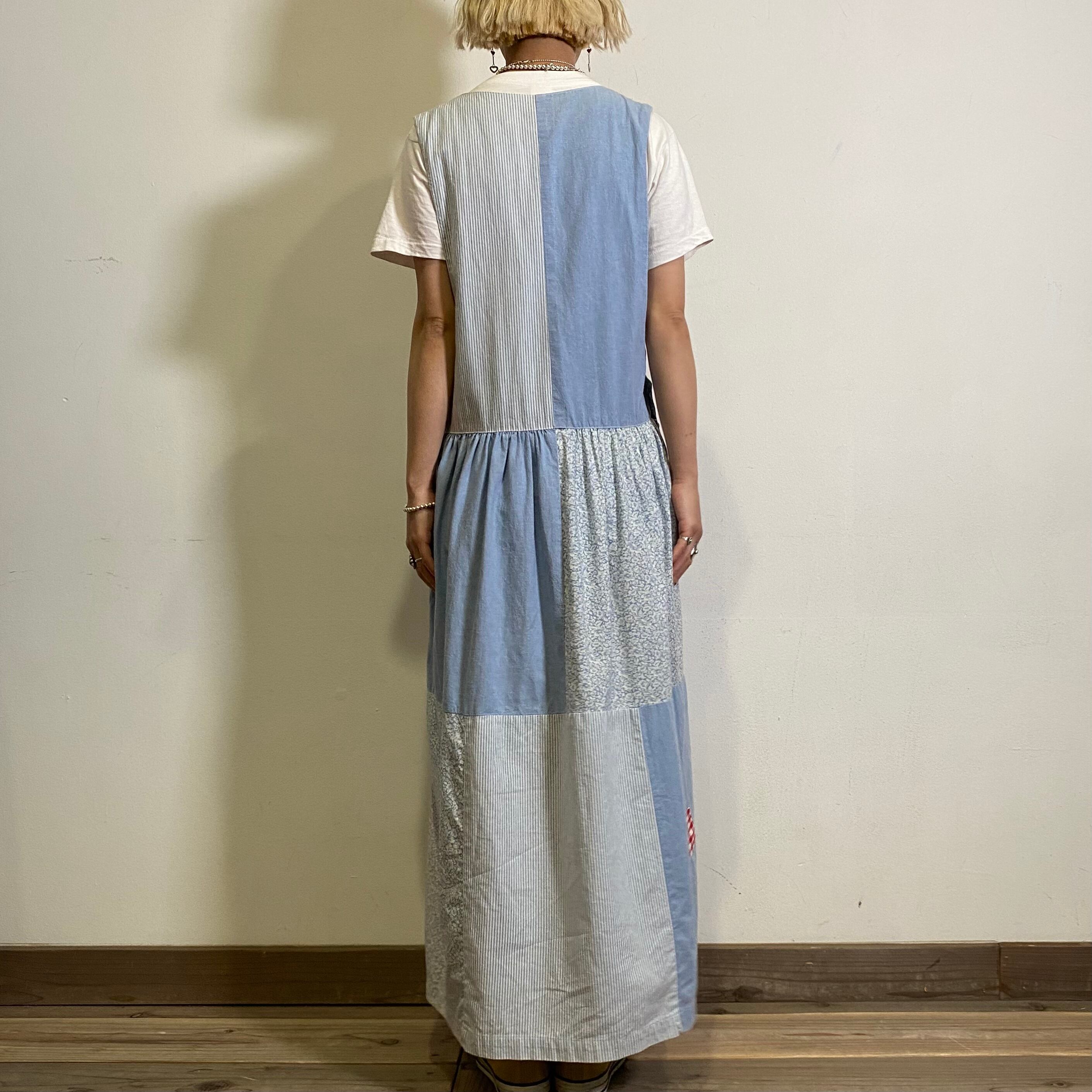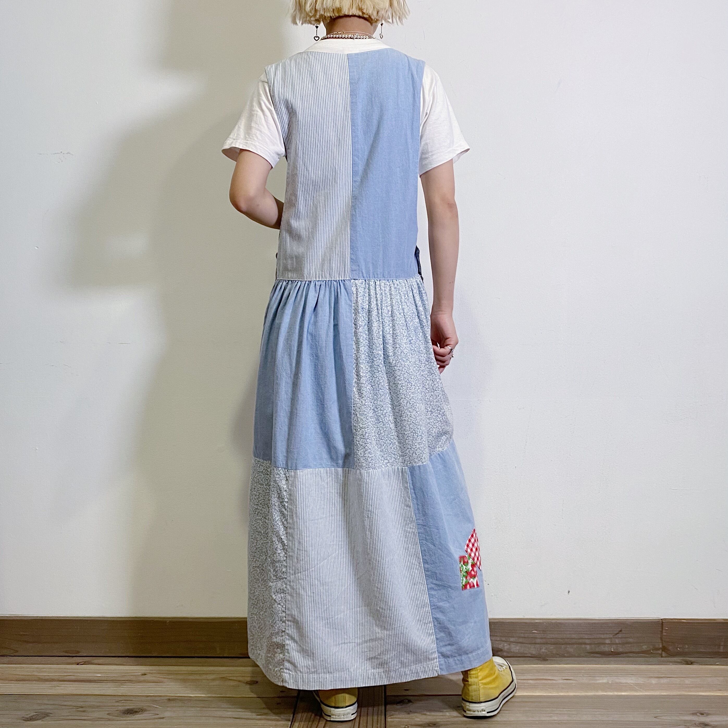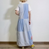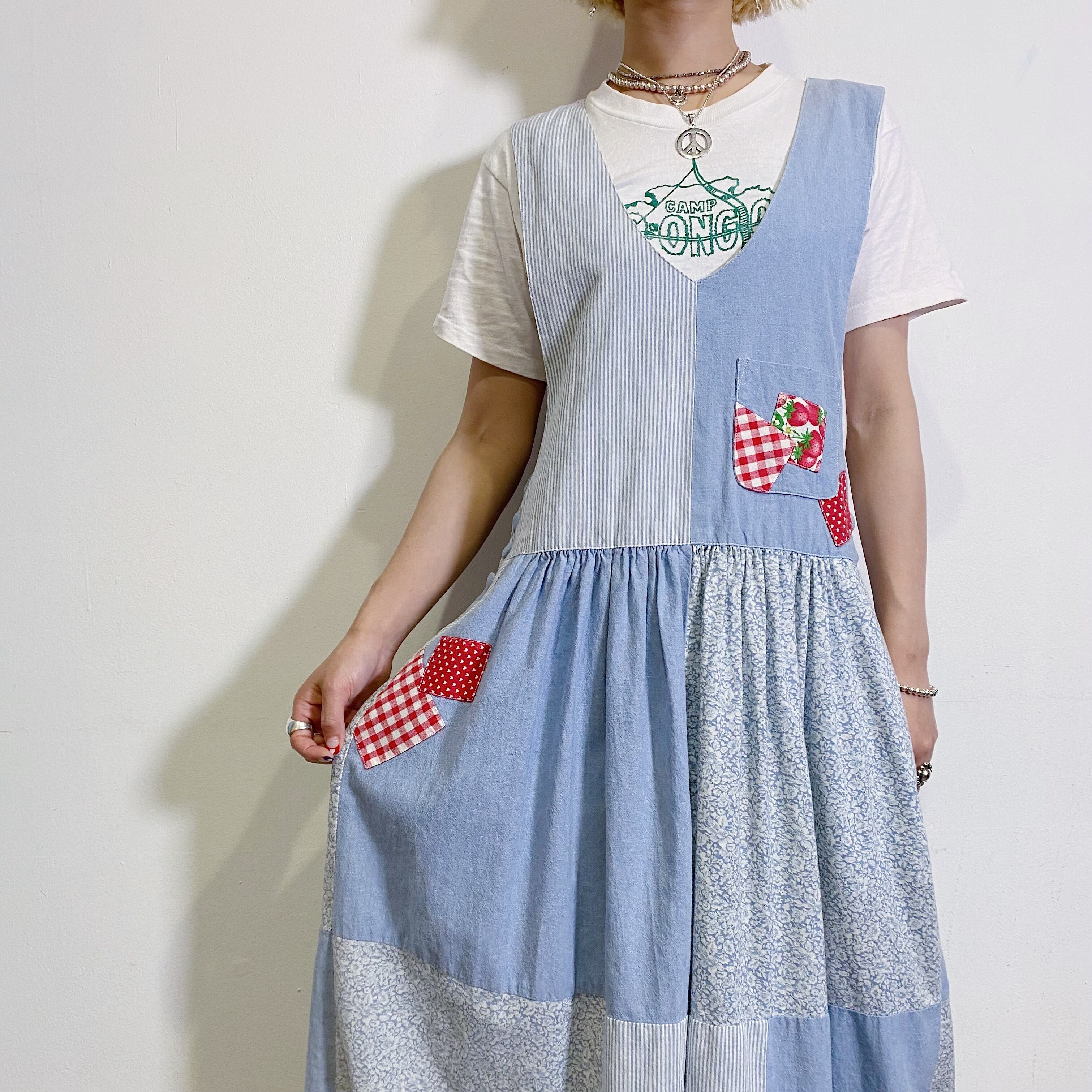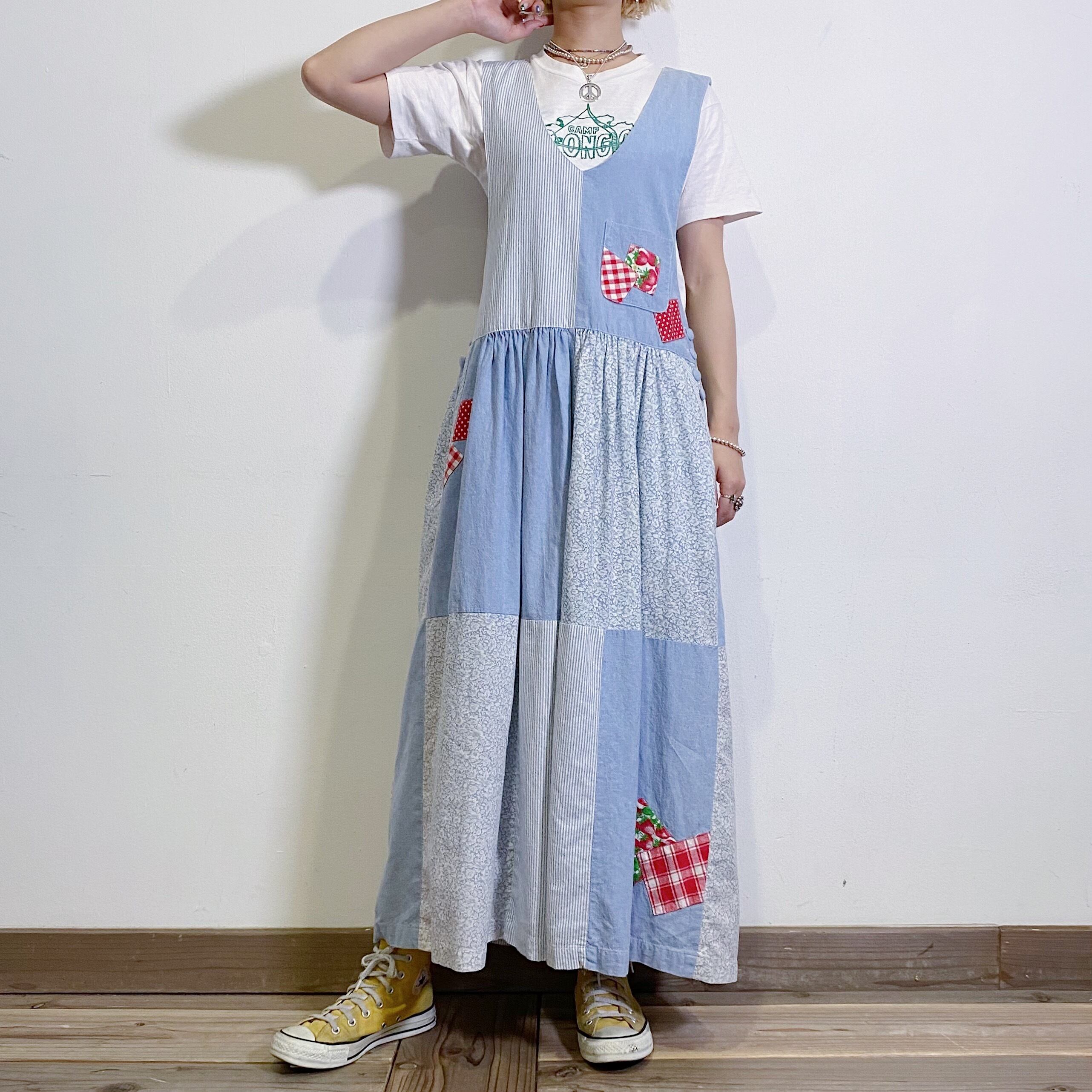水色の花柄パッチワークに苺モチーフのパッチが可愛いジャンパーワンピースです。