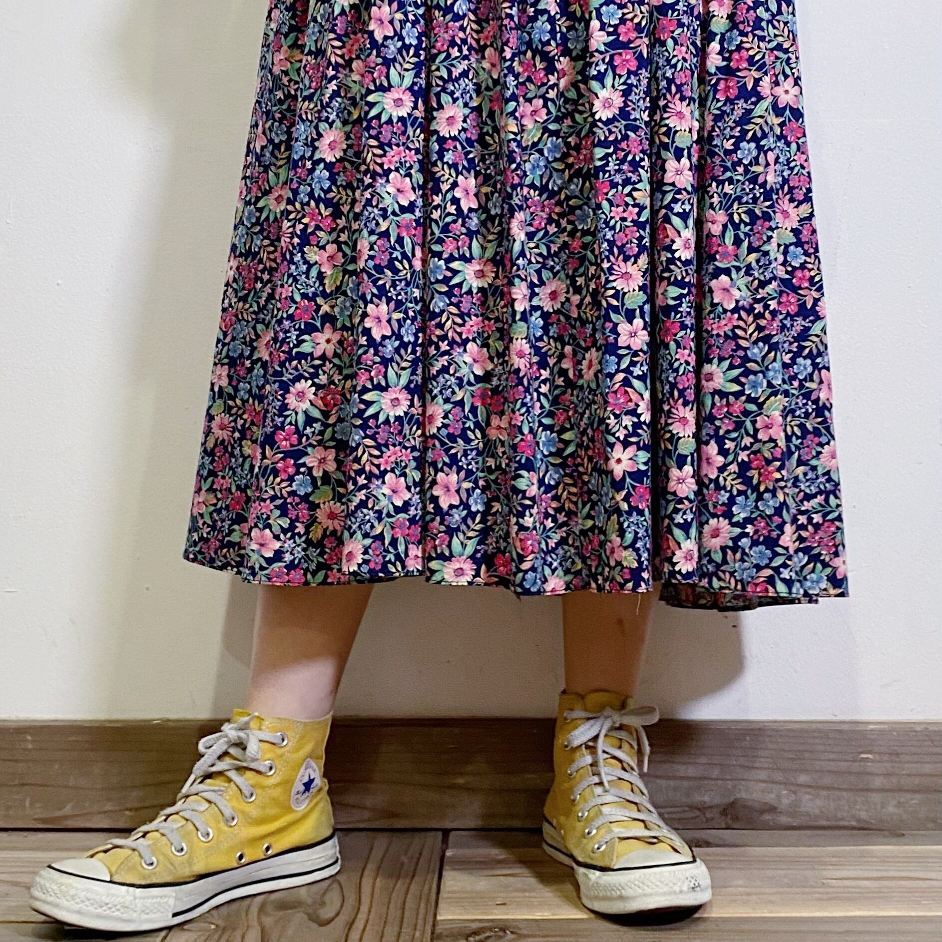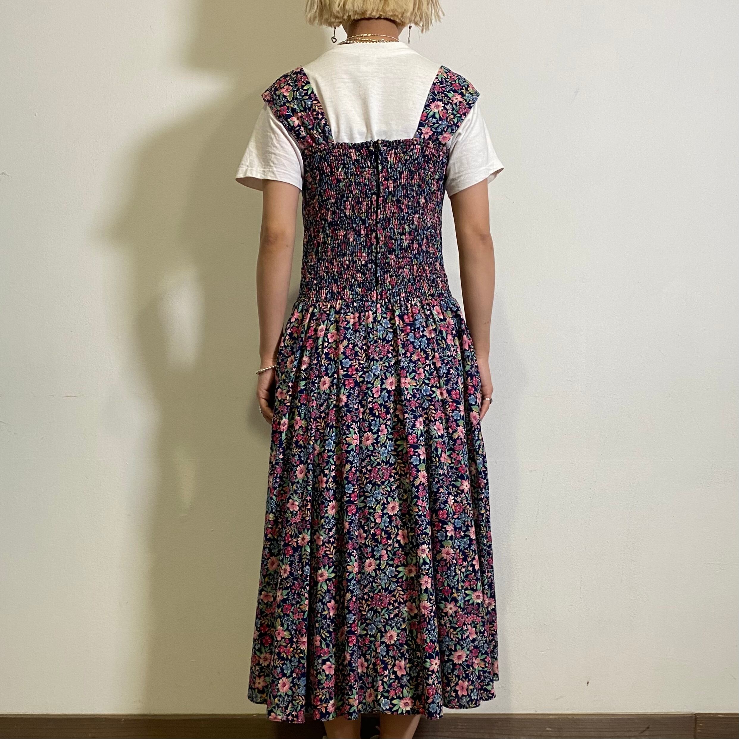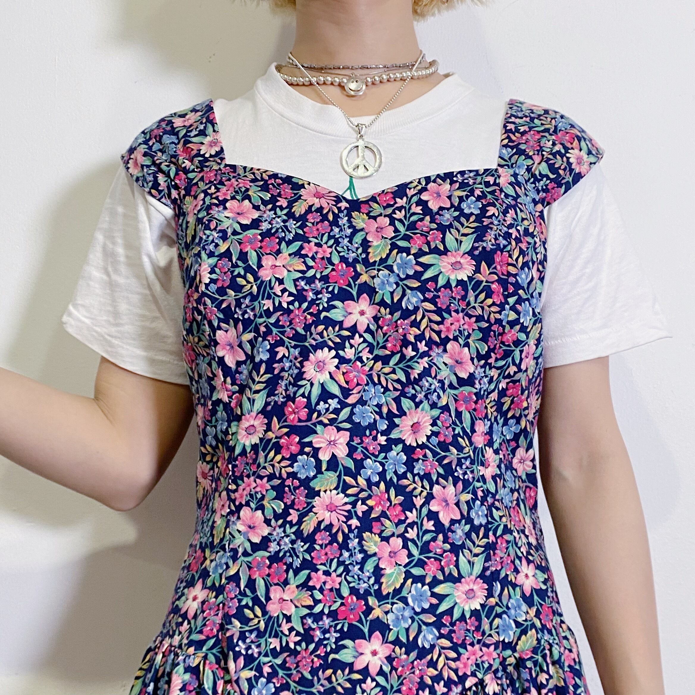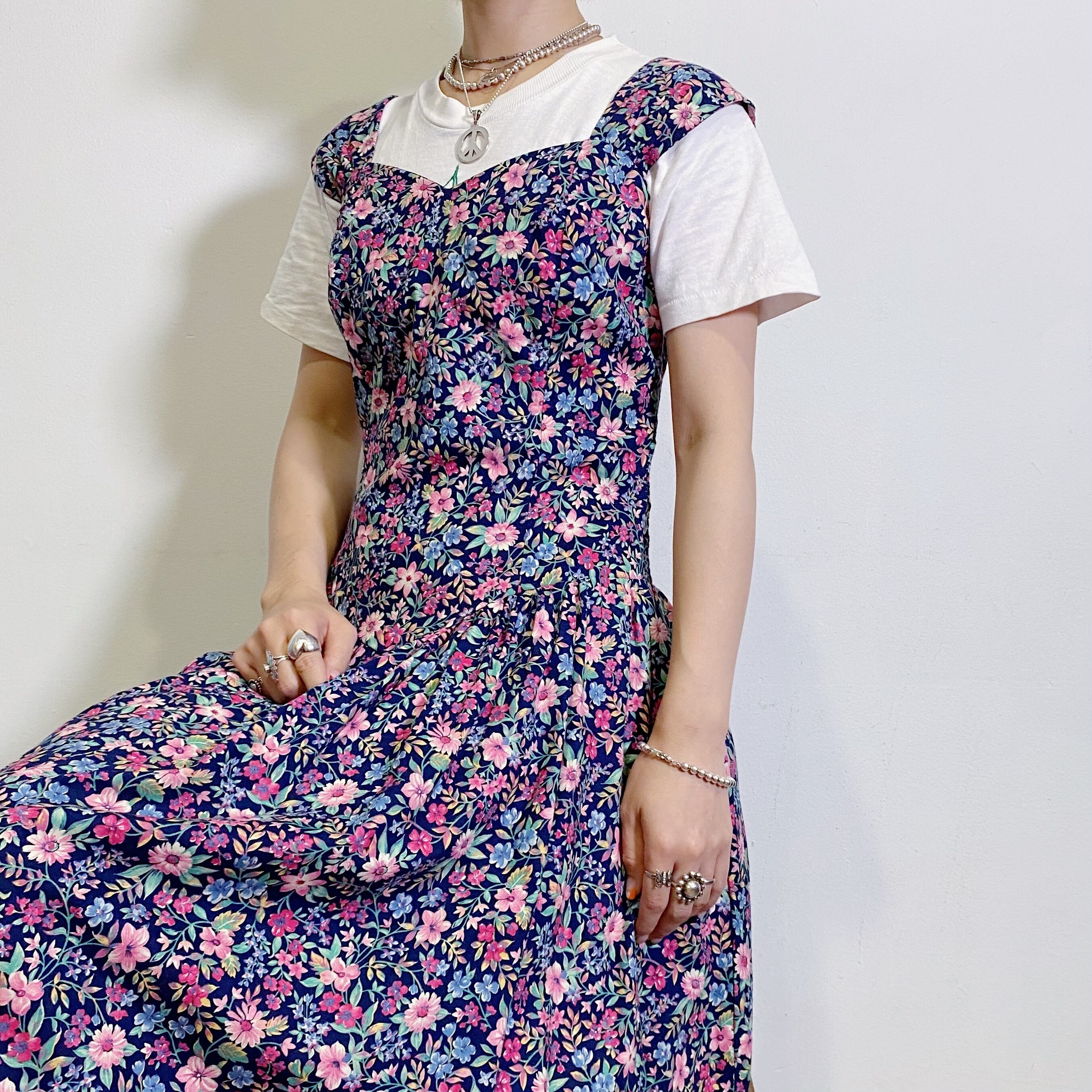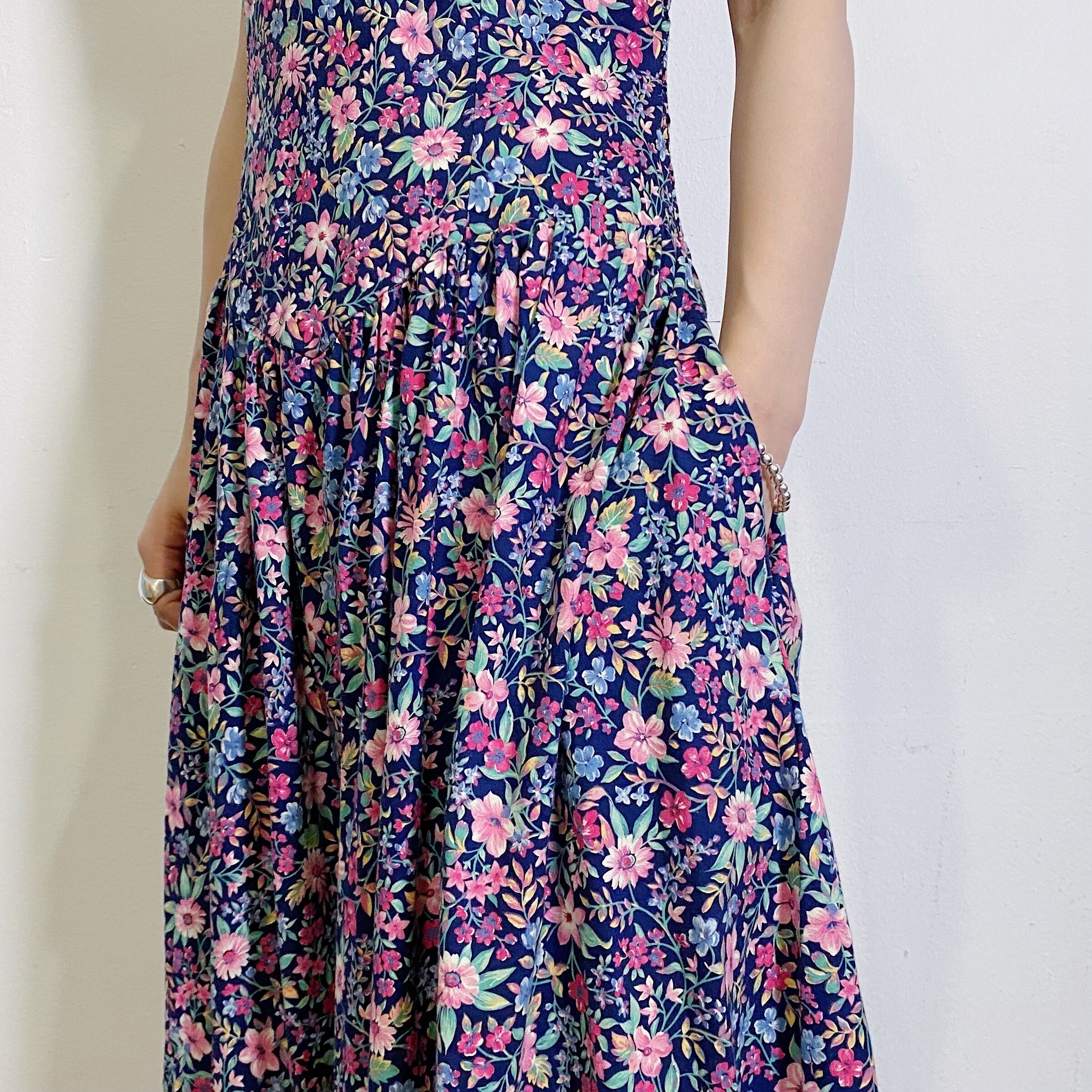 ネイビーベースに広がったリバティプリントが可愛い、80年代のコットンワンピースです。