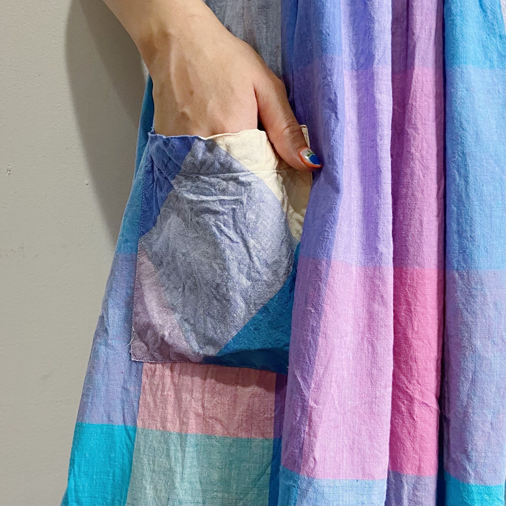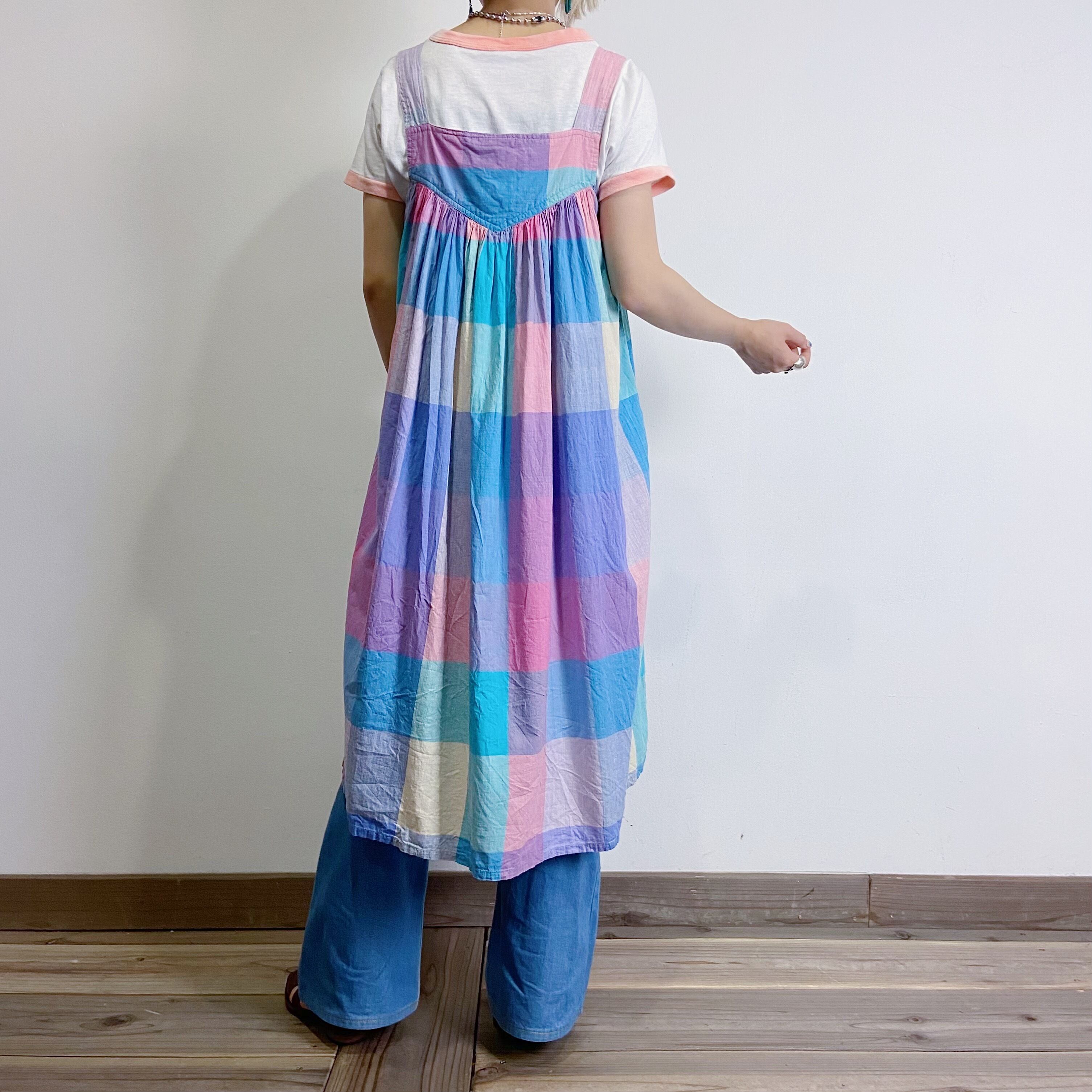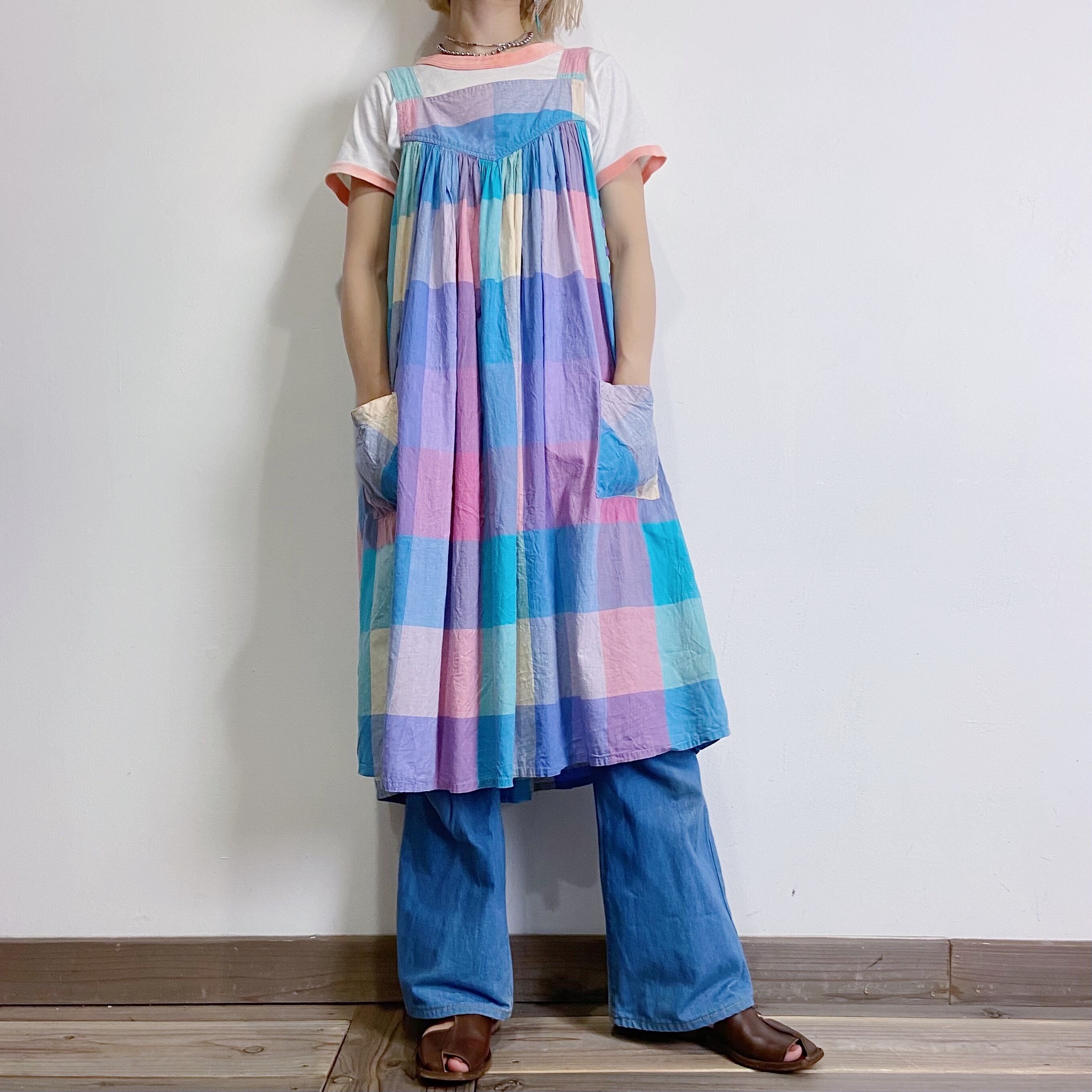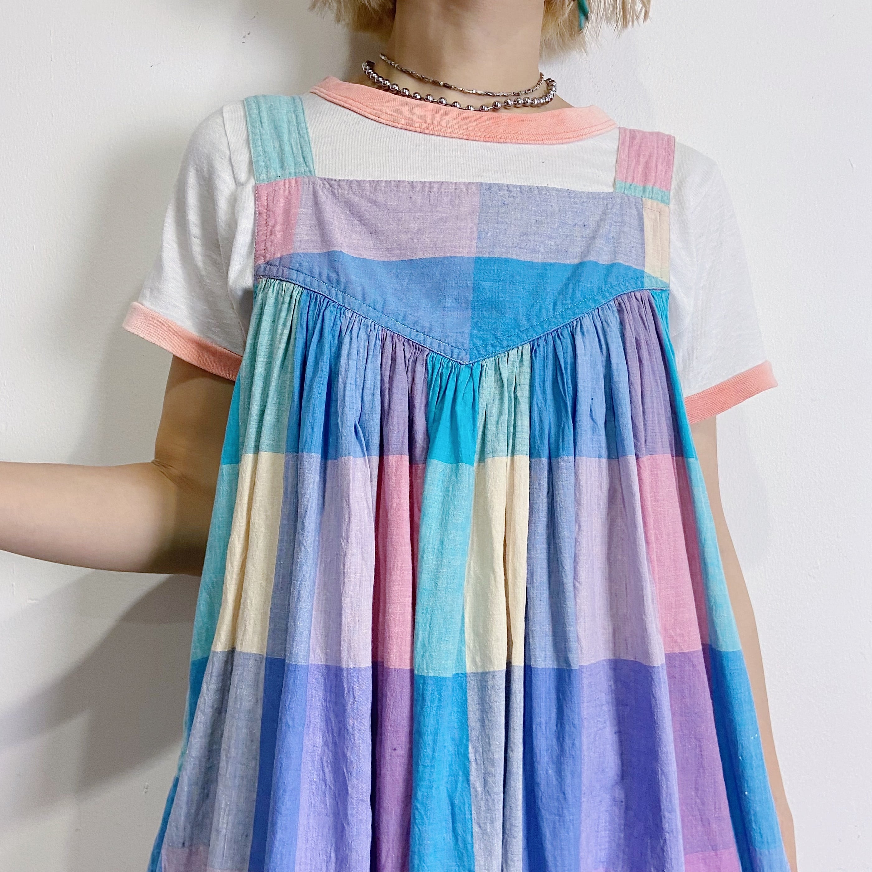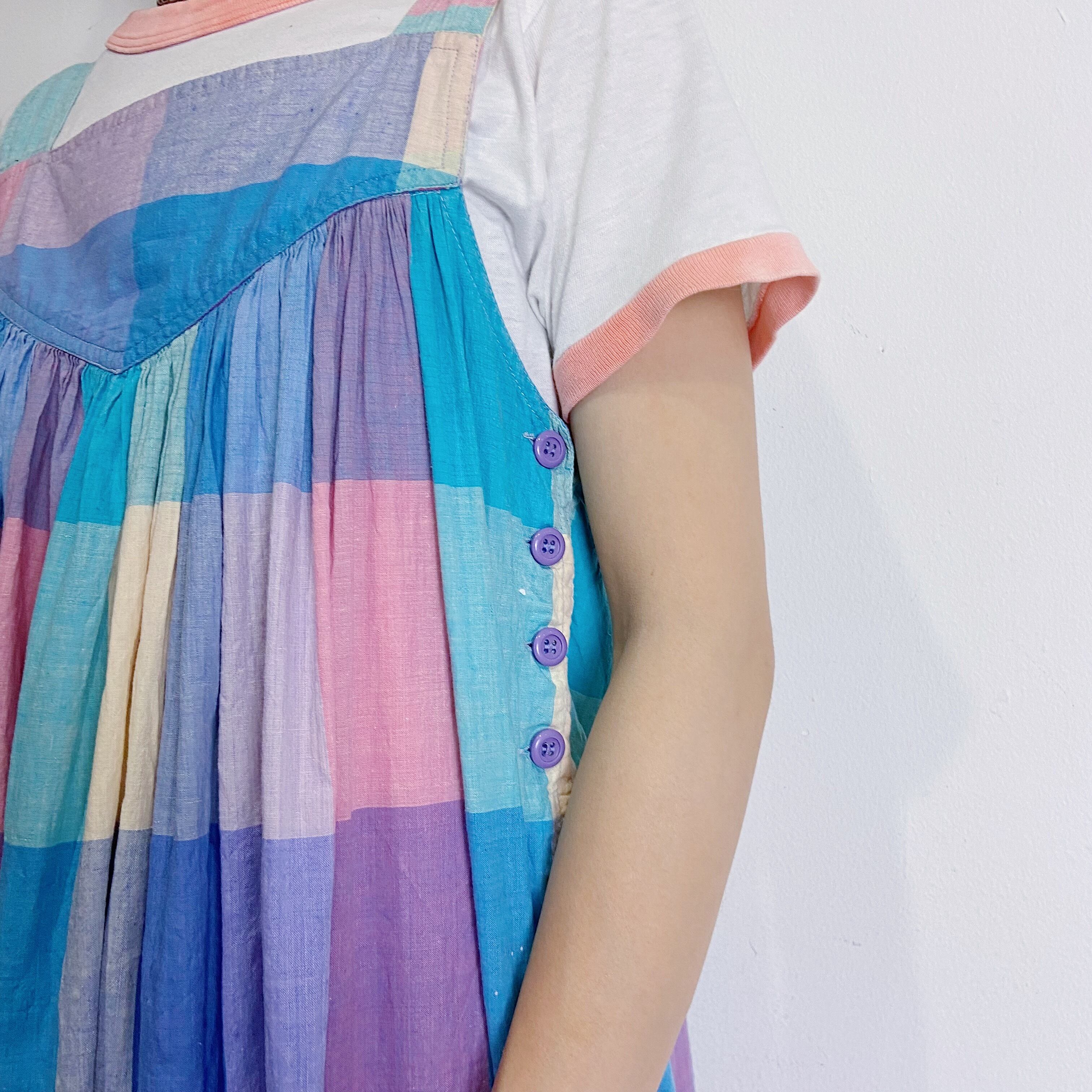 カラフルなパステルカラーのチェックが可愛い、80年代のノースリーブワンピースです。