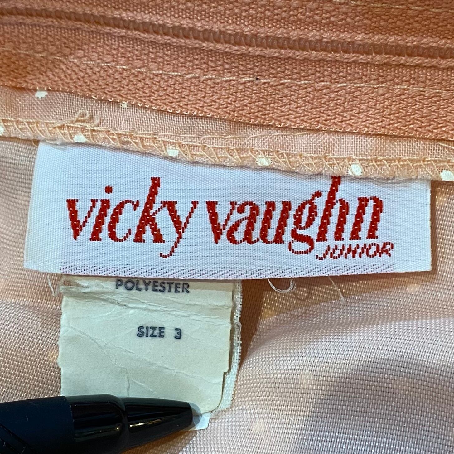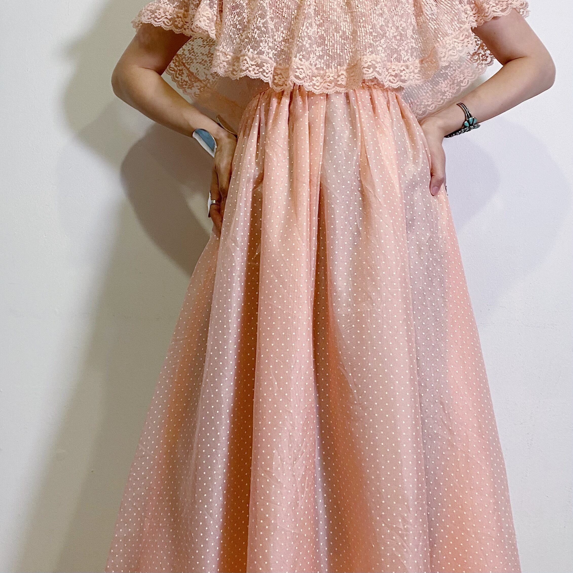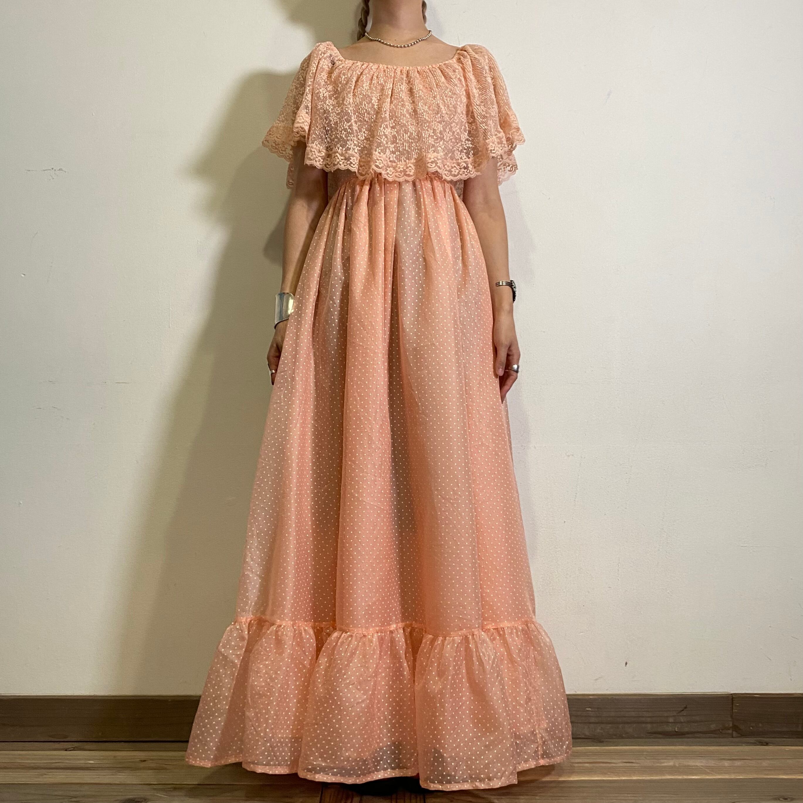サーモンピンクにピンドット、首回りのレースと可愛いが詰まった70年代のロングドレスです。