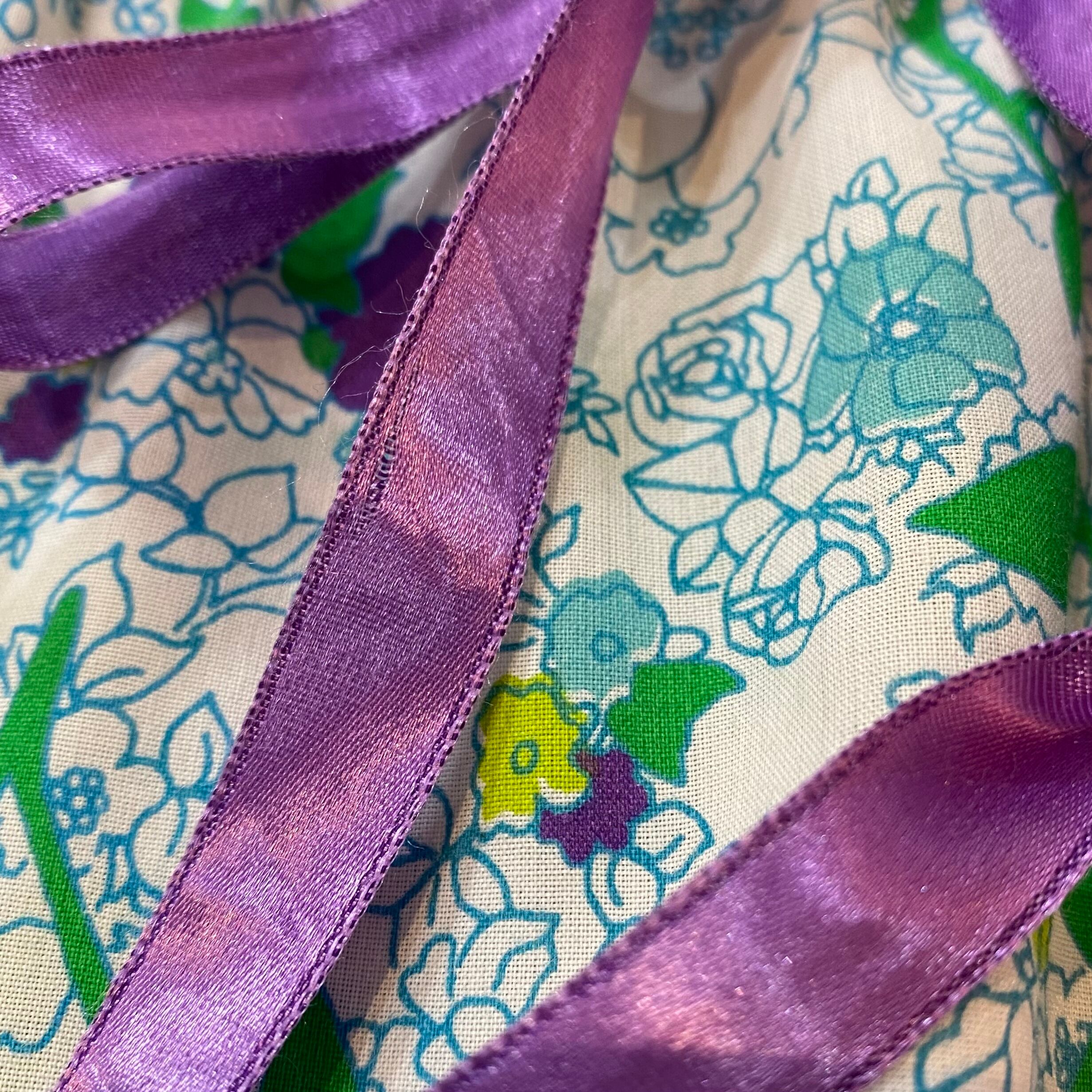 白地に紫や緑、黄色のお花柄が可愛い70年代のコットンワンピースです。