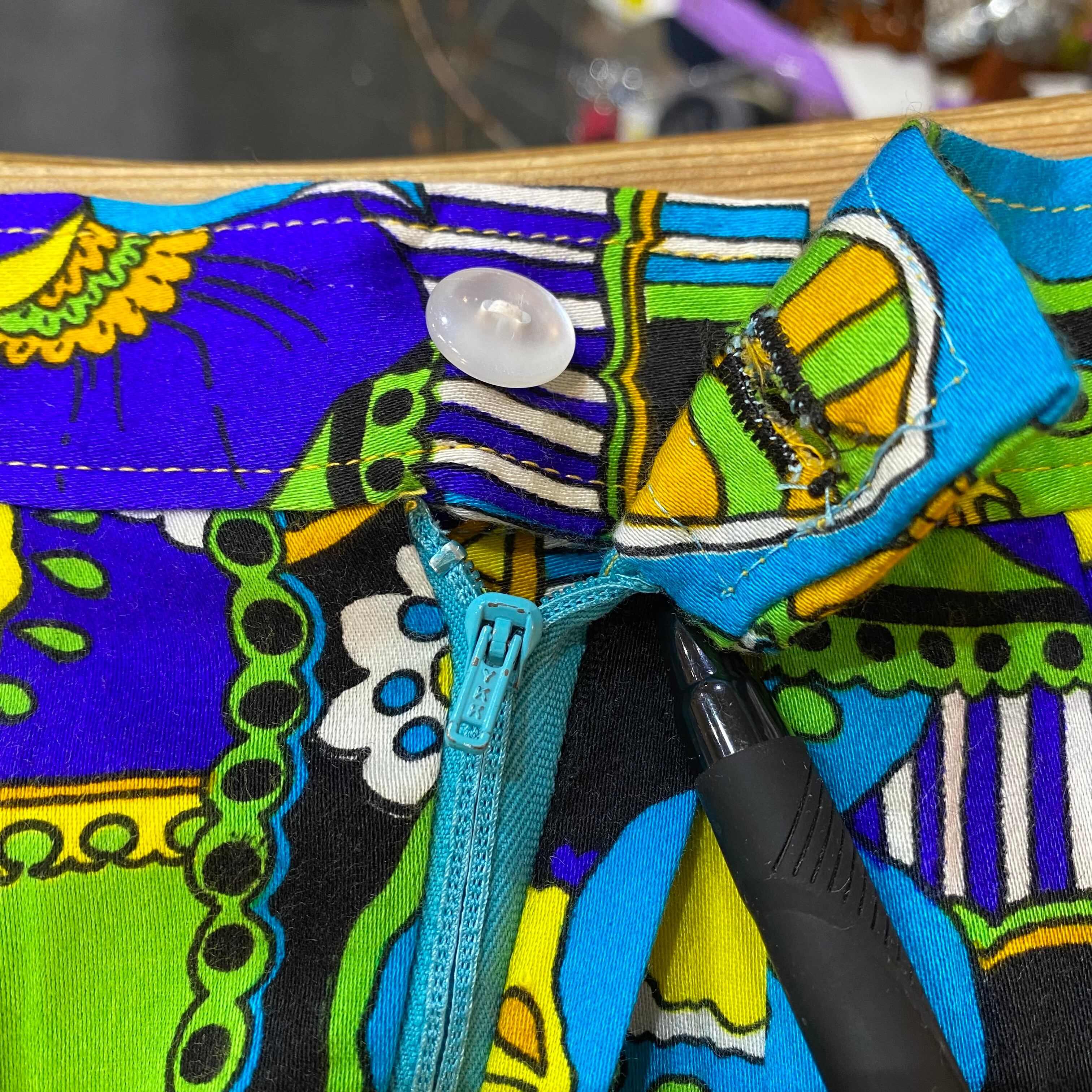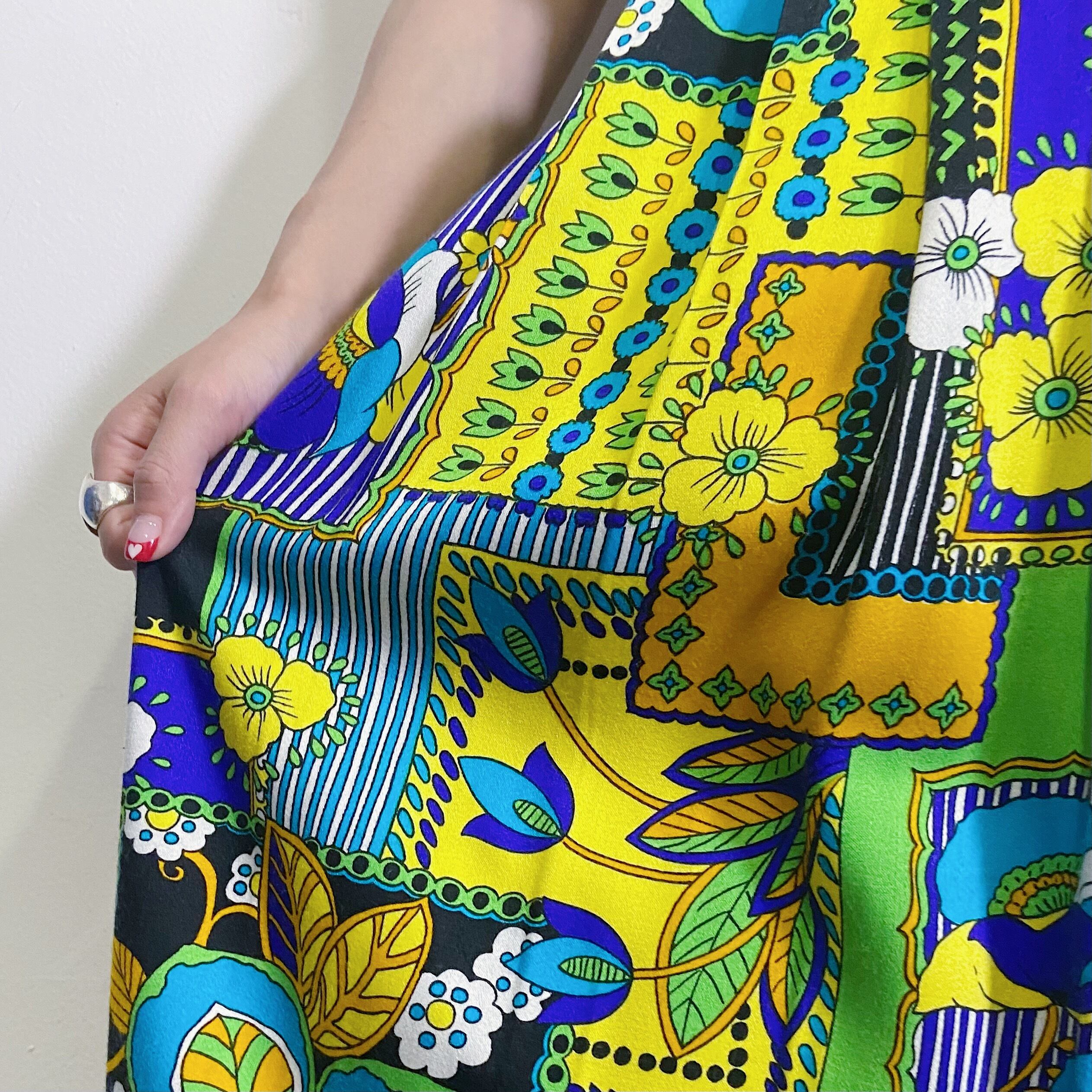 黄色とブルーに色合いが可愛い、70年代ころのミドル丈スカートです。