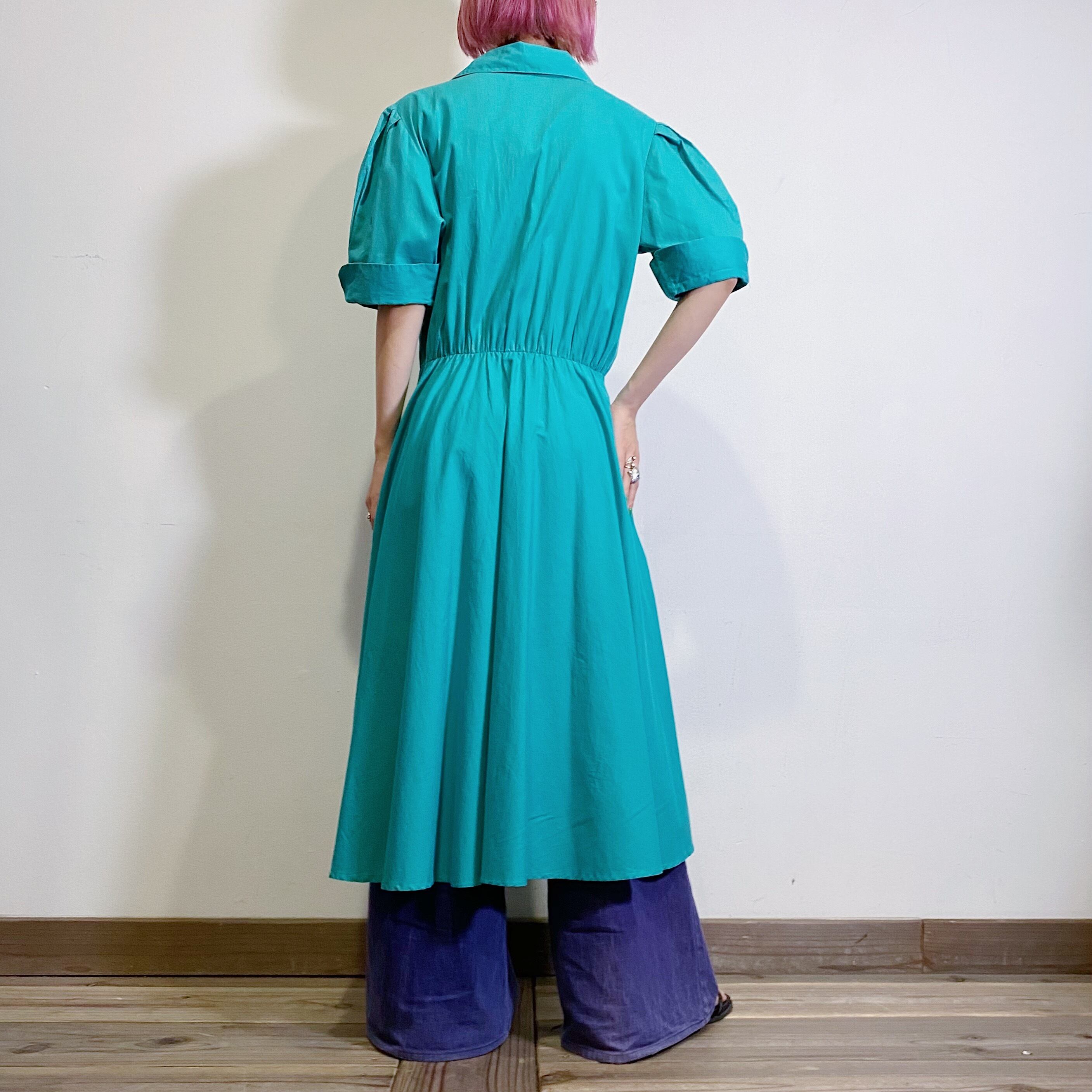 綺麗なグリーンに80年代らしいシルエットが可愛い、シャツ柄ワンピースです。