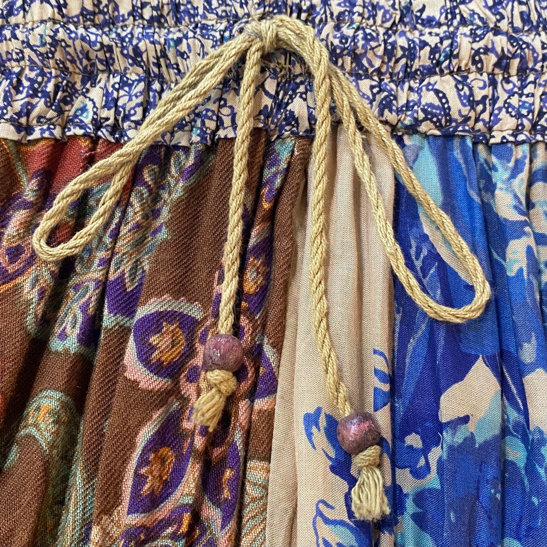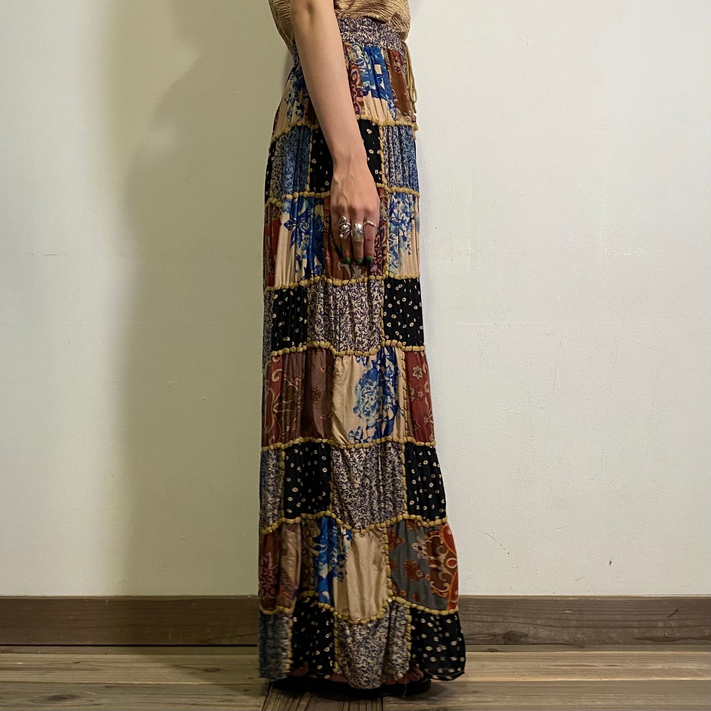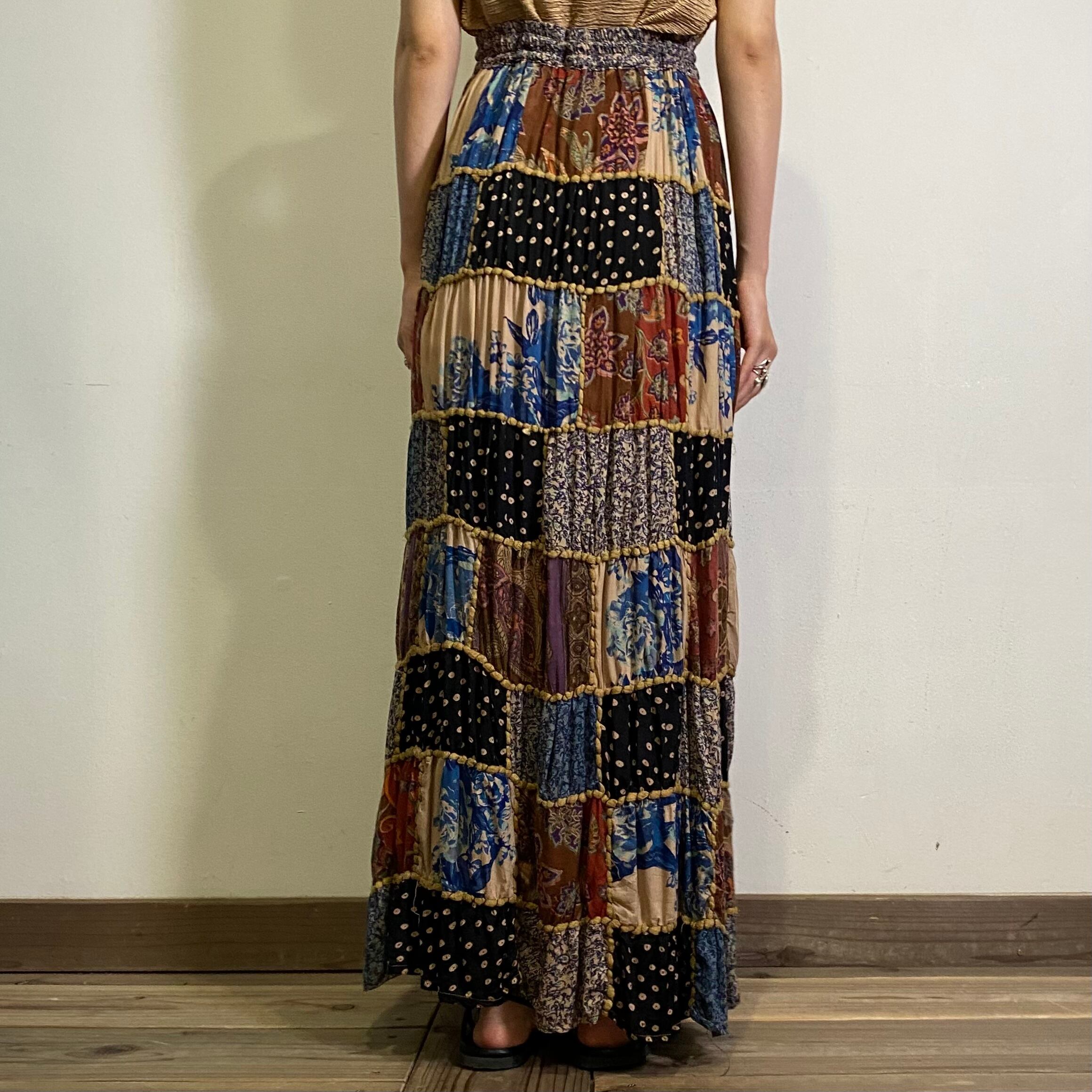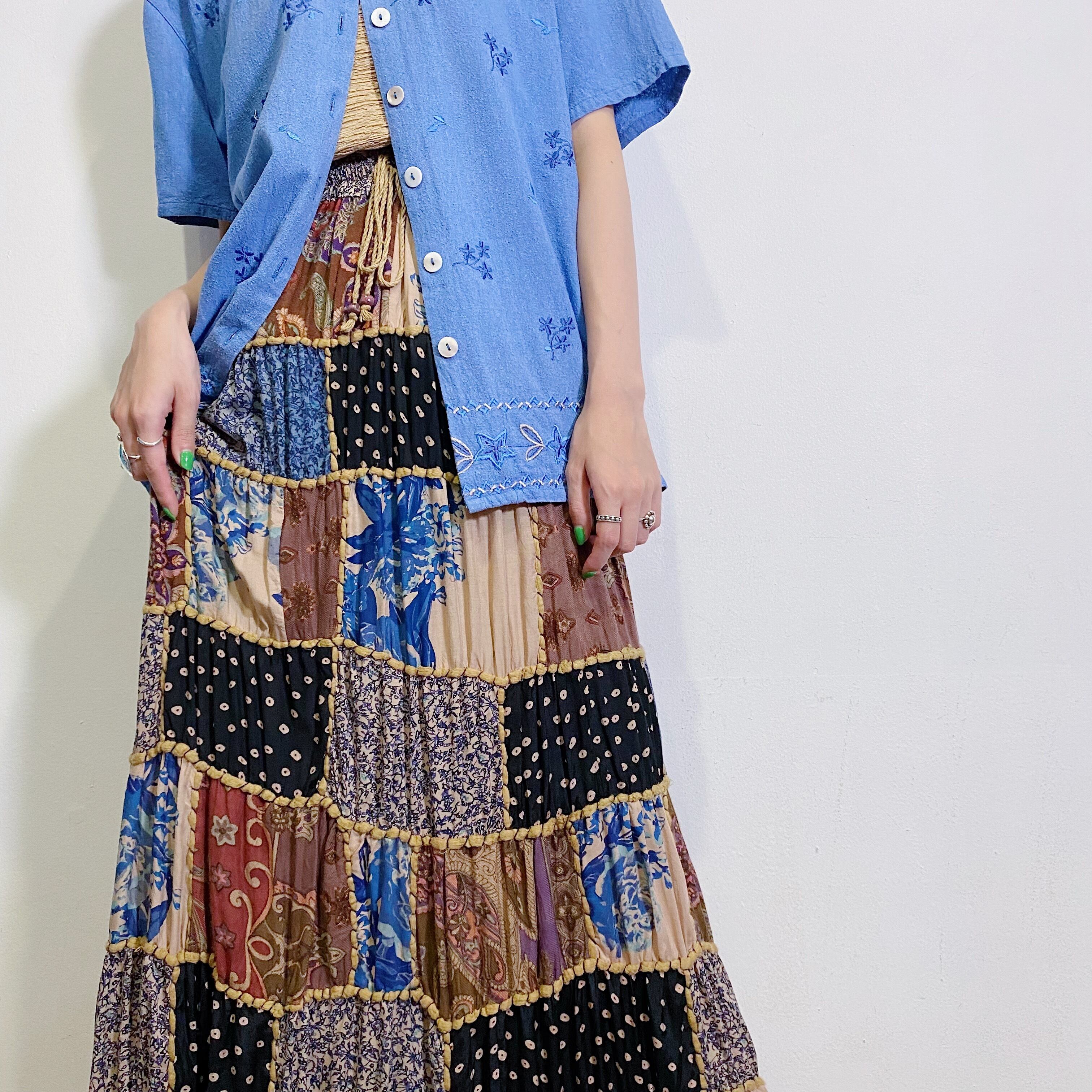 茶色やベージュ、ブルーなどの落ち着いた色合いが可愛いロングスカートです。