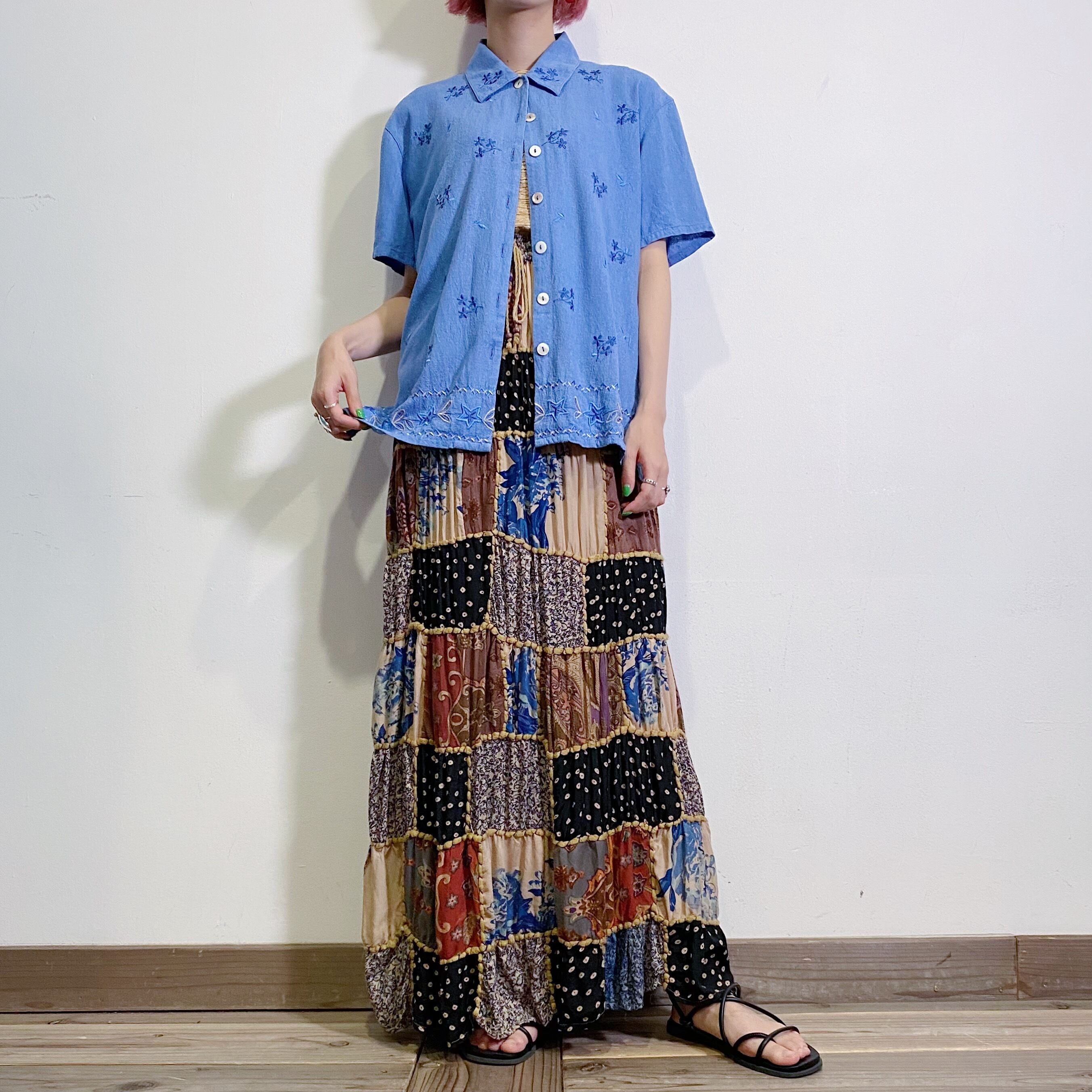 花柄やドットなど様々なテキスタイルがパッチワークされた、キュートな一枚。