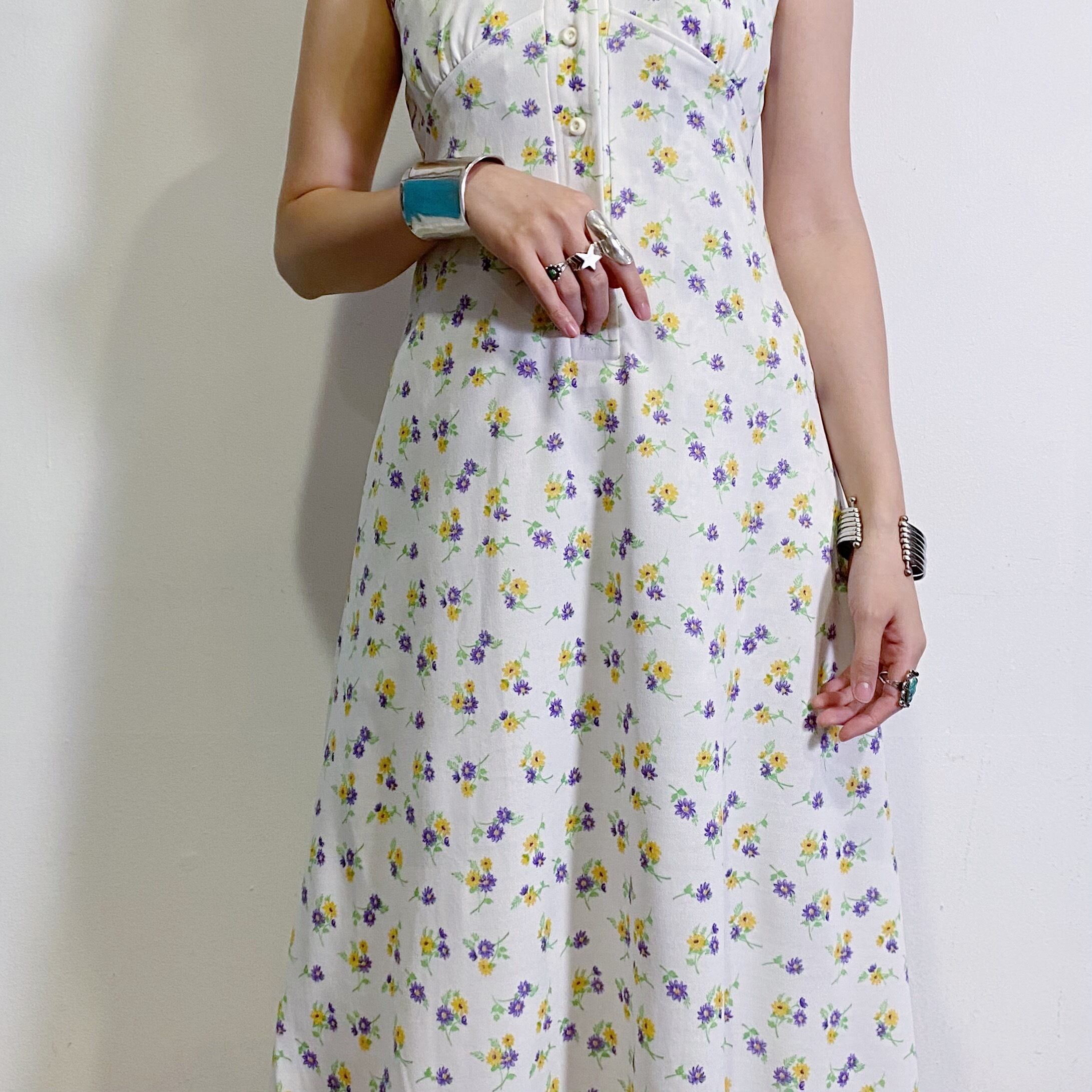 白地に黄色や紫の小花柄が可愛い、70年代のロングワンピースです。