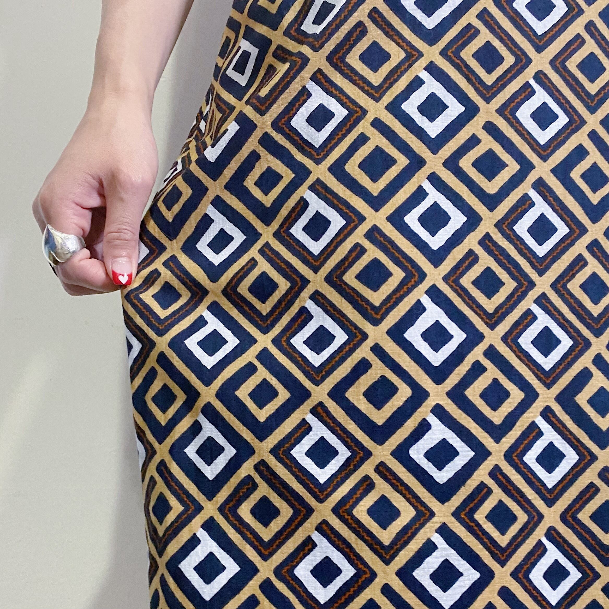 茶色とネイビーの四角い不思議な模様が可愛い、ペンシルスカートです。