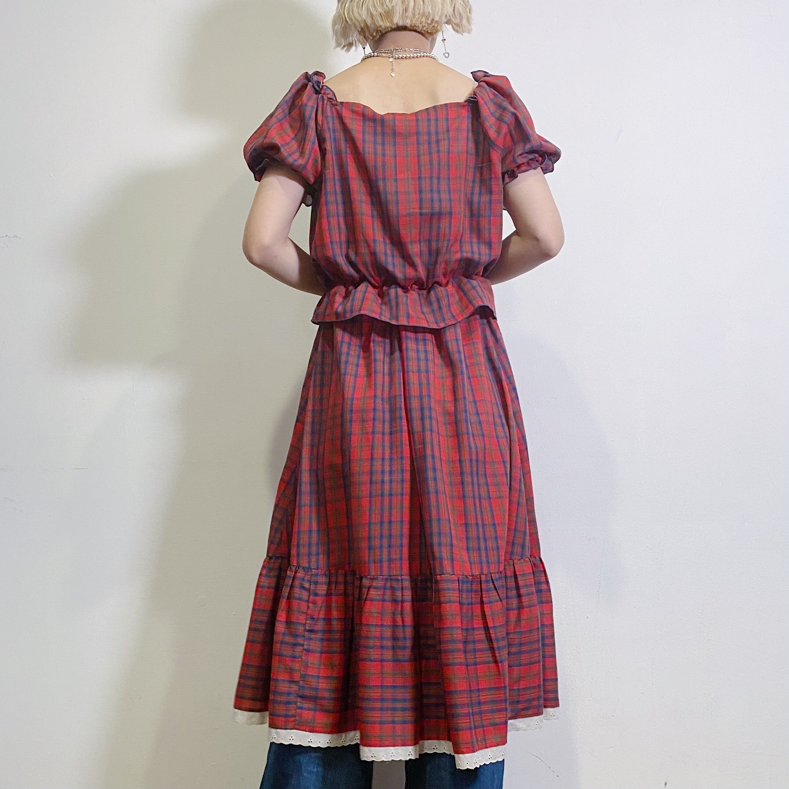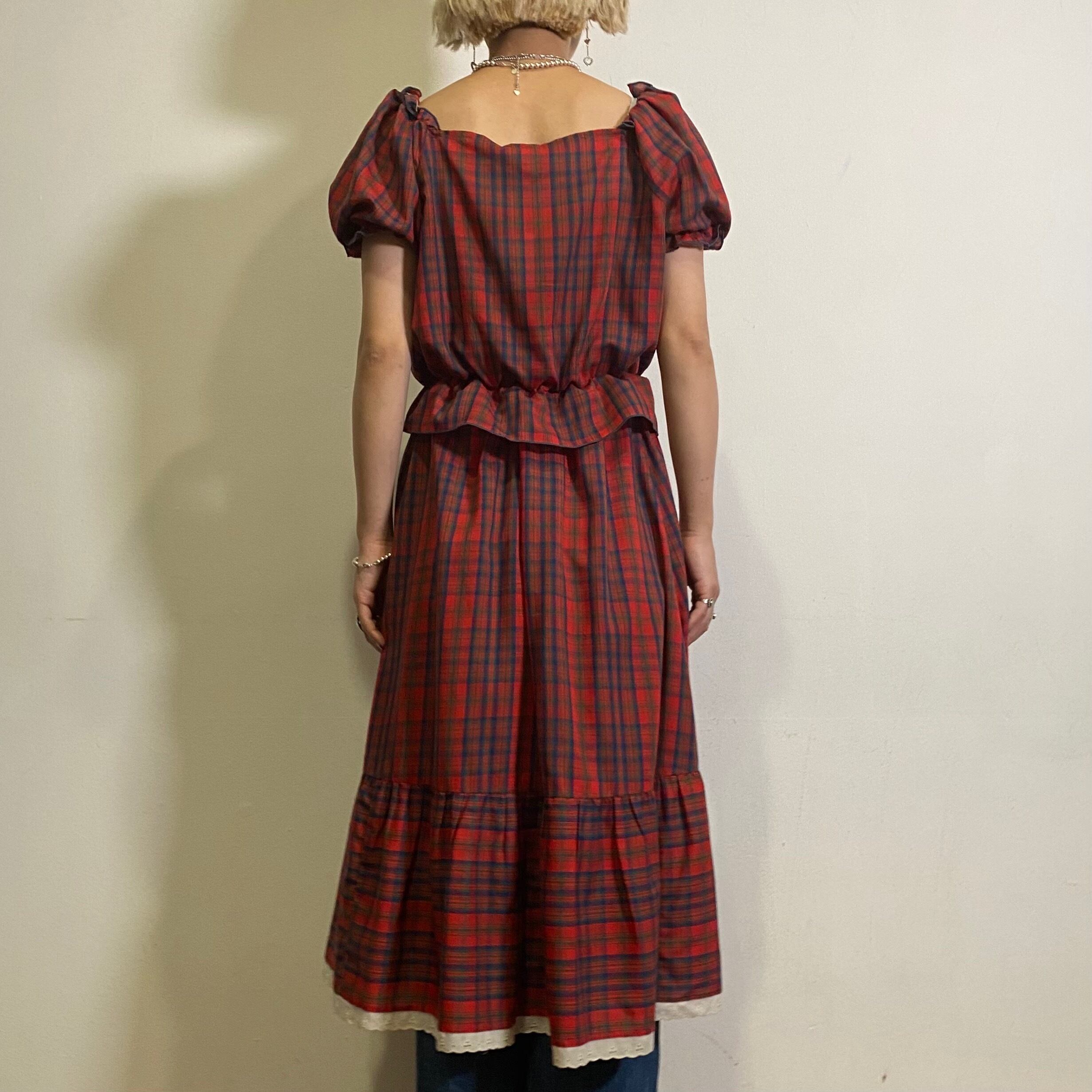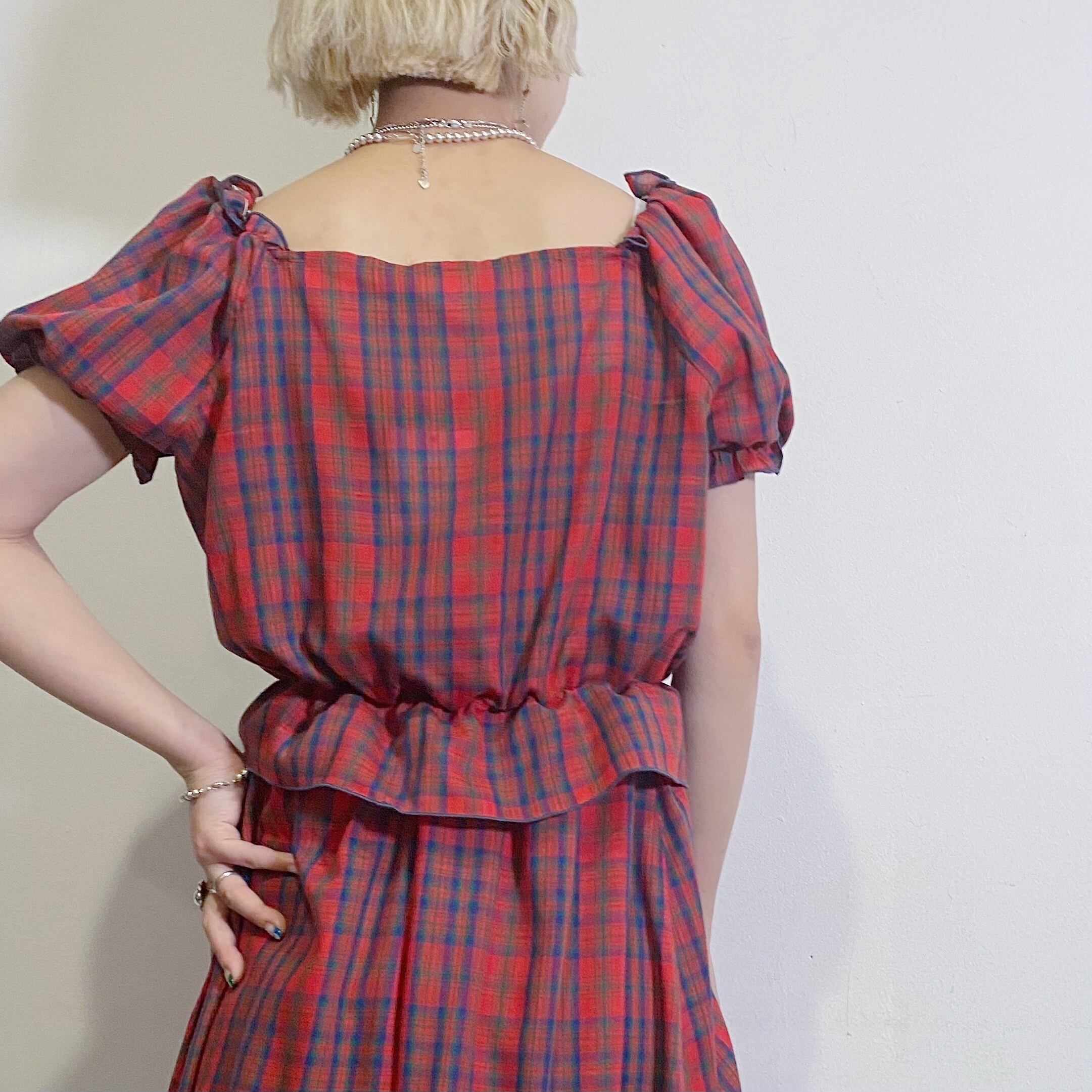 赤いチェックに首のダンガリー素材の切り替えが可愛い、70年代のセットアップです。