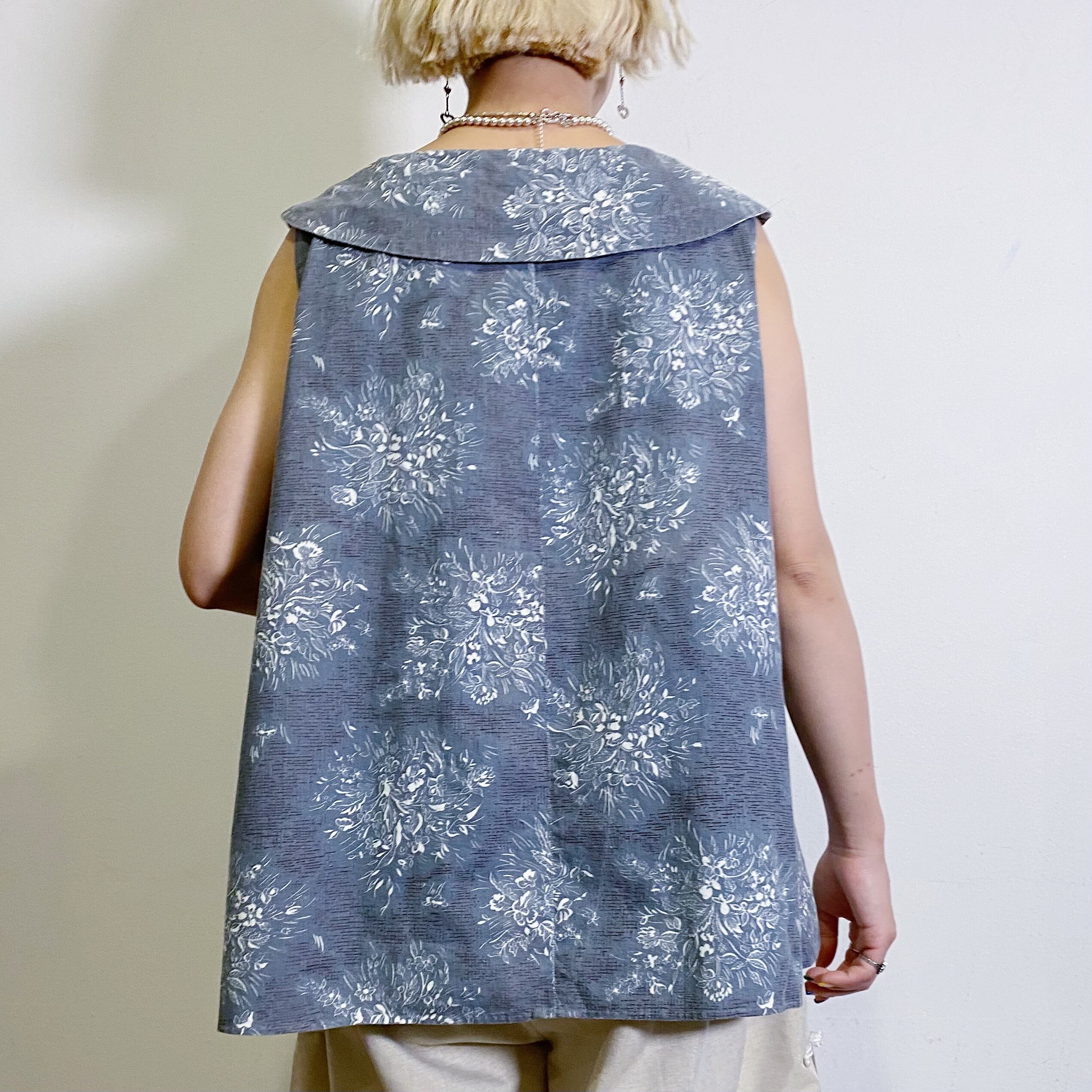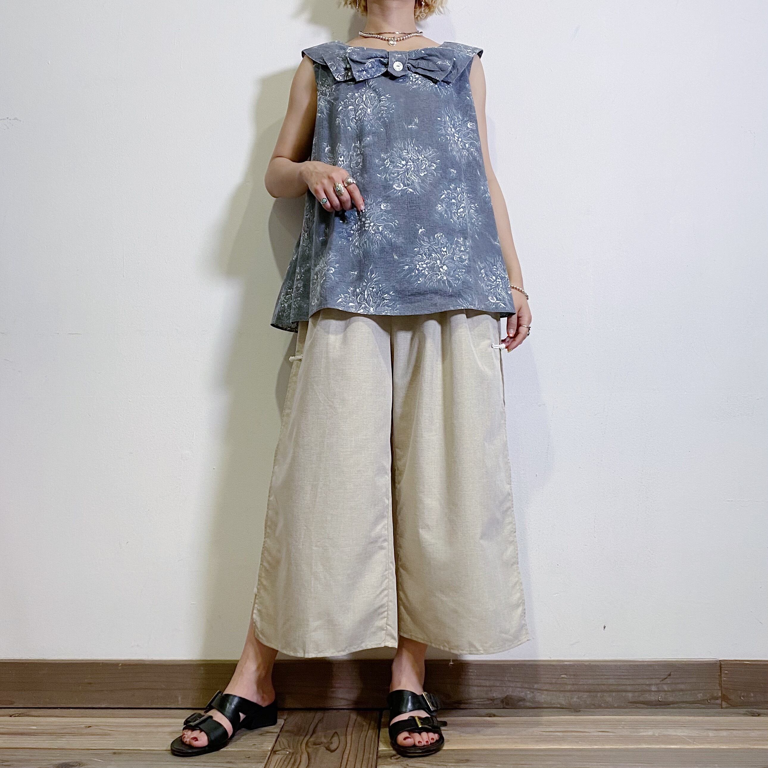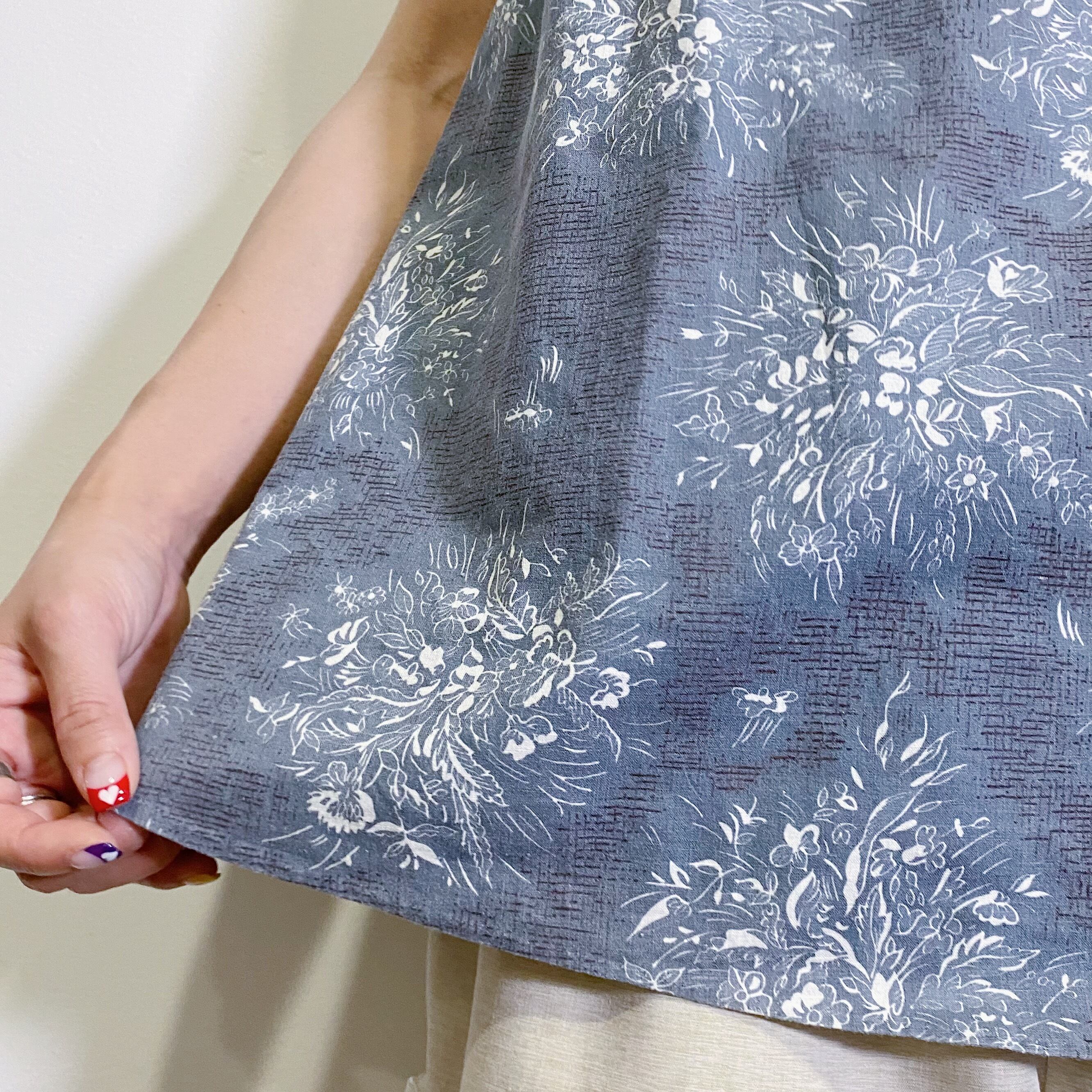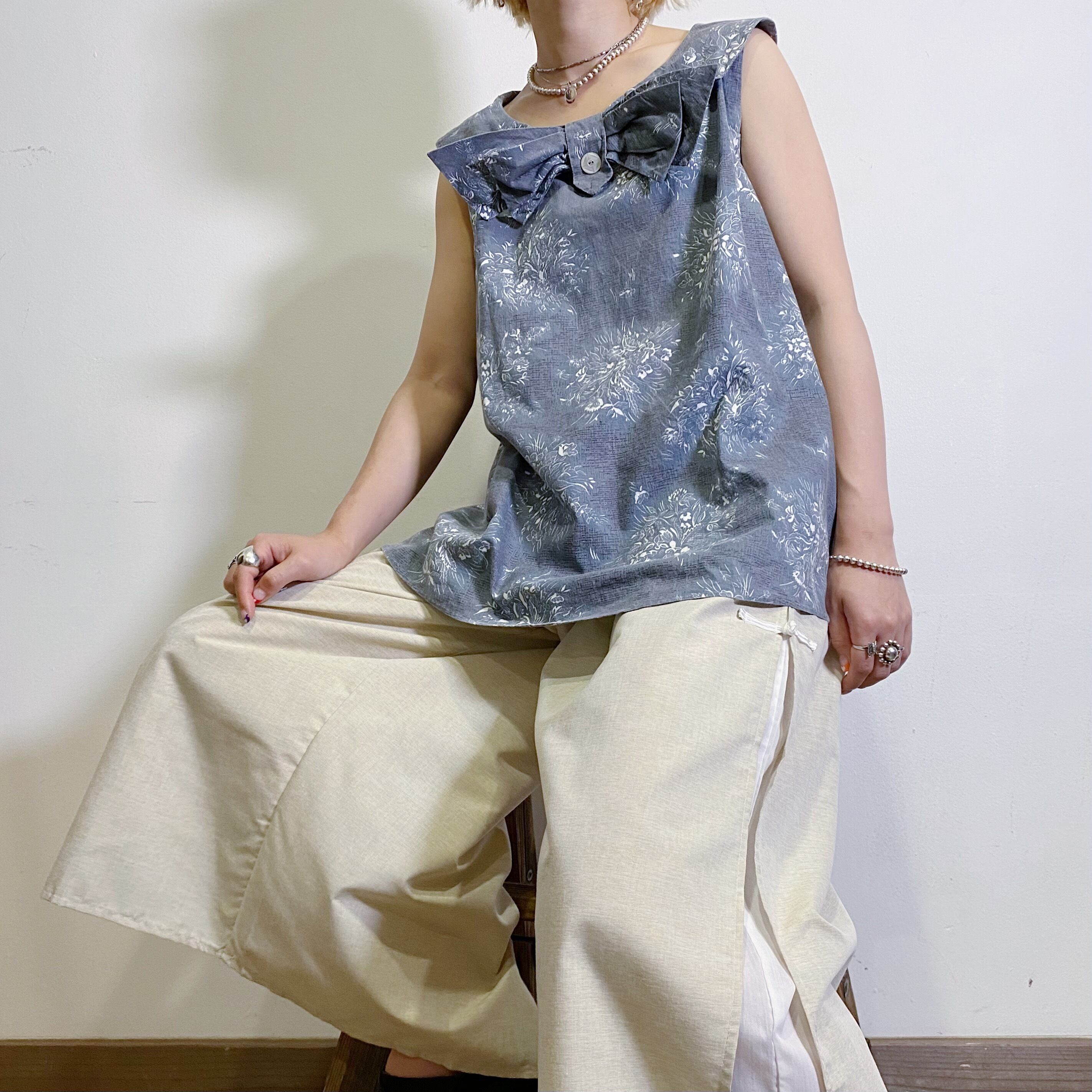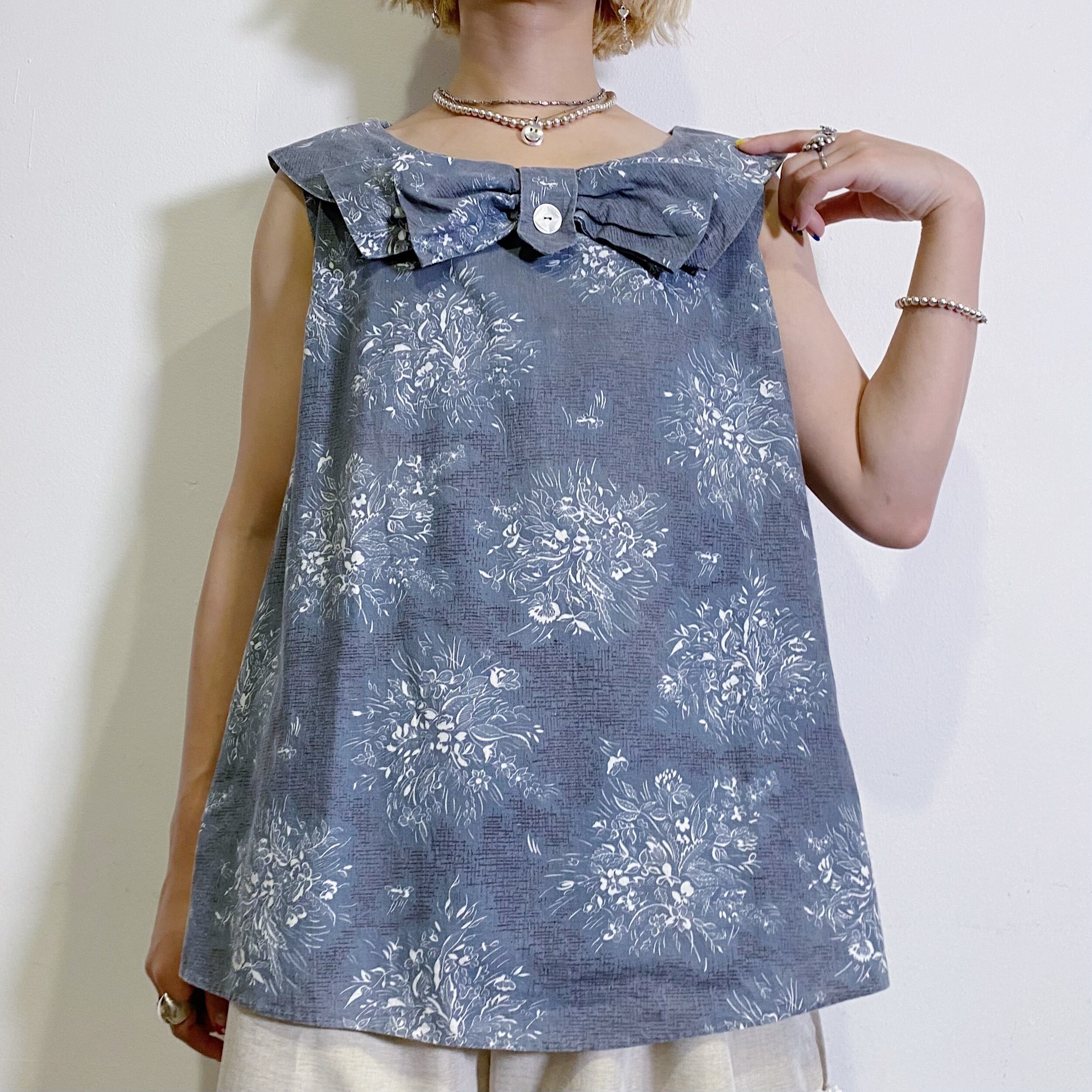 首の大きなリボンにAラインシルエット、落ち着いた花柄が可愛い50年代初期のノースリーブブラウスです。