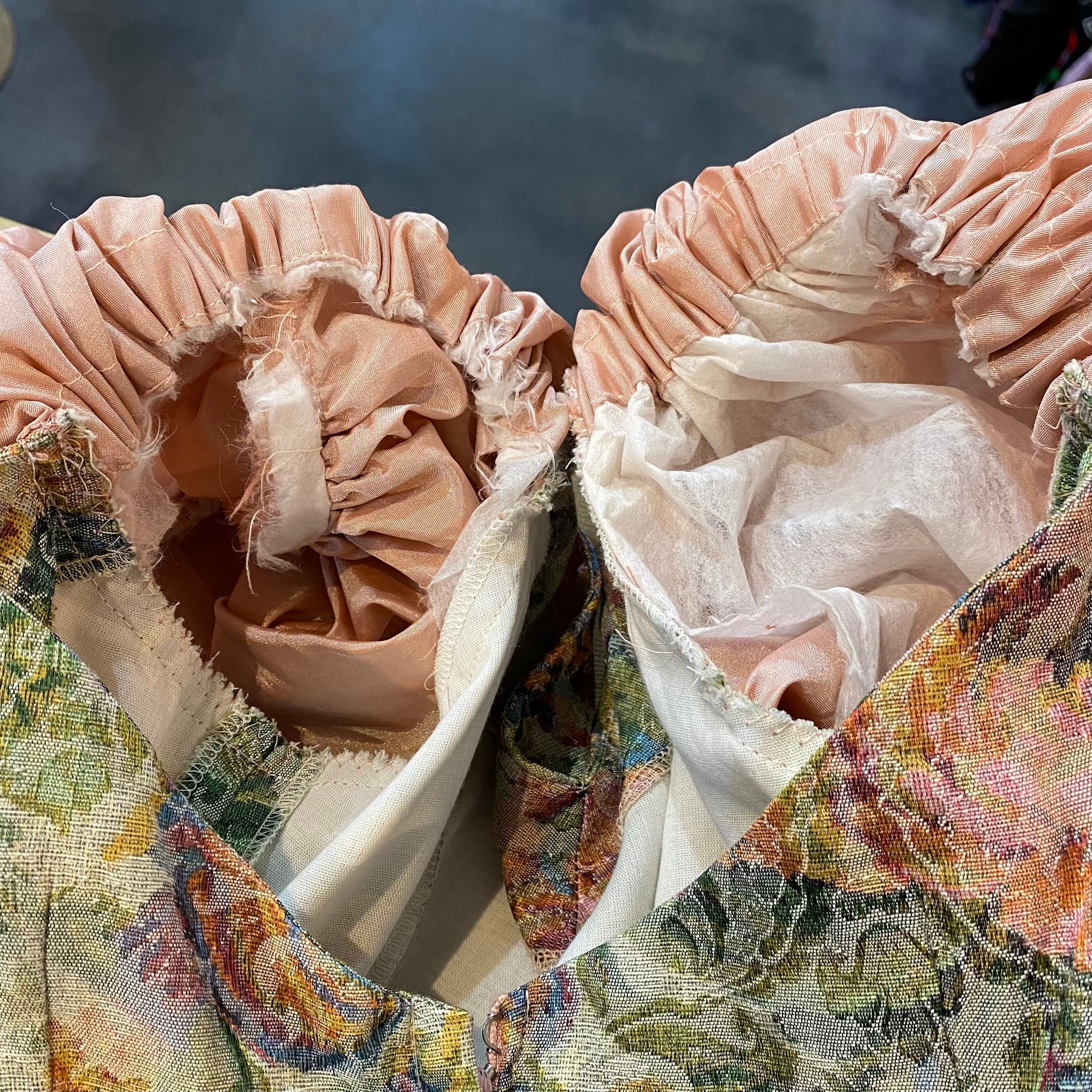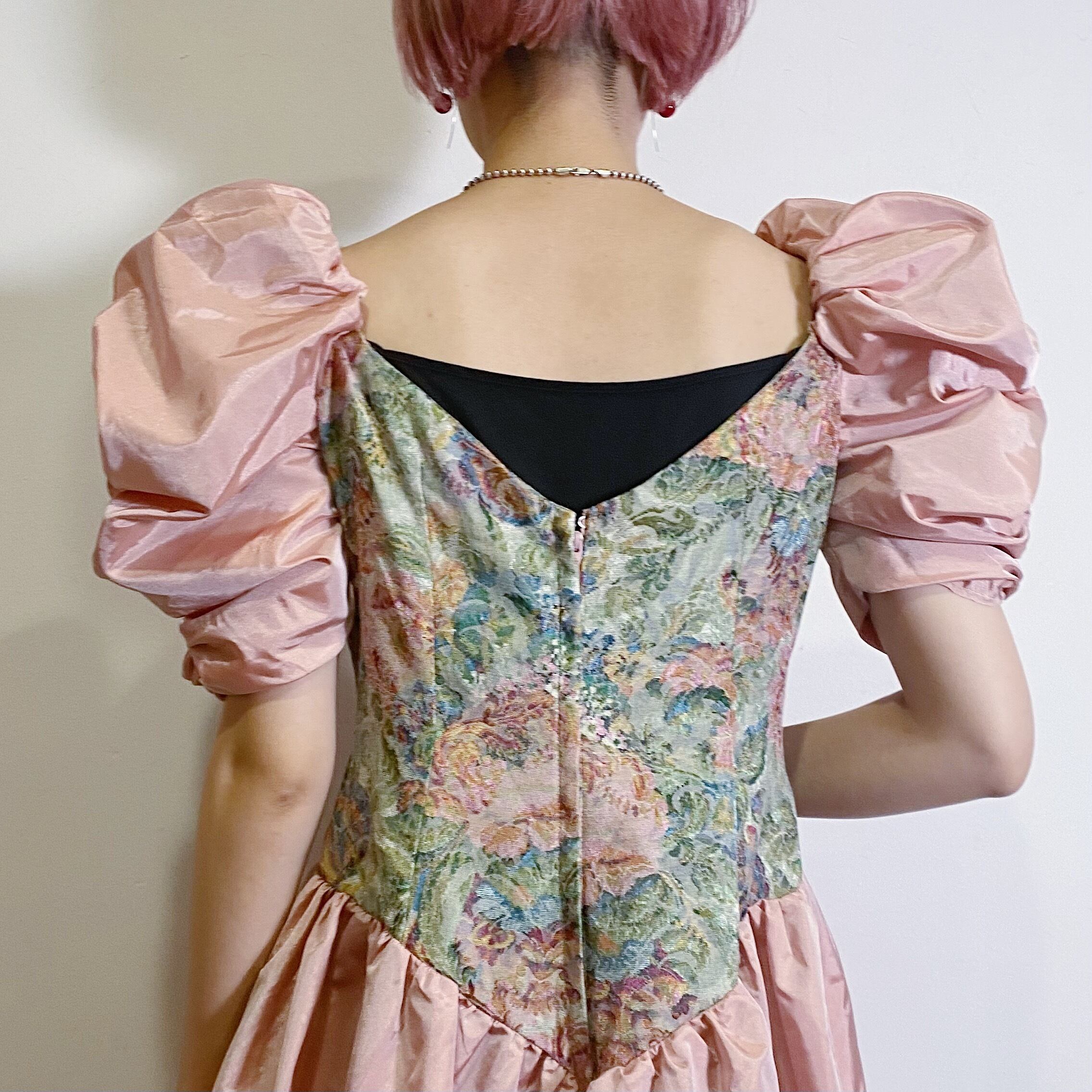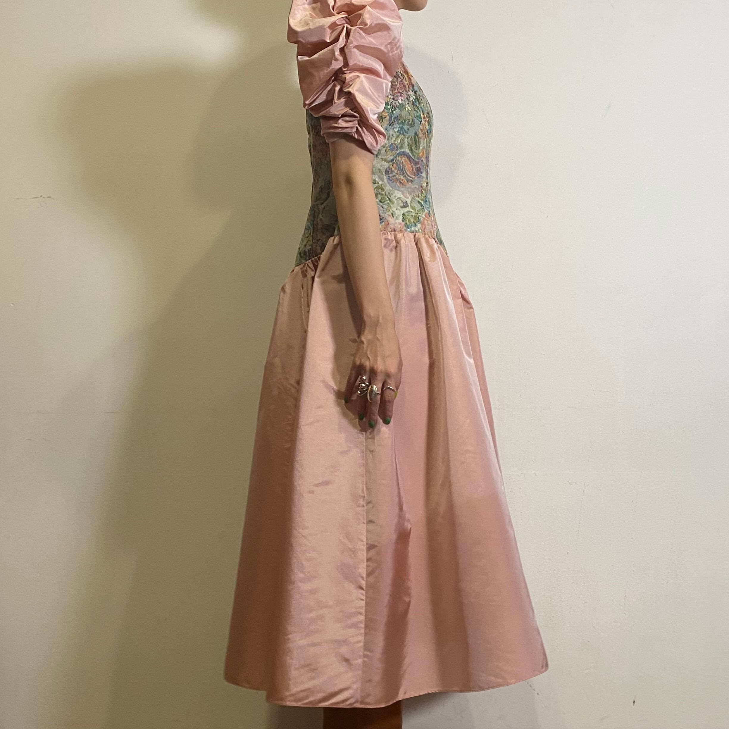 ピンクのシャンタン素材とゴブラン織りのような花柄の組み合わせが可愛い、80年代のワンピースです。