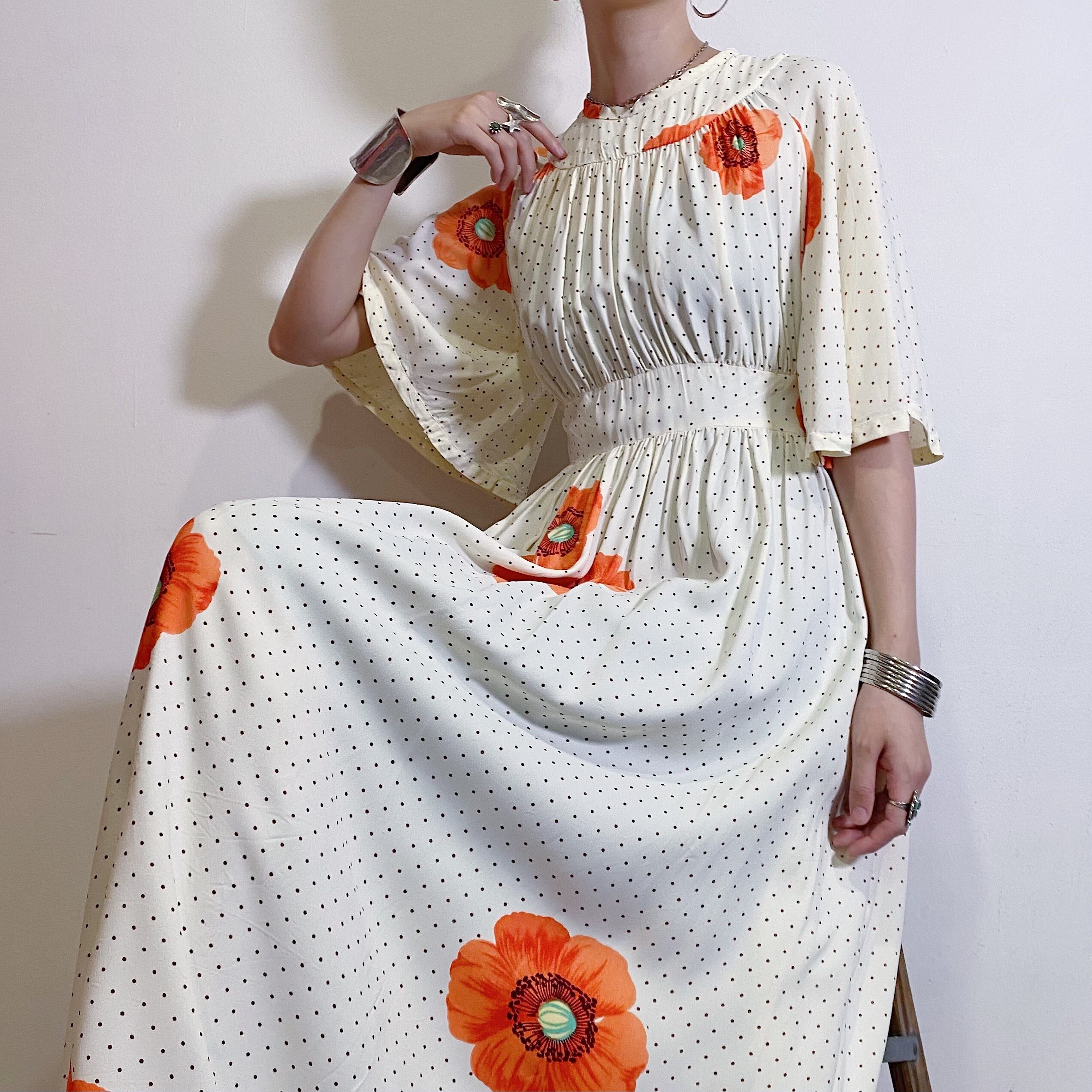 オレンジのアネモネのようなお花とピンドットの組み合わせが可愛い、70年代のロングワンピースです。