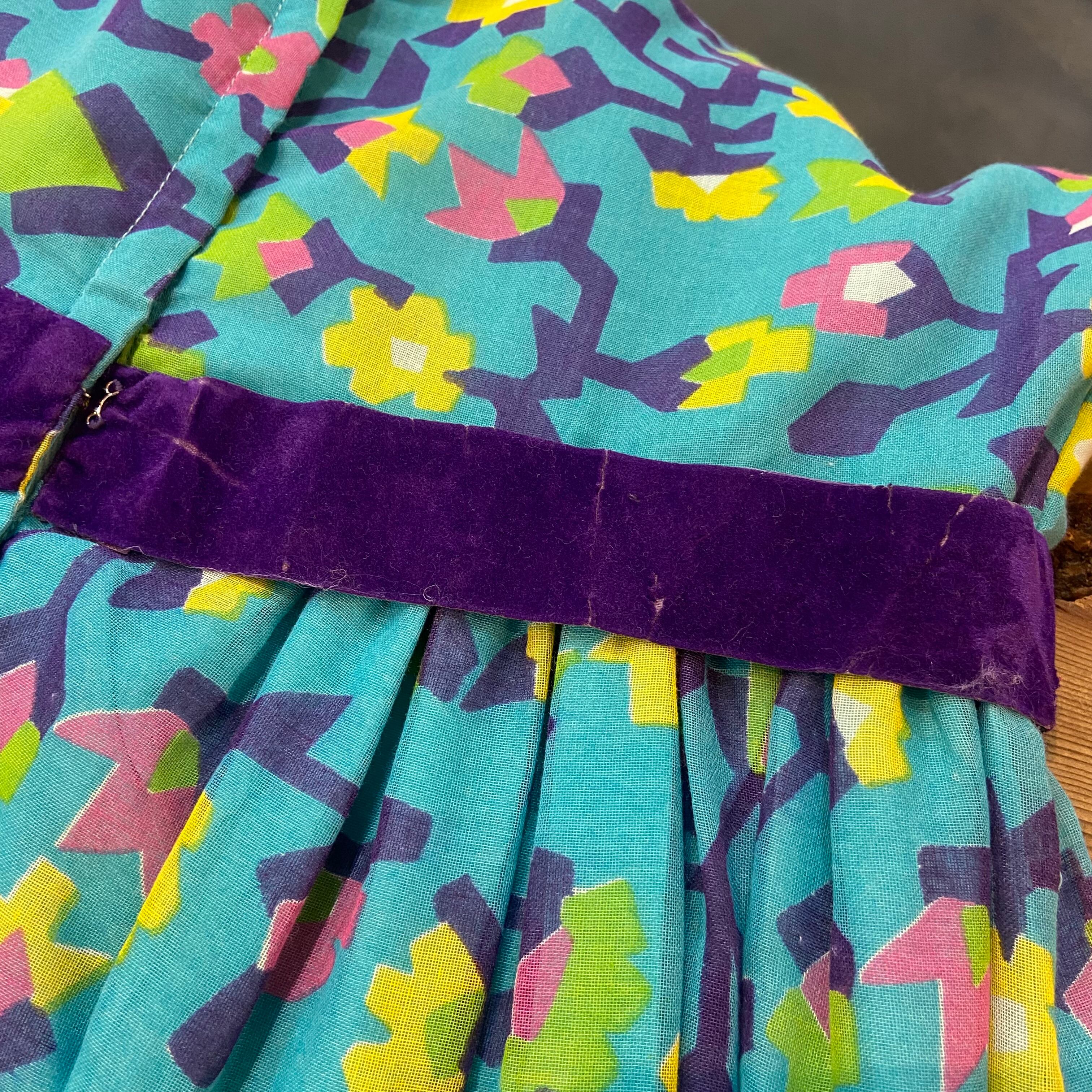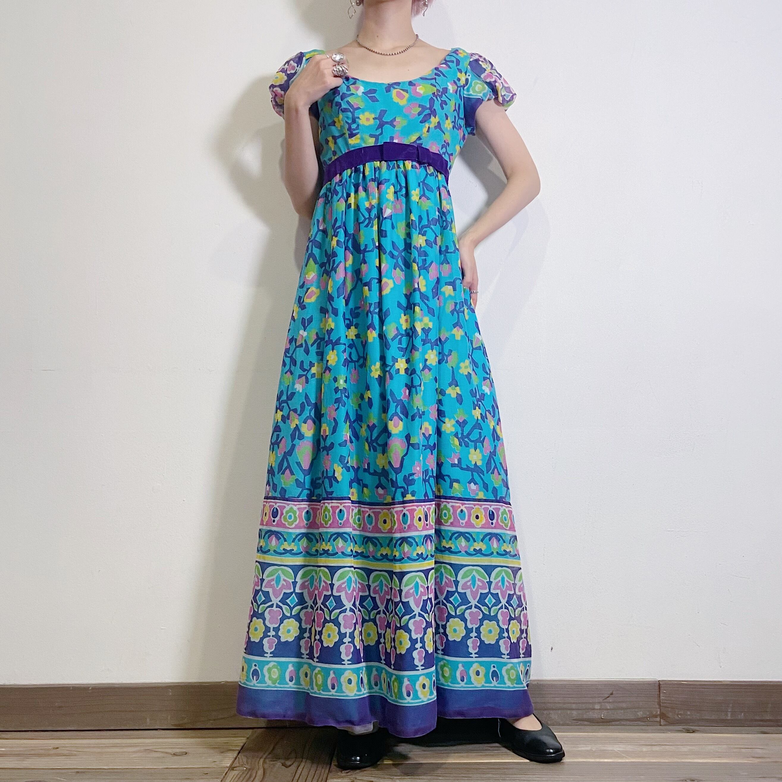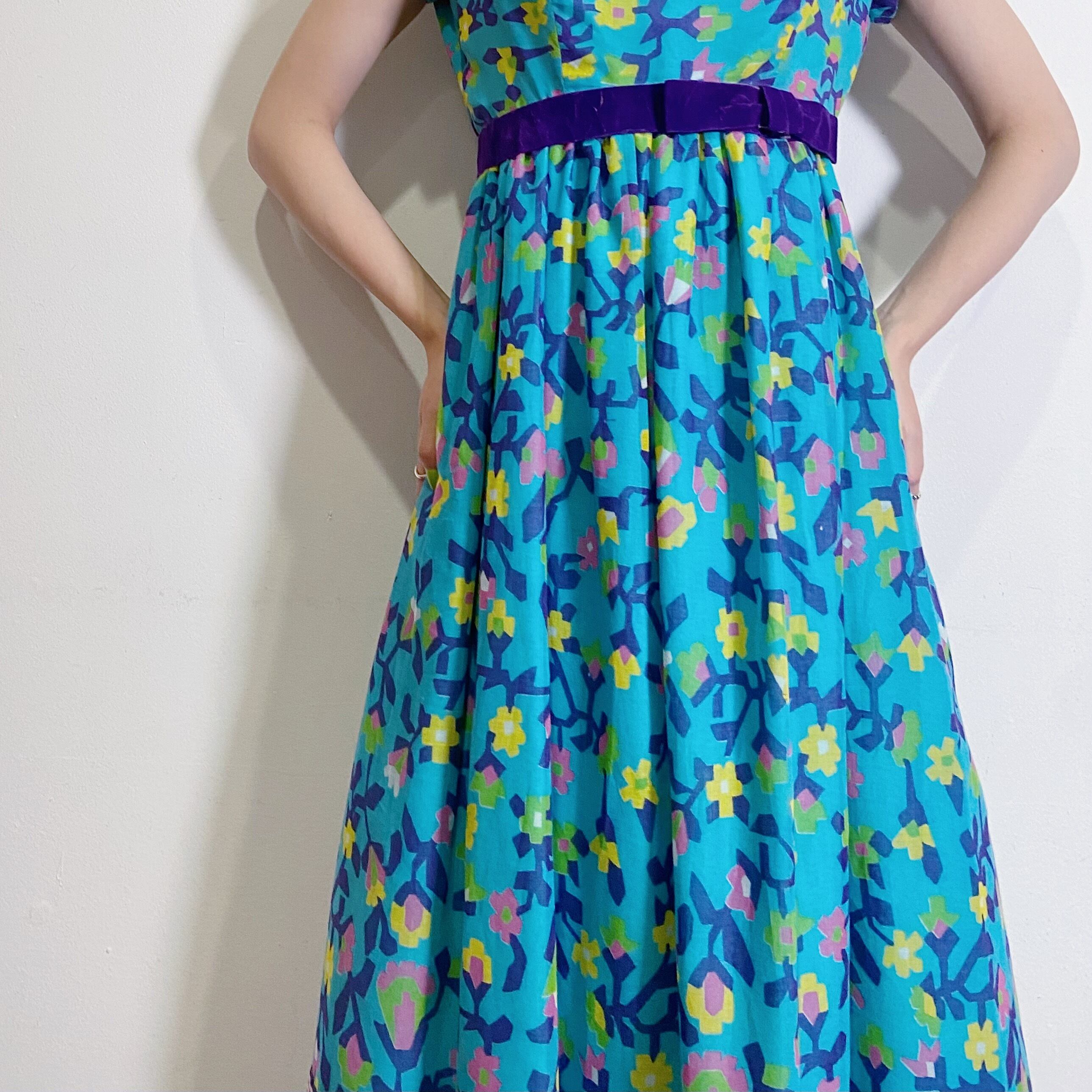 ターコイズカラーと紫の色合いが可愛い、60年代のロングワンピースです。