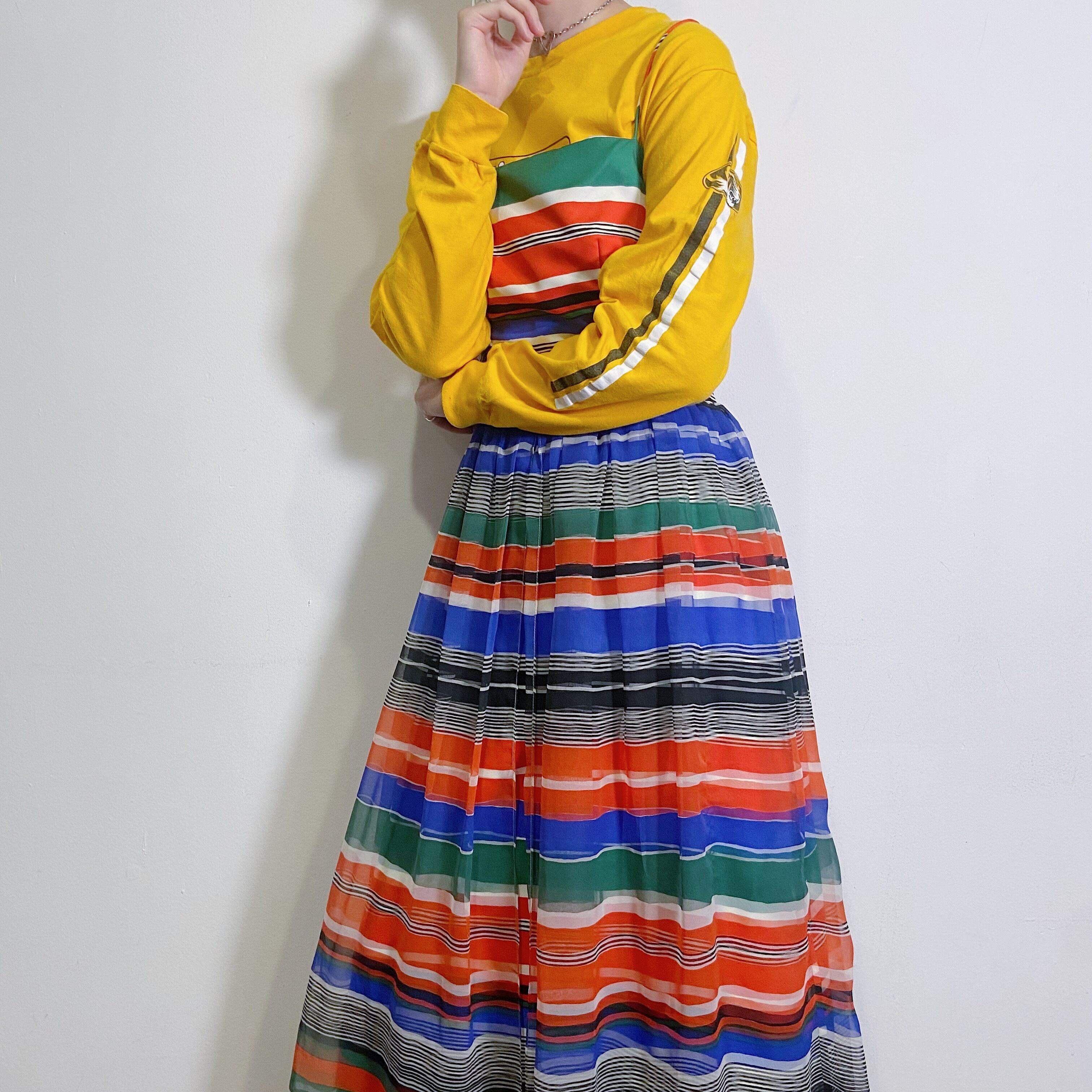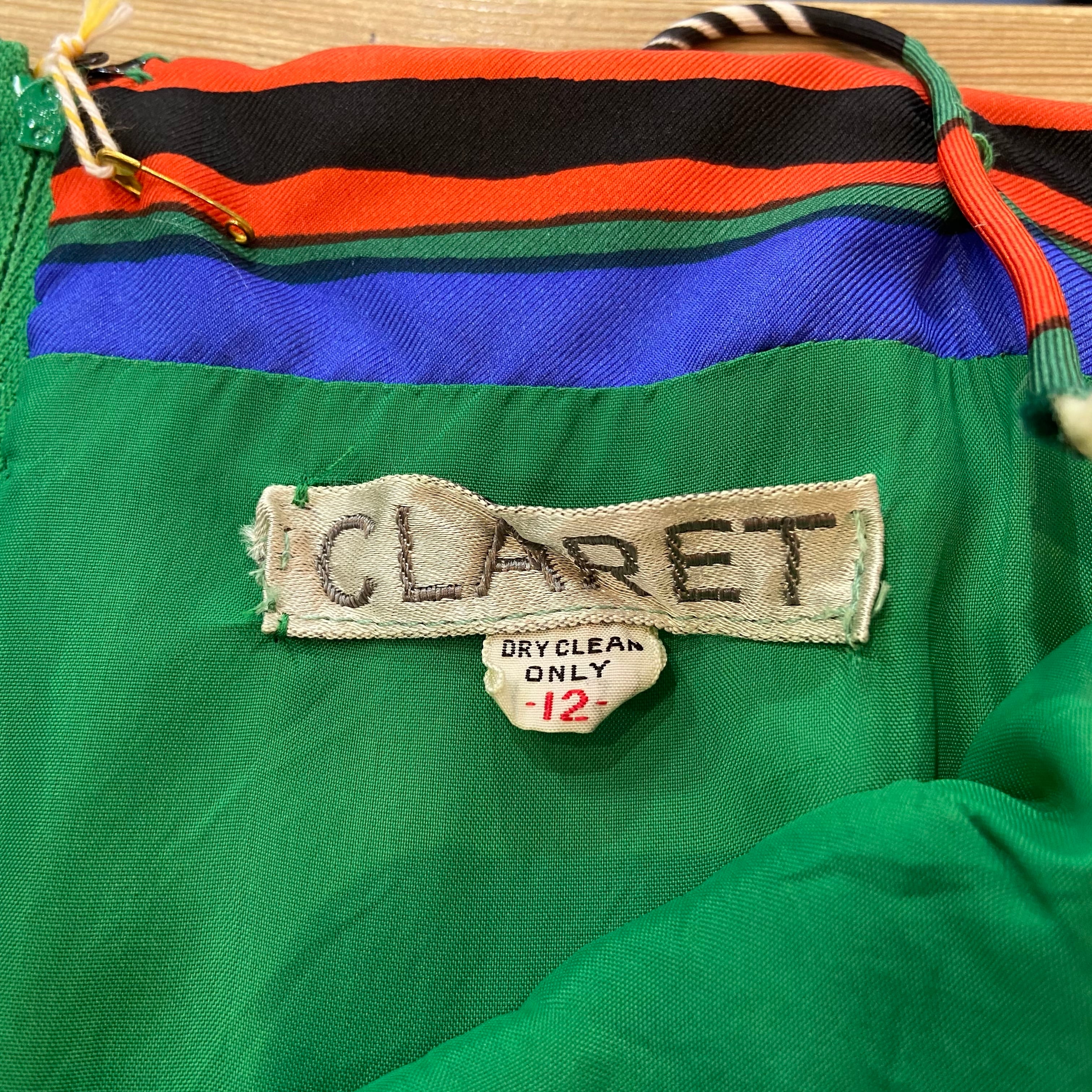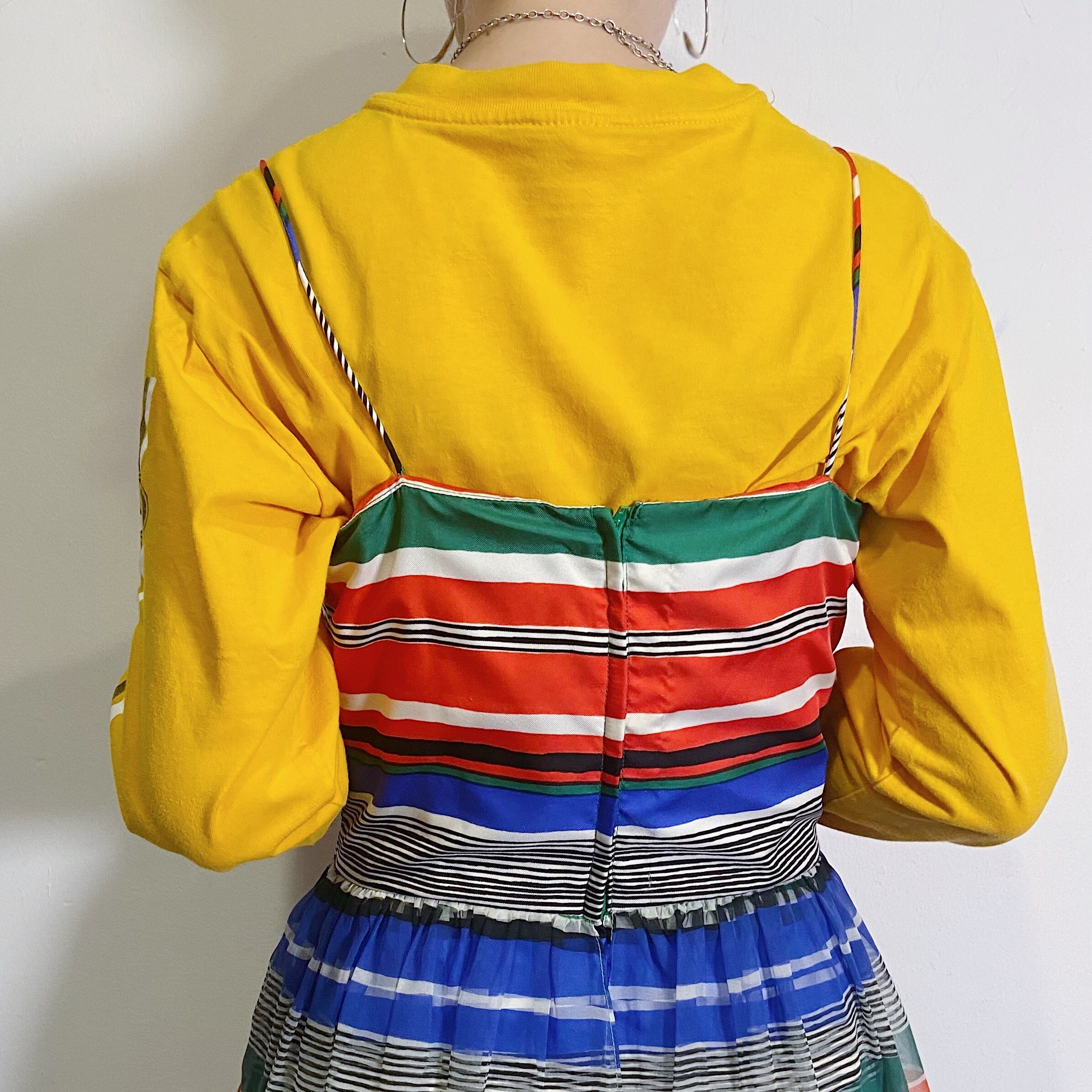 緑や青、オレンジなどの綺麗な色合いのボーダーが魅力的な、70年代ころのキャミワンピースです。