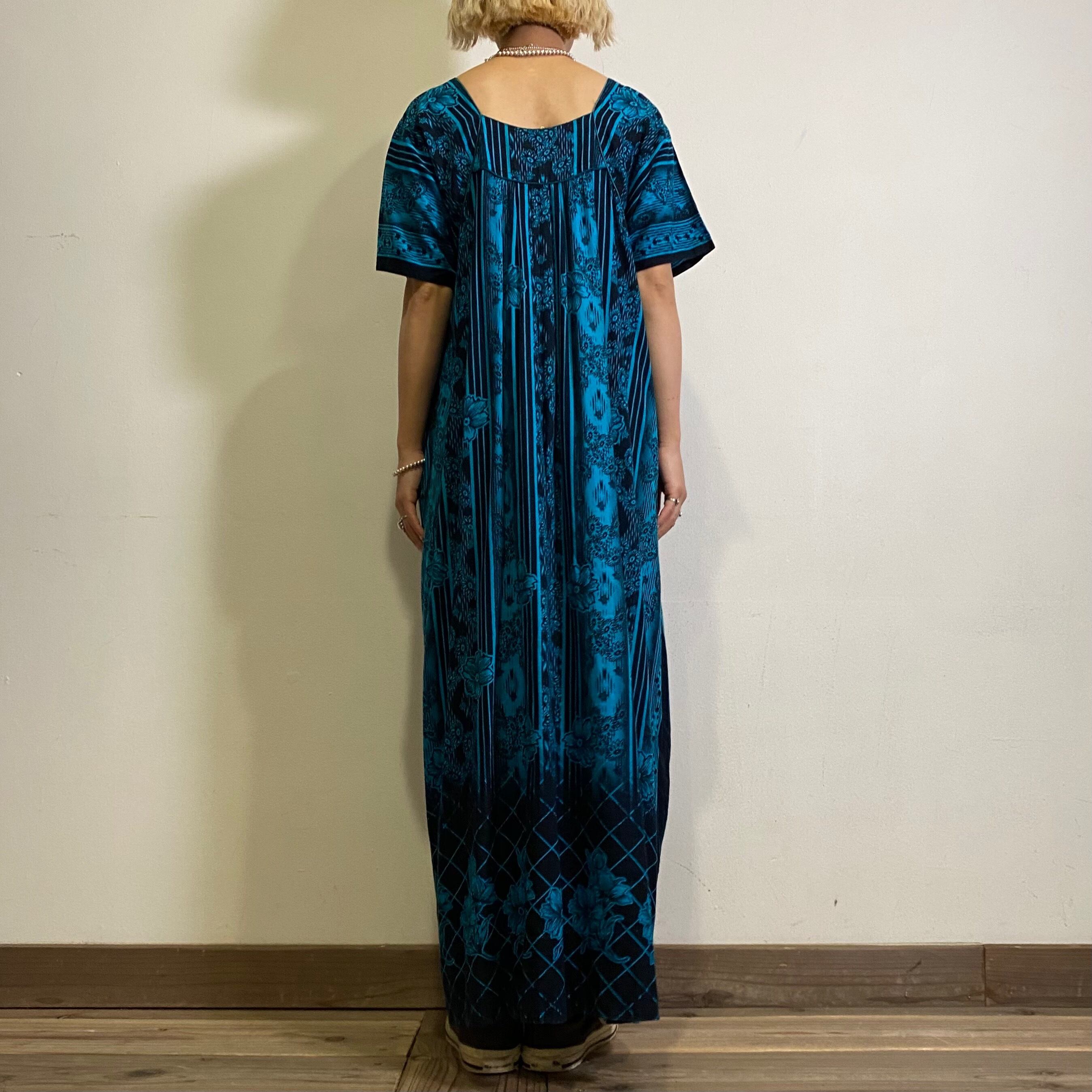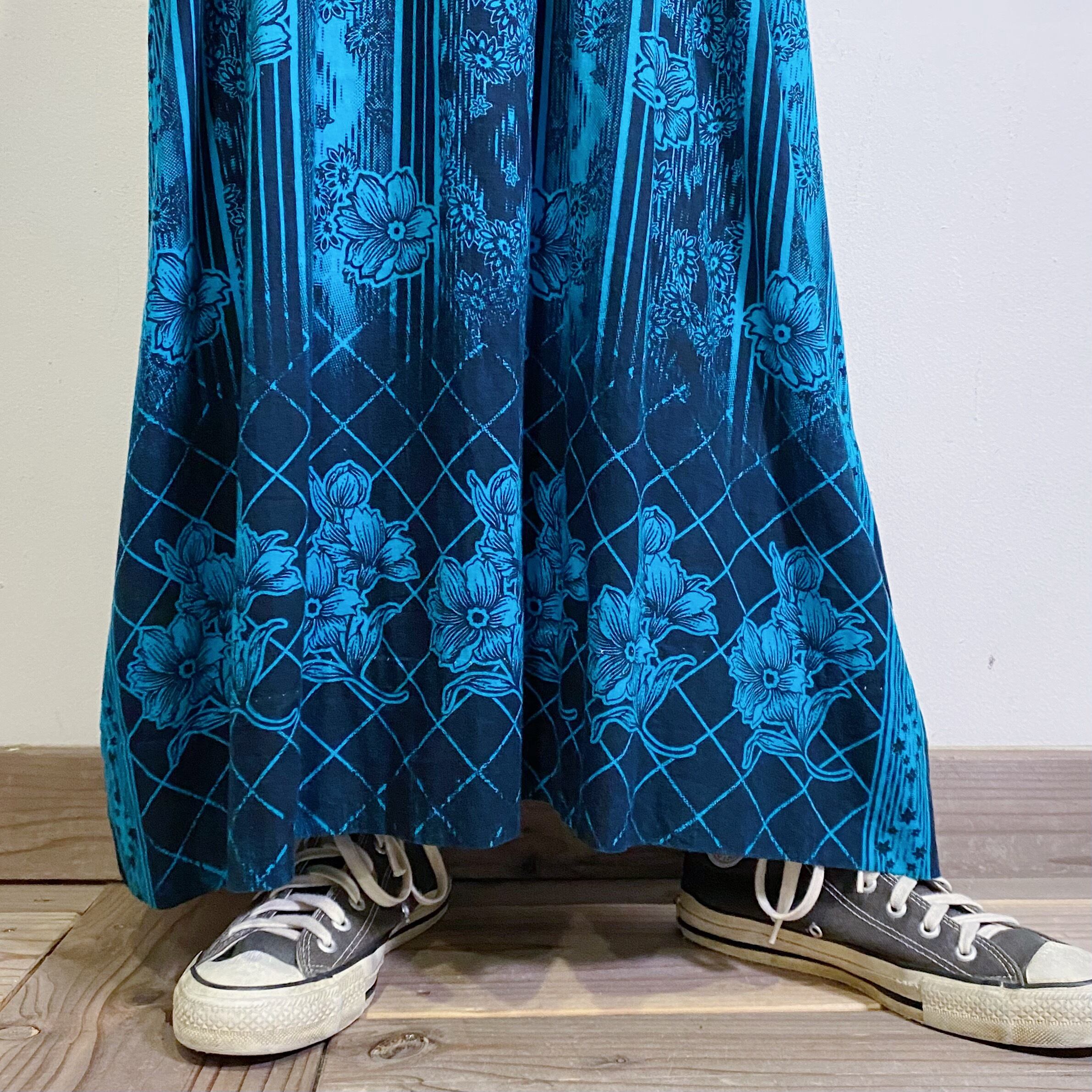 手書きタッチのお花とストライプの組み合わせが可愛い、70年代のロングワンピースです。
