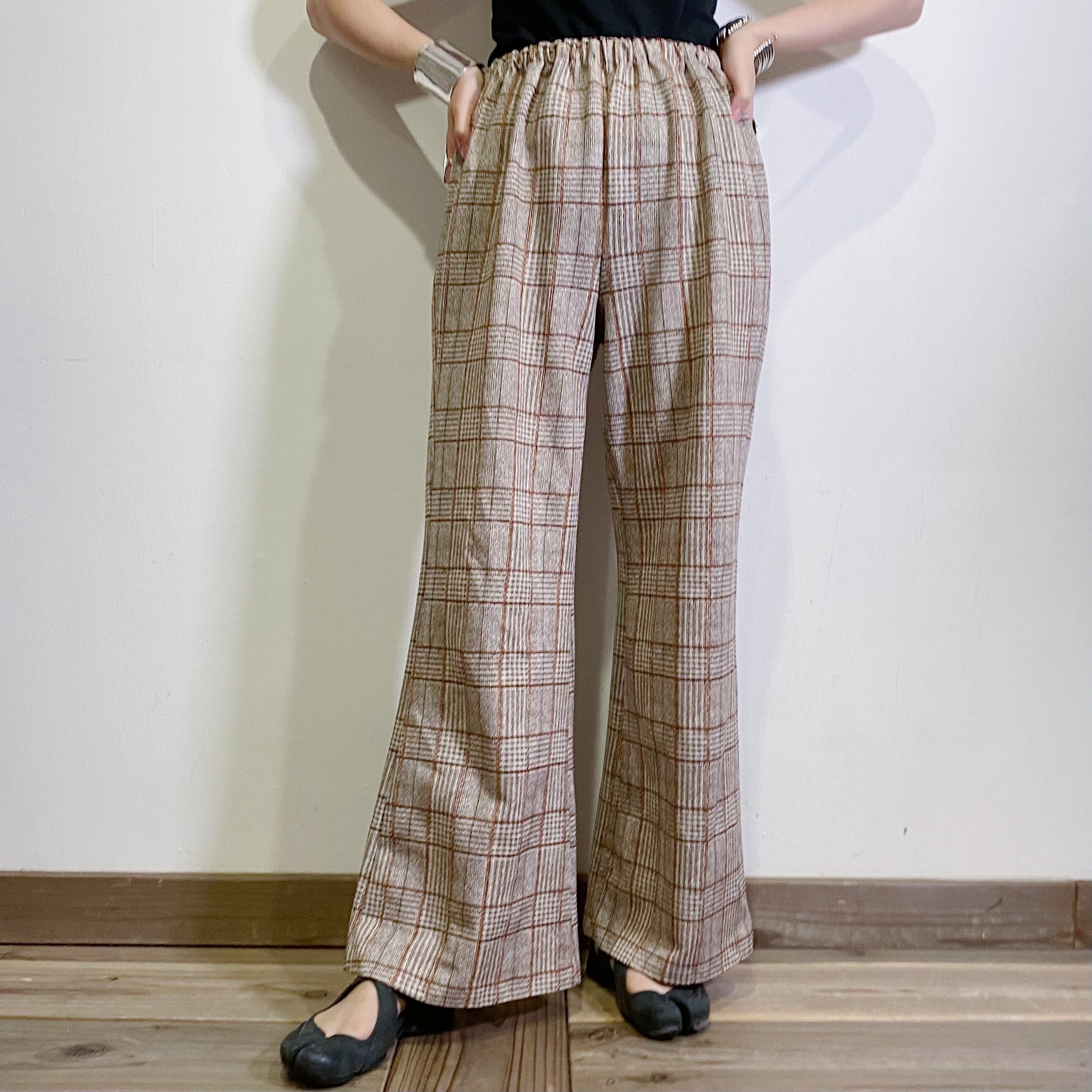 茶色と白のチェックが可愛い、70年代のフレアパンツです。