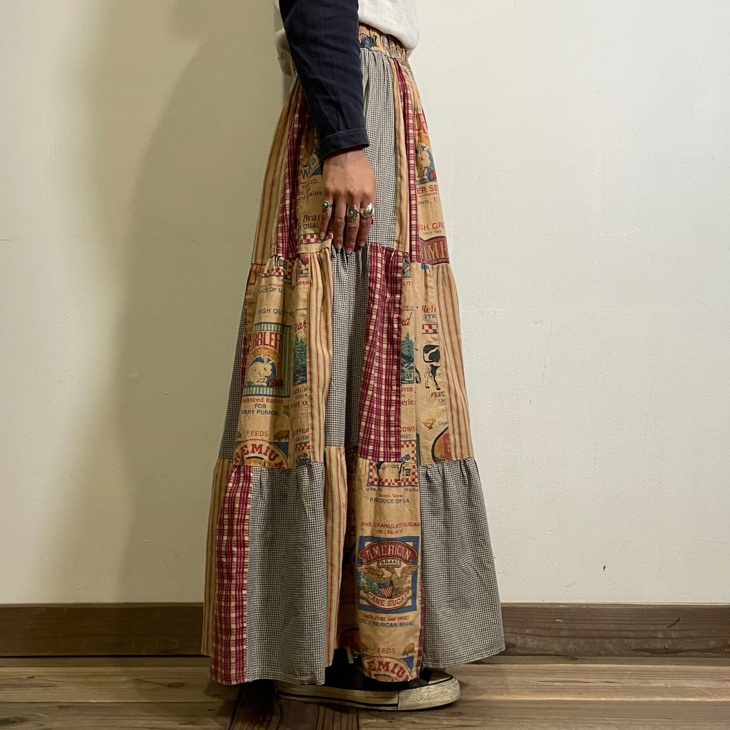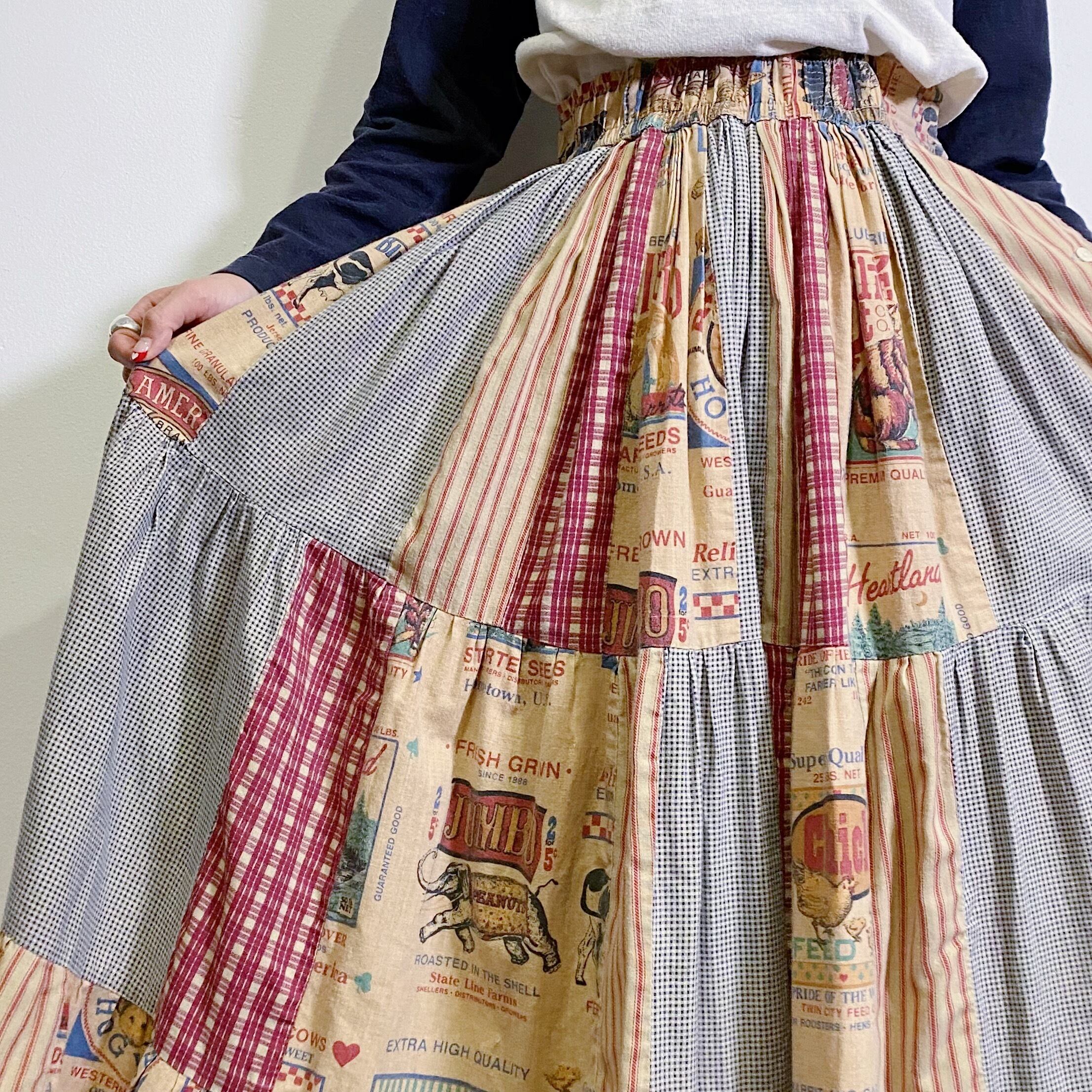 いろんなフィードサック風の柄とチェックの組み合わせが可愛い、90年代のロングスカートです。