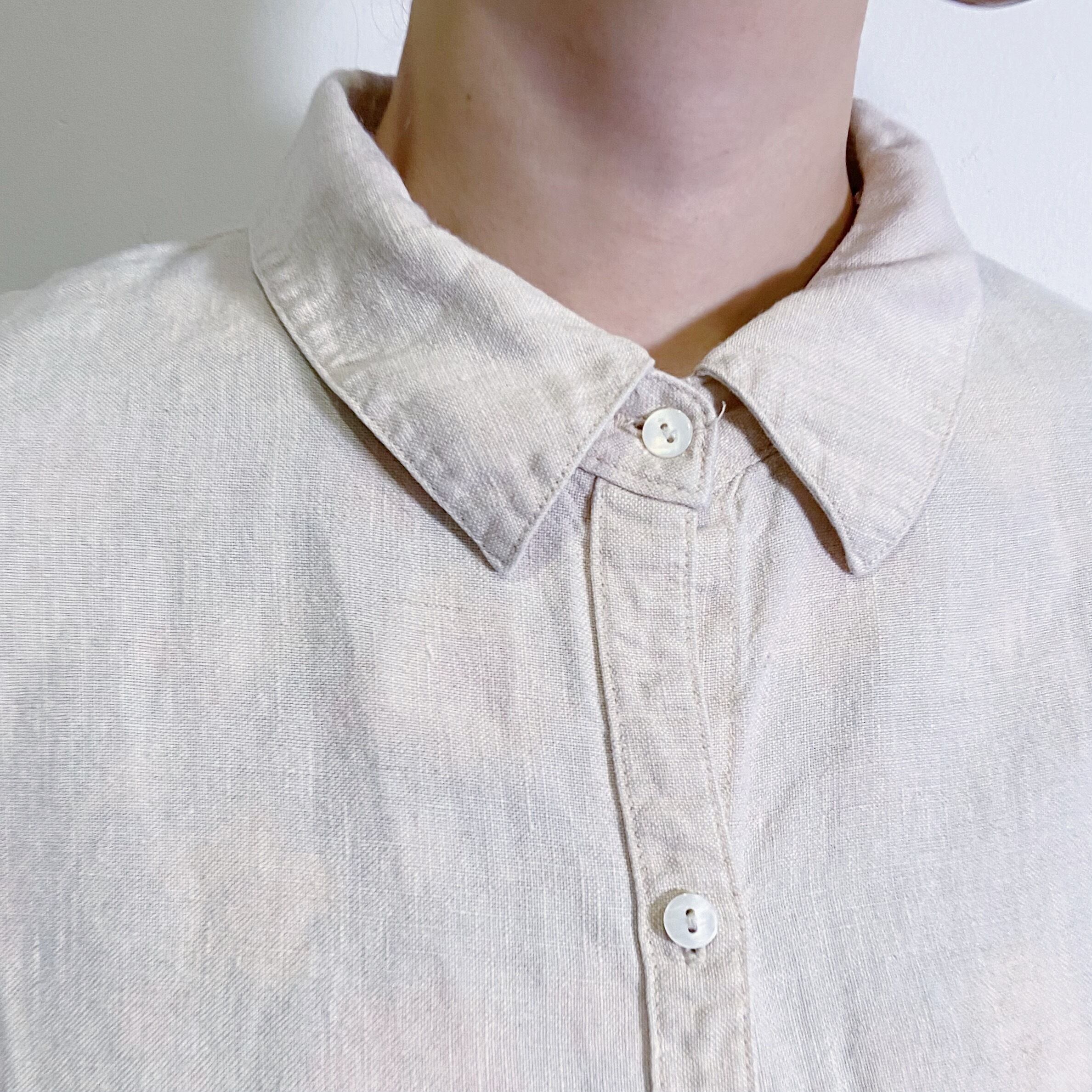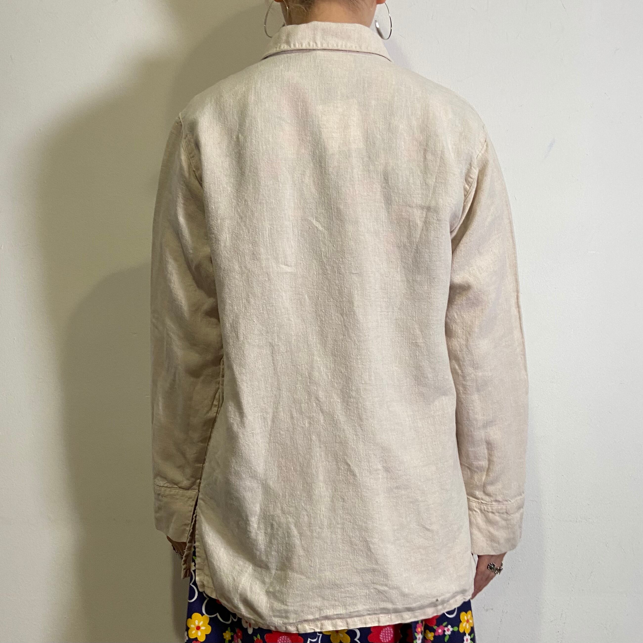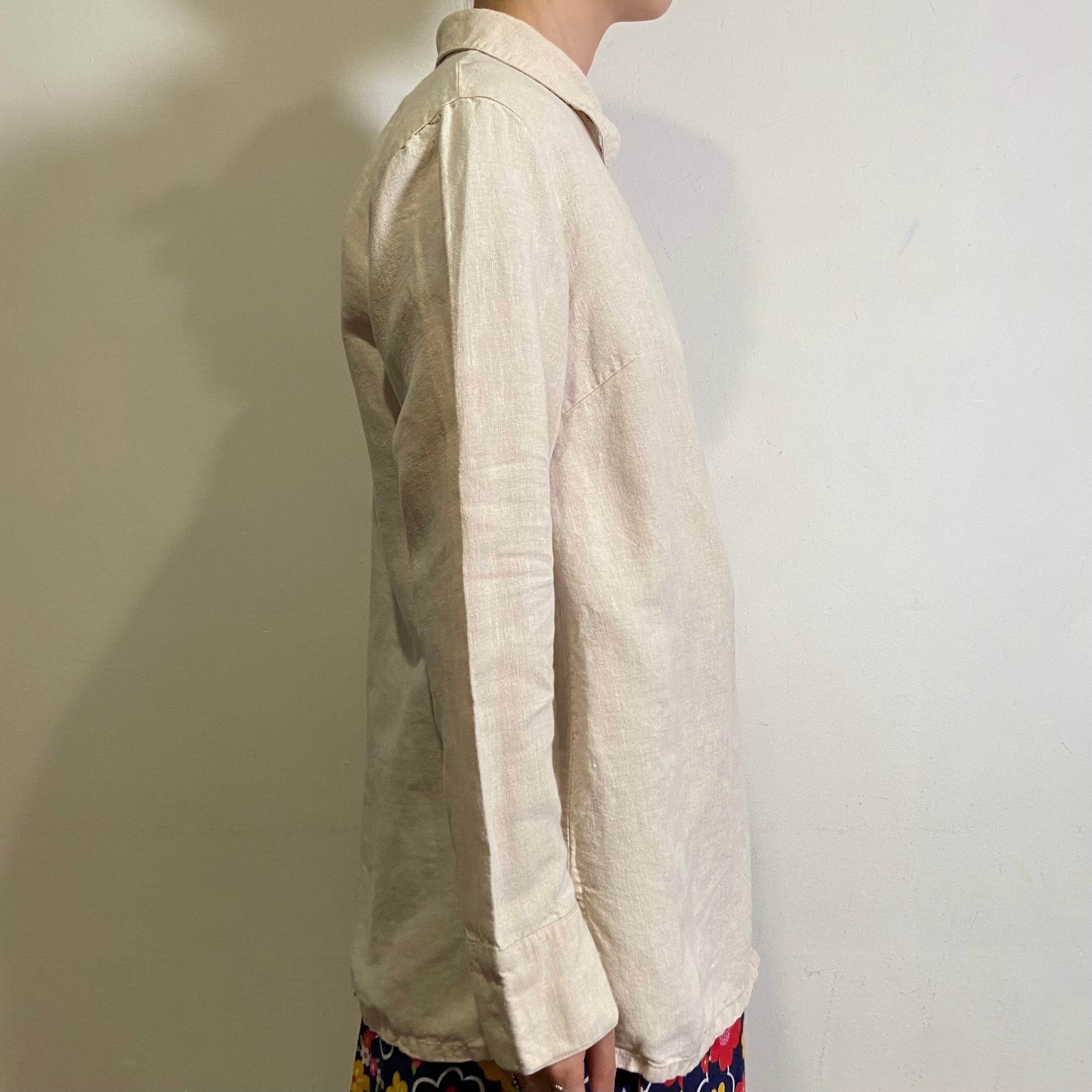 ベージュカラーで大変使い勝手の良さそうな、リネン地の長袖シャツです。