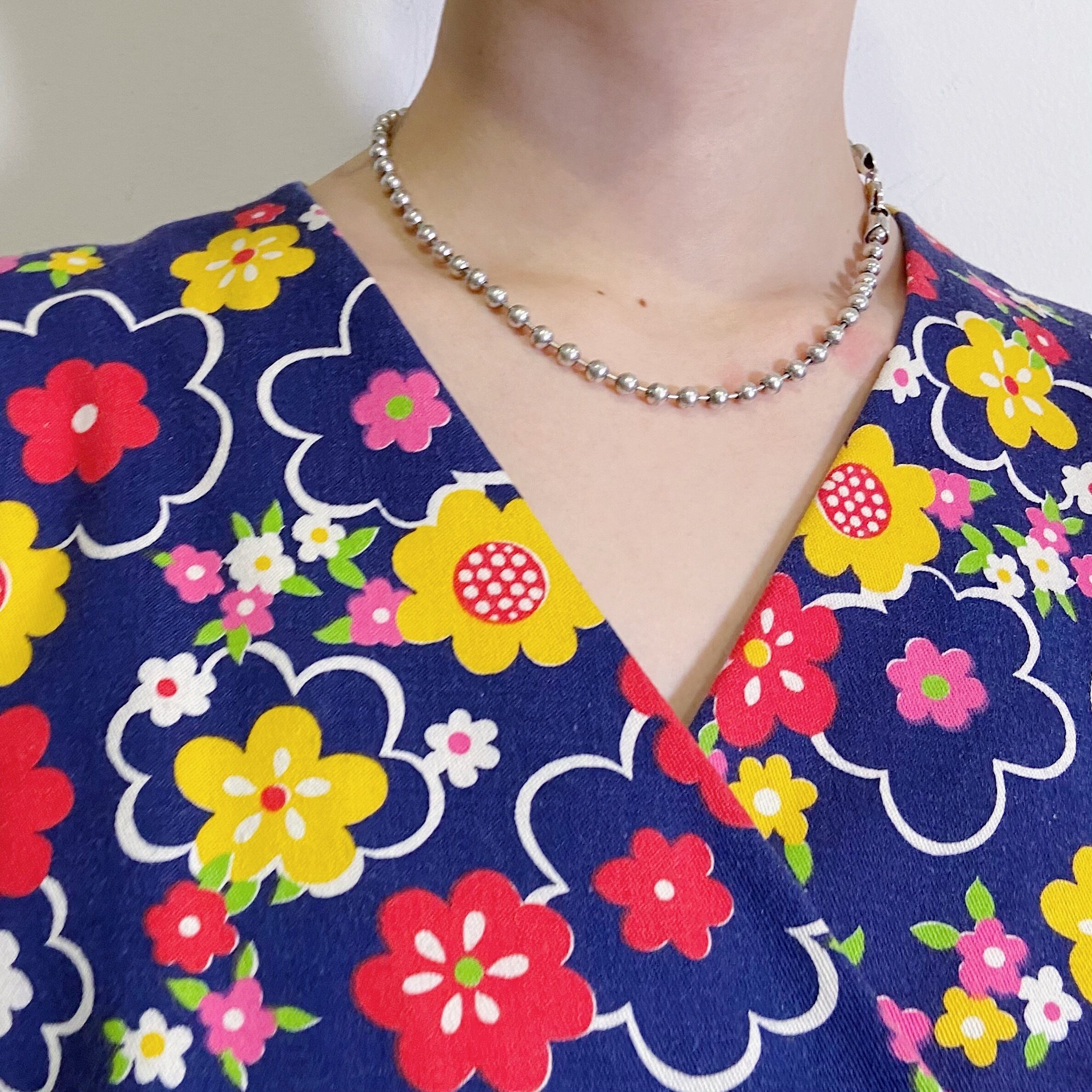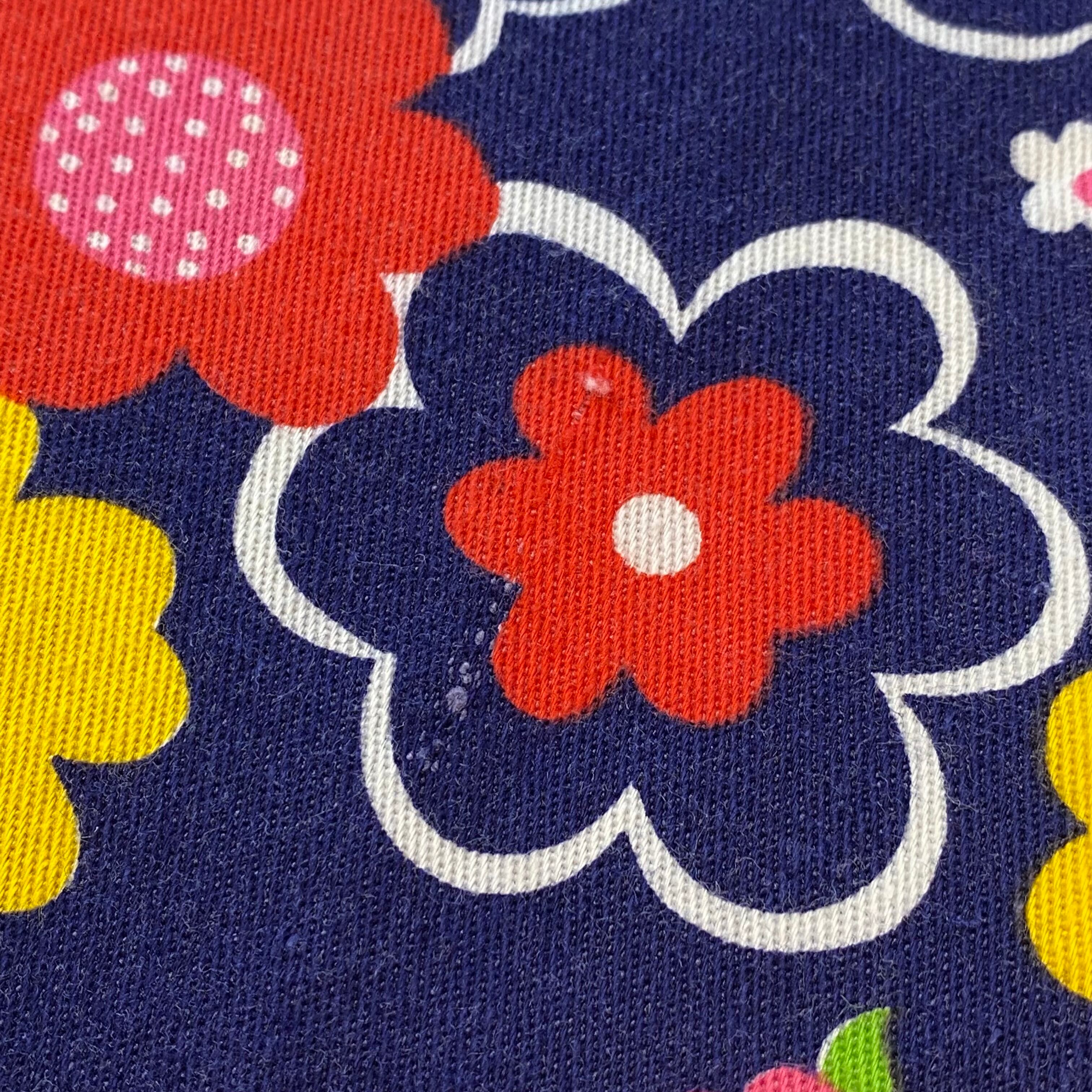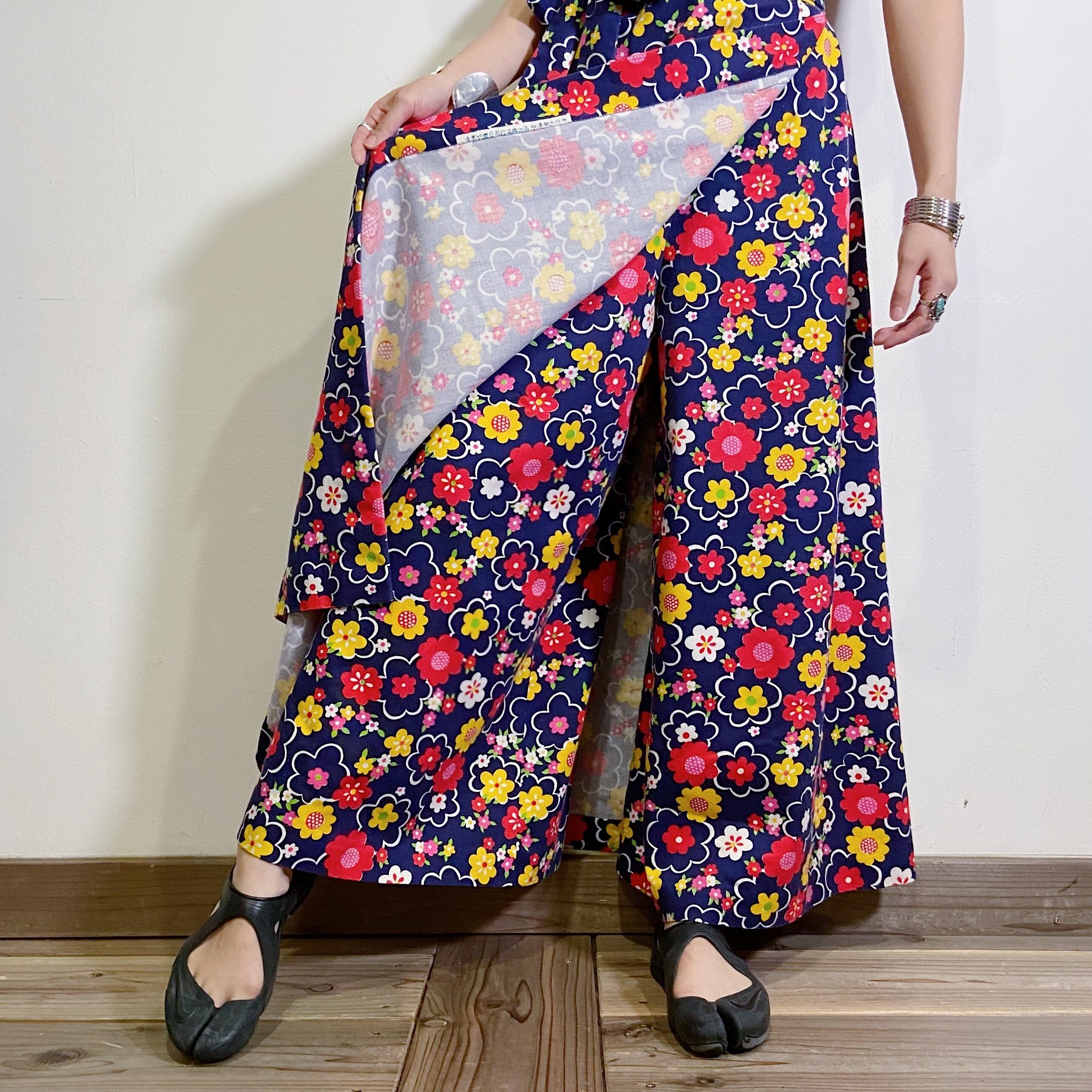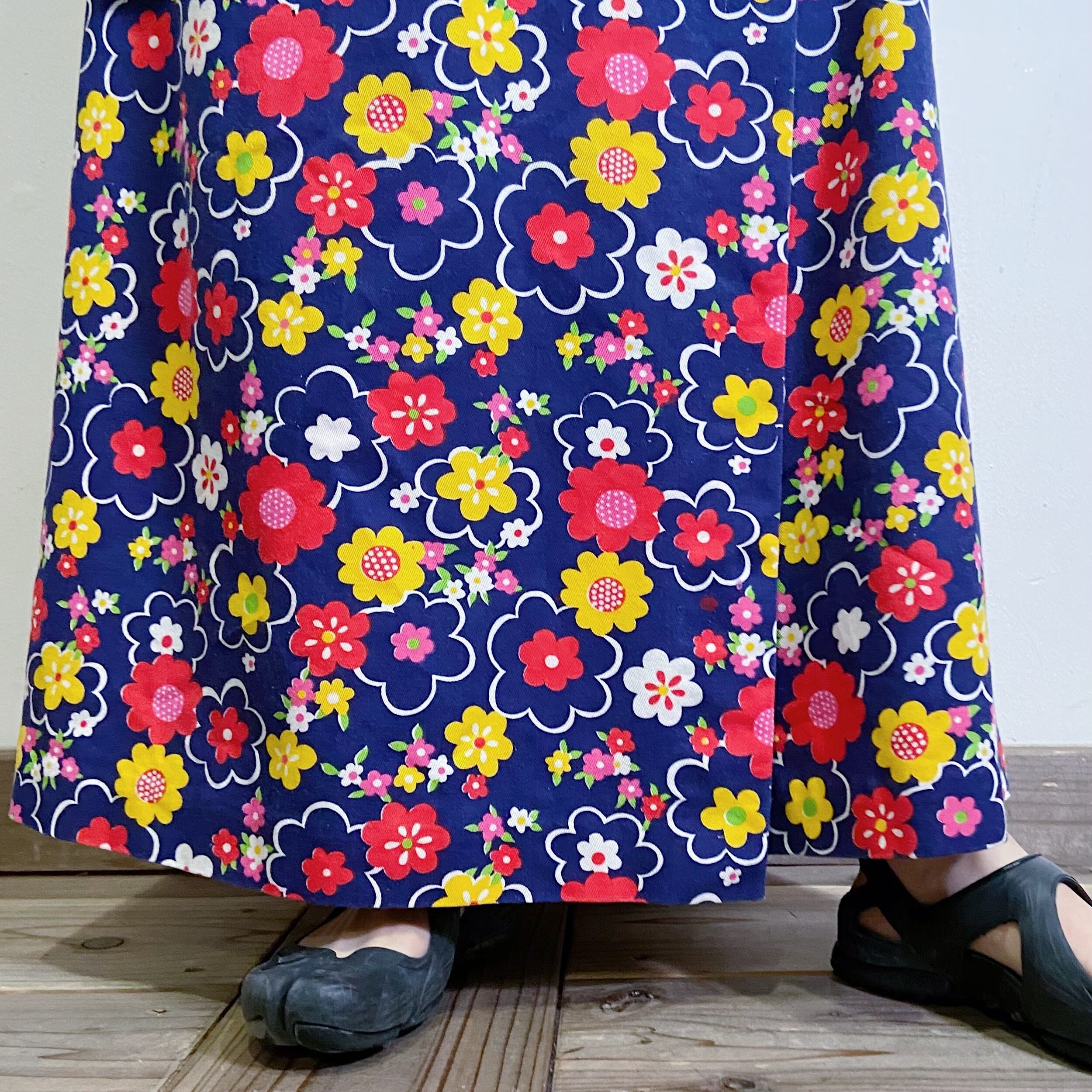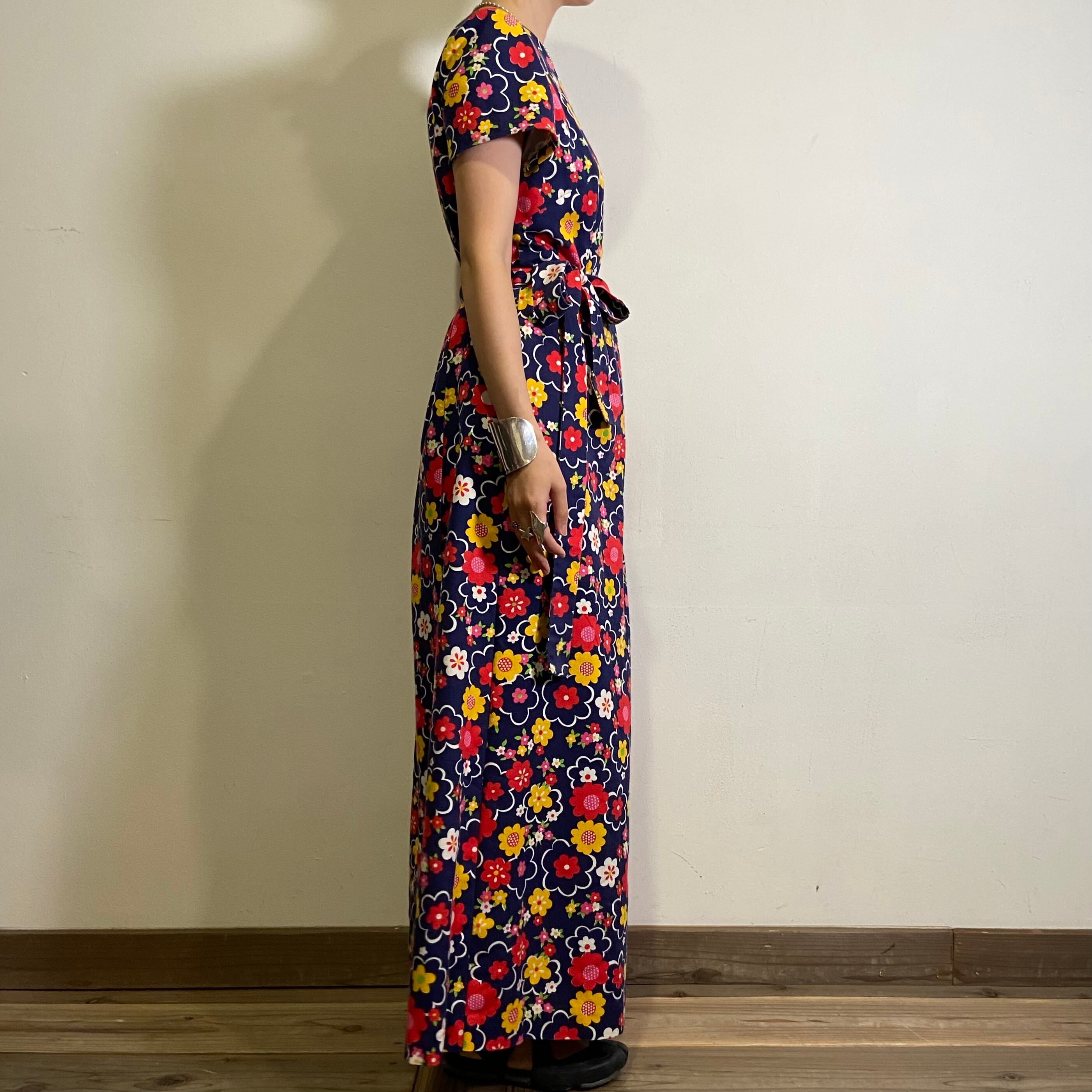 ネイビーベースに赤や黄色のポップな花柄が可愛い、70年代のジャンプスーツです。