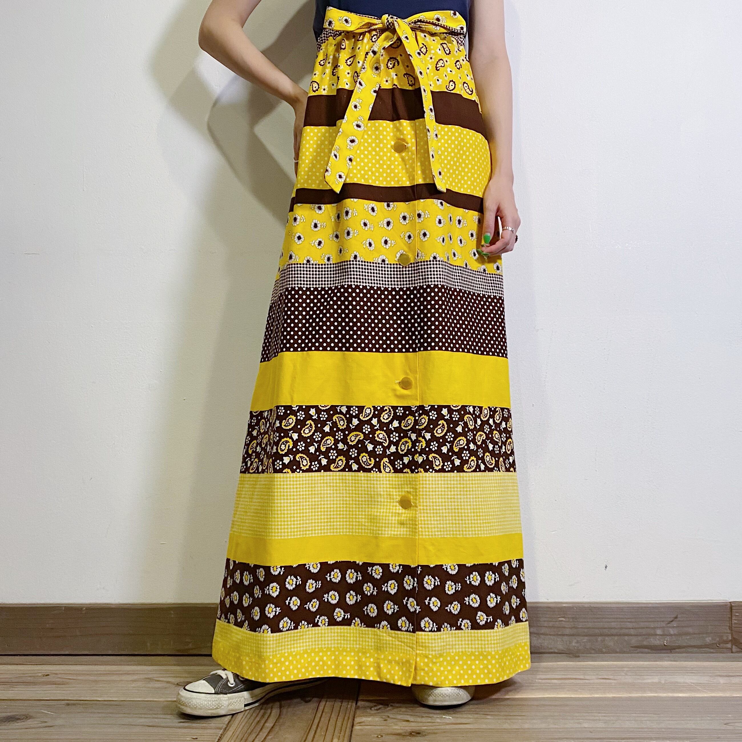 お花やペイズリー・ドットやギンガムチェックなど、可愛い柄が段になった70年代のロングスカートです。