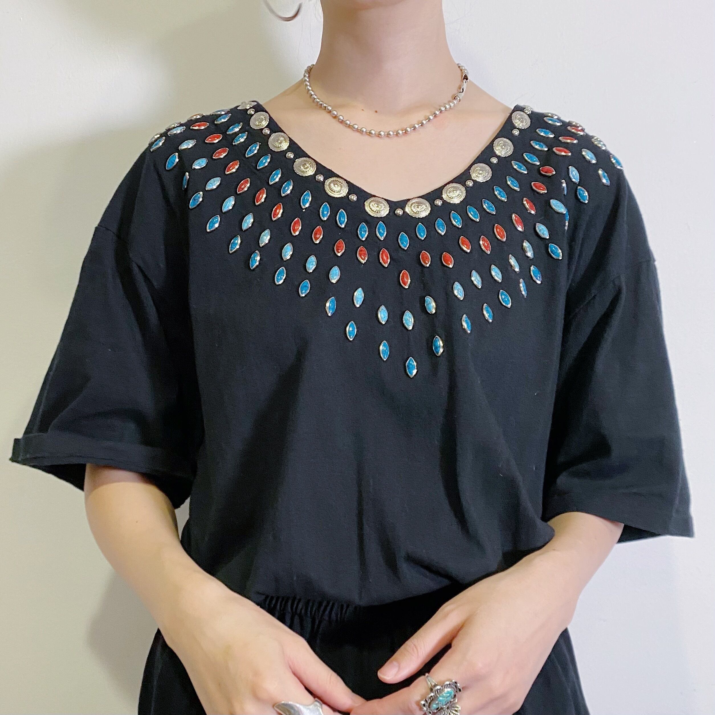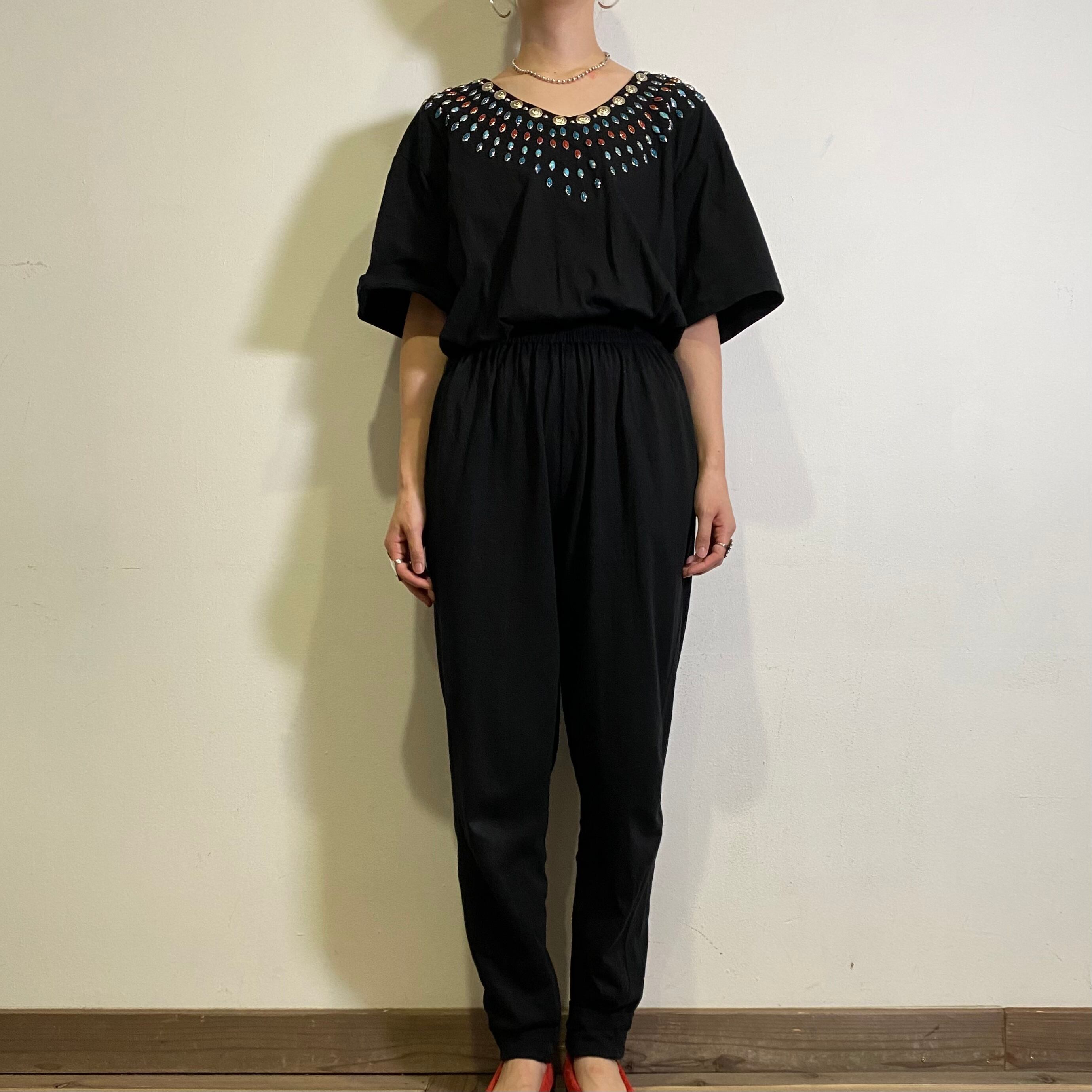 フロントにびっしり並んだブルーやレッドのスタッズ、そしてコンチョデザインが可愛い80年代のジャンプスーツです。
